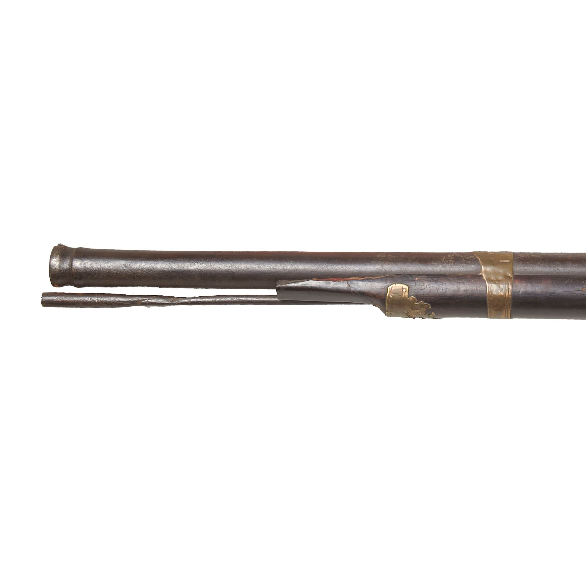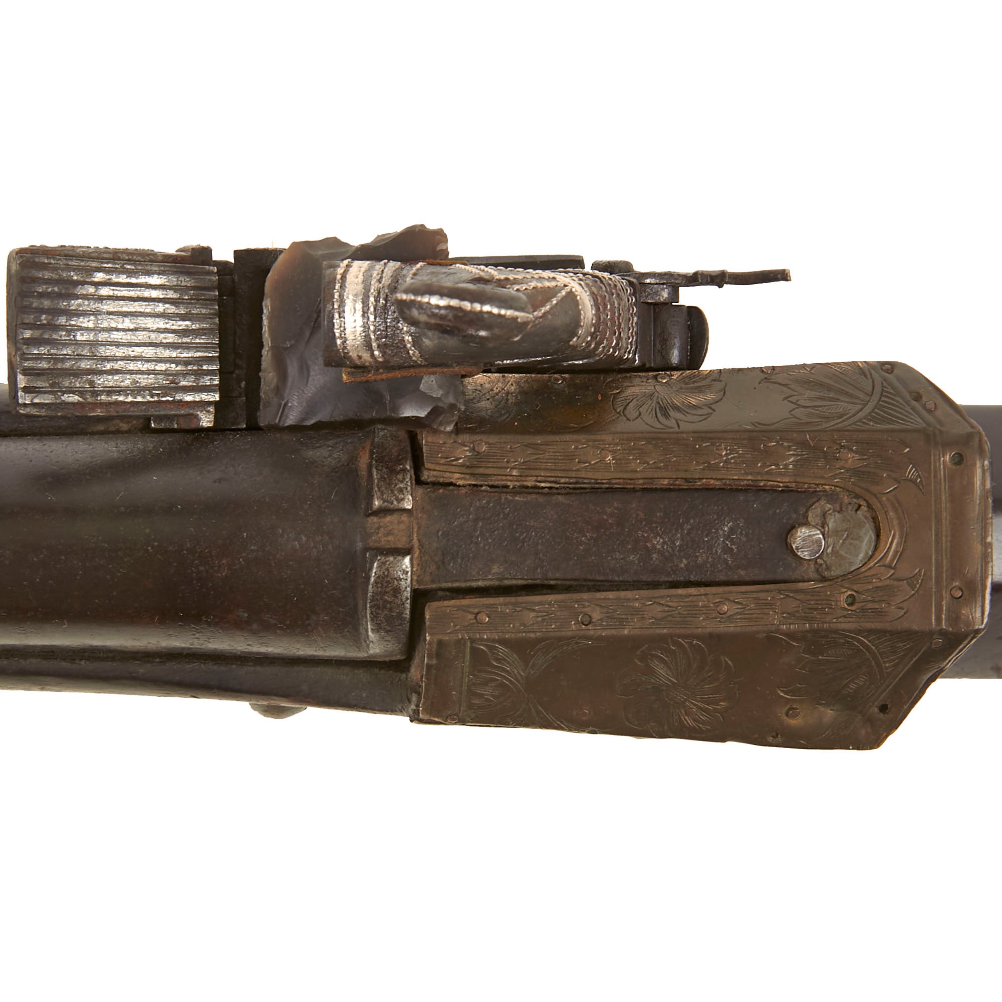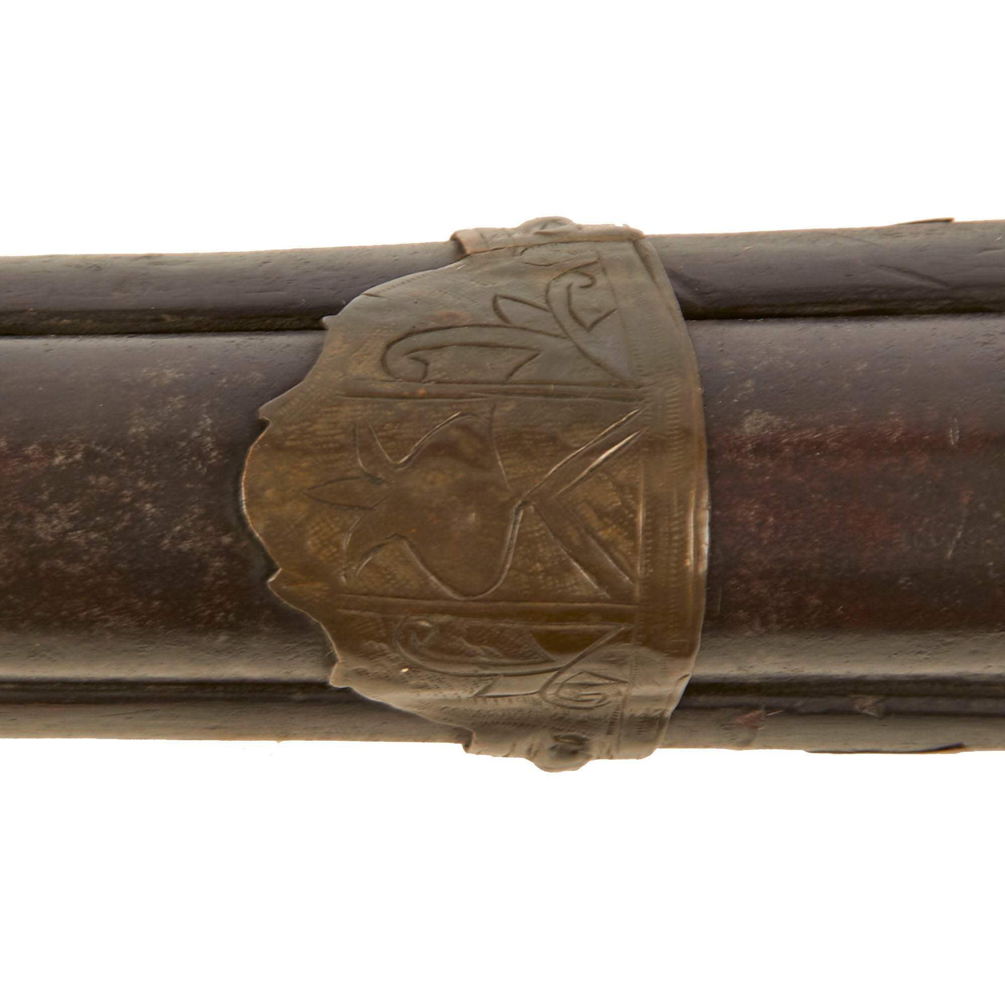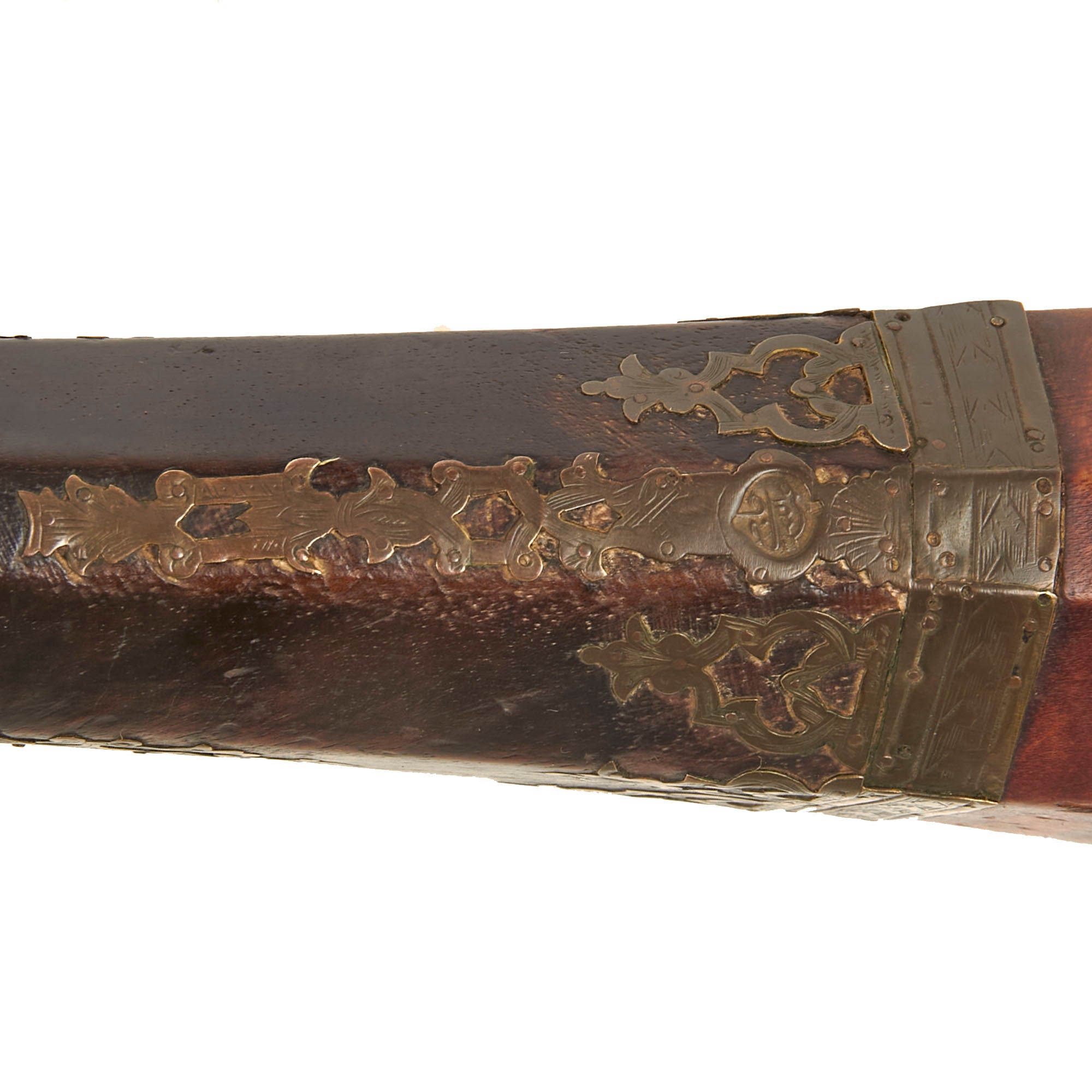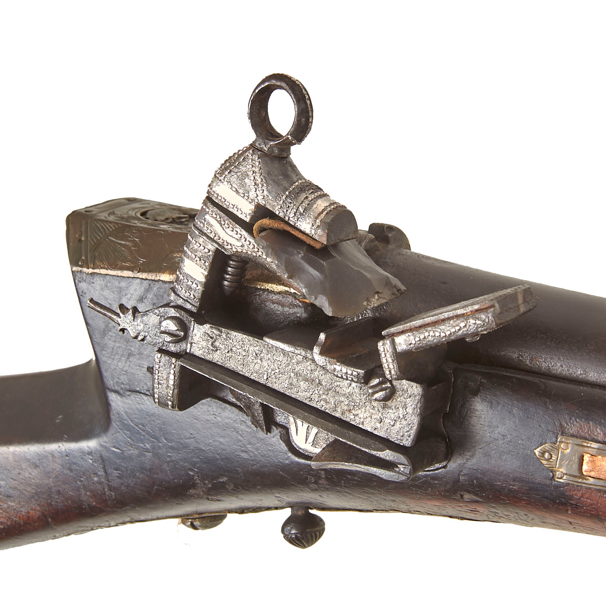 Here we offer a Classic, high quality, Ottoman Miquelet Musket known as a "SHISHANA" dating probably to the late 18th century. It features a 41"smothbore barrel with a bore approximately 0.73" in diameter, and is held in place with highly decorative embossed sheet brass bands. We also see what look to be two solid copper barrel wedges to help the heavy barrel stay in place. The wooden stock has additional embossed sheet brass fittings, as well as cladding on the top of the characteristic fitting around the barrel tang.