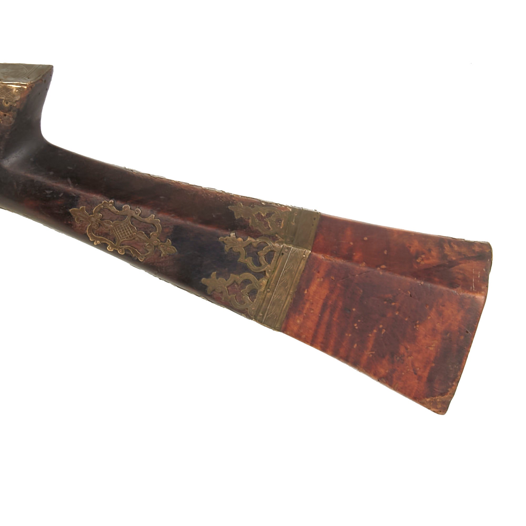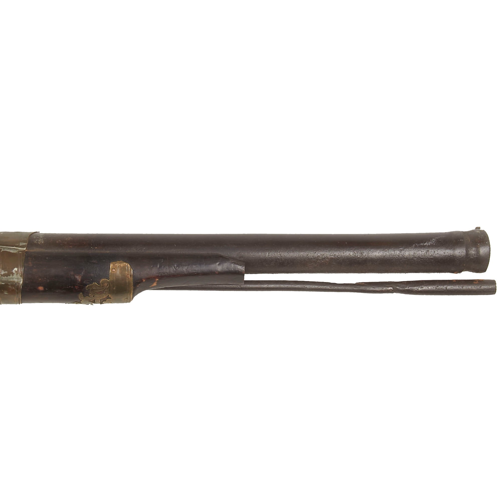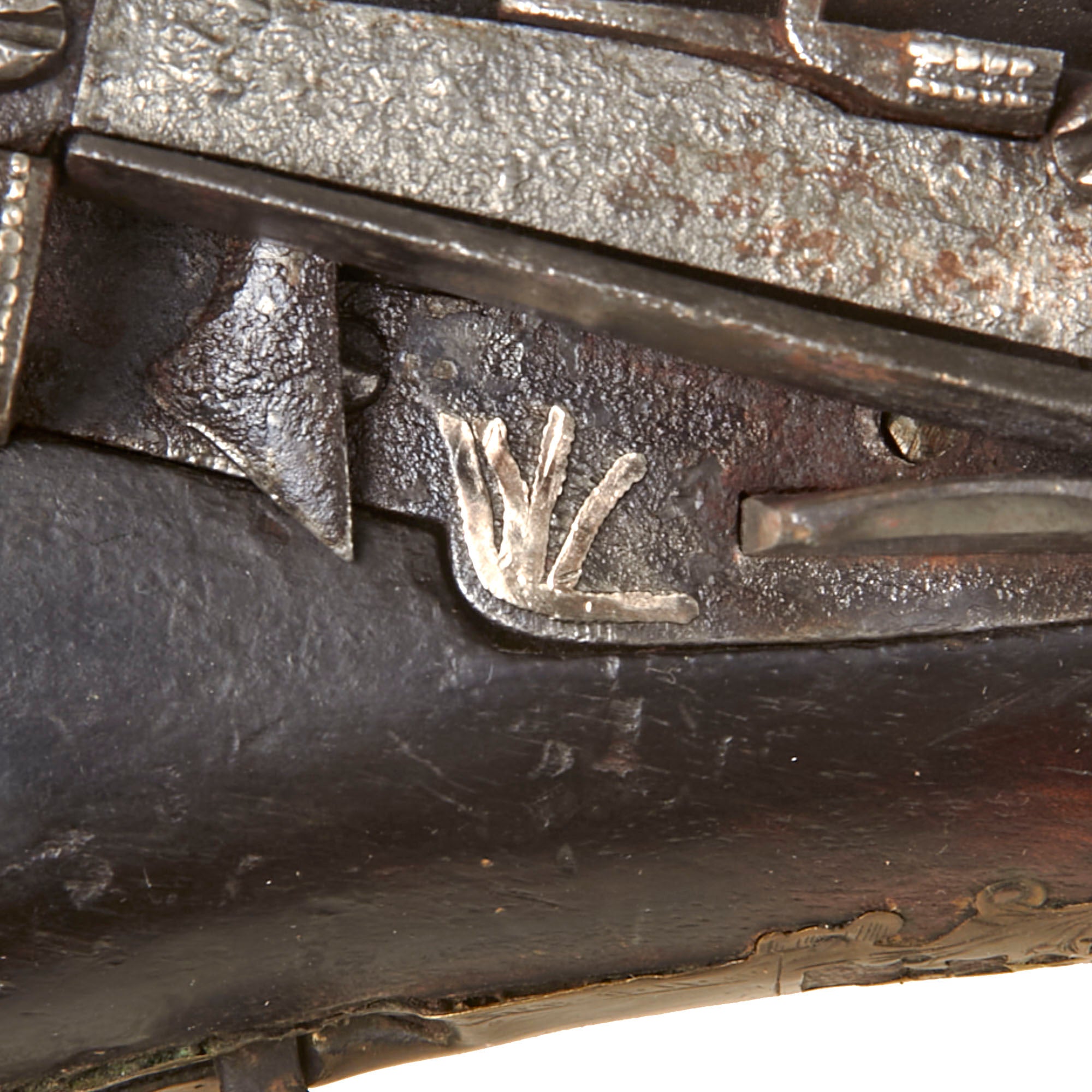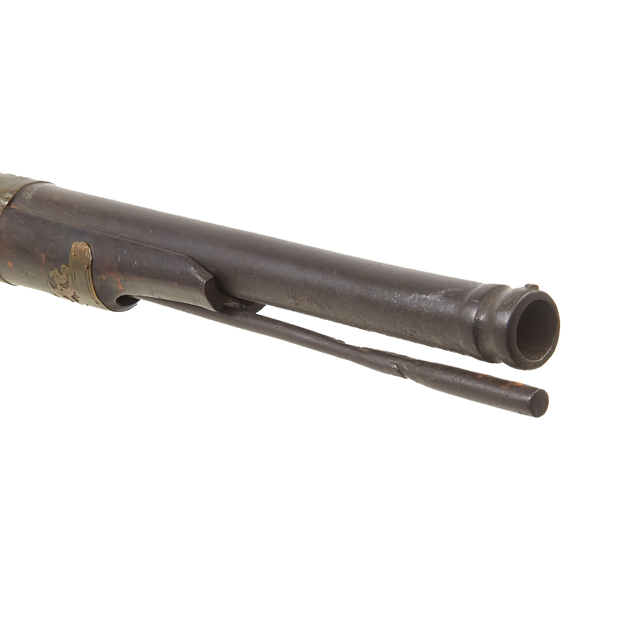 Here we offer a Classic, high quality, Ottoman Miquelet Musket known as a "SHISHANA" dating probably to the late 18th century. It features a 41"smothbore barrel with a bore approximately 0.73" in diameter, and is held in place with highly decorative embossed sheet brass bands. We also see what look to be two solid copper barrel wedges to help the heavy barrel stay in place. The wooden stock has additional embossed sheet brass fittings, as well as cladding on the top of the characteristic fitting around the barrel tang.