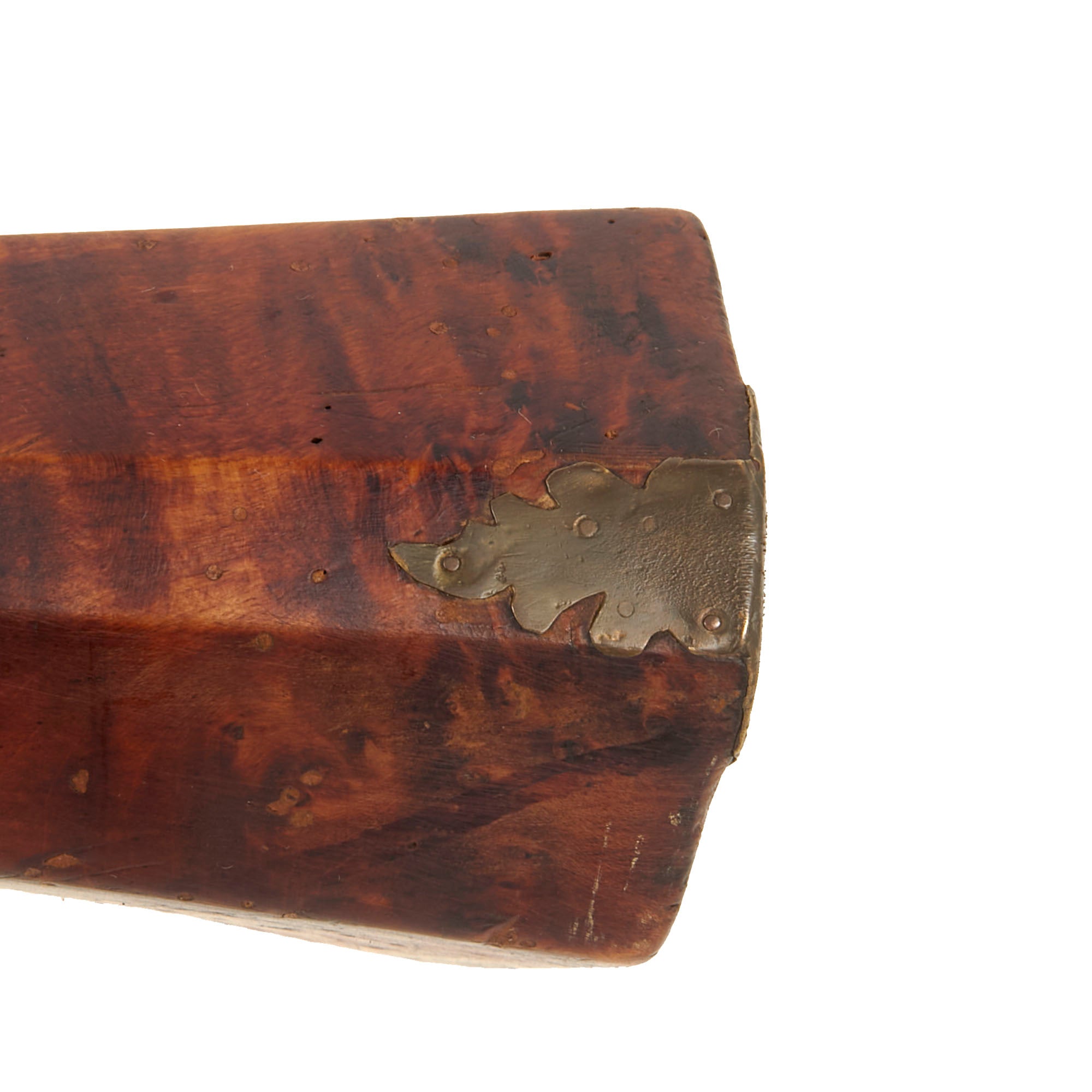 The butt end is classically "five sided", and in this case the last 4 inches are a separate piece, which in this case is made from "burl" highly figured wood. We are not sure what species was typically used, but it is definitely lighter in color than the rest of the stock, and really looks great, with all types of figuring artifacts present.