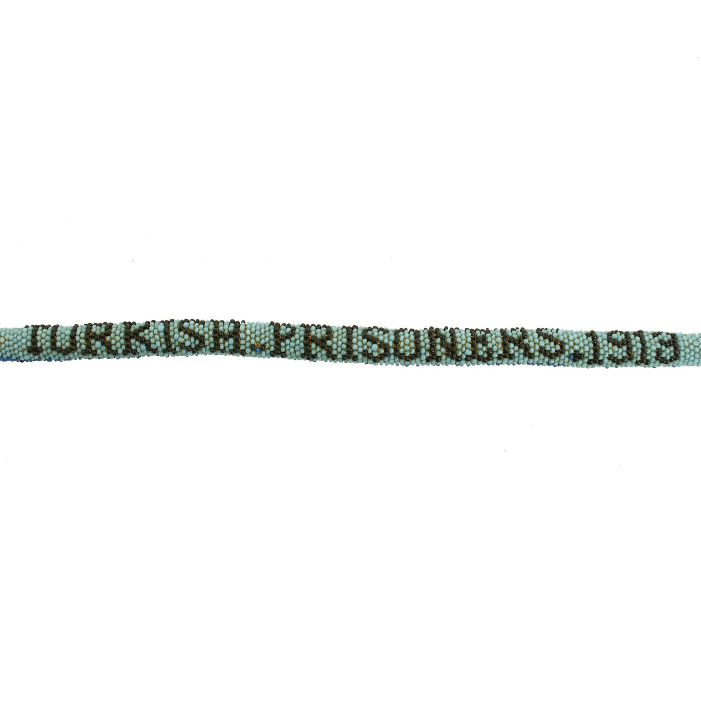 With blue beads spelling out: TURKISH PRISONERS 1913, this piece was made by the beaded crochet method or weaving on small looms. Crochet beaded snakes were the most popular of the beaded souvenirs created in the prisoner of war camps at the time. This is probably for two reasons, firstly a snake is basically a tube, a very easy shape to make with bead crochet. Secondly, snakes were a symbol of good luck in parts of South East Europe, so the prisoner of war snakes could have had a symbolic importance for their makers.