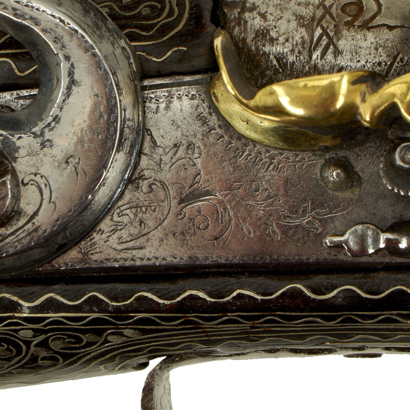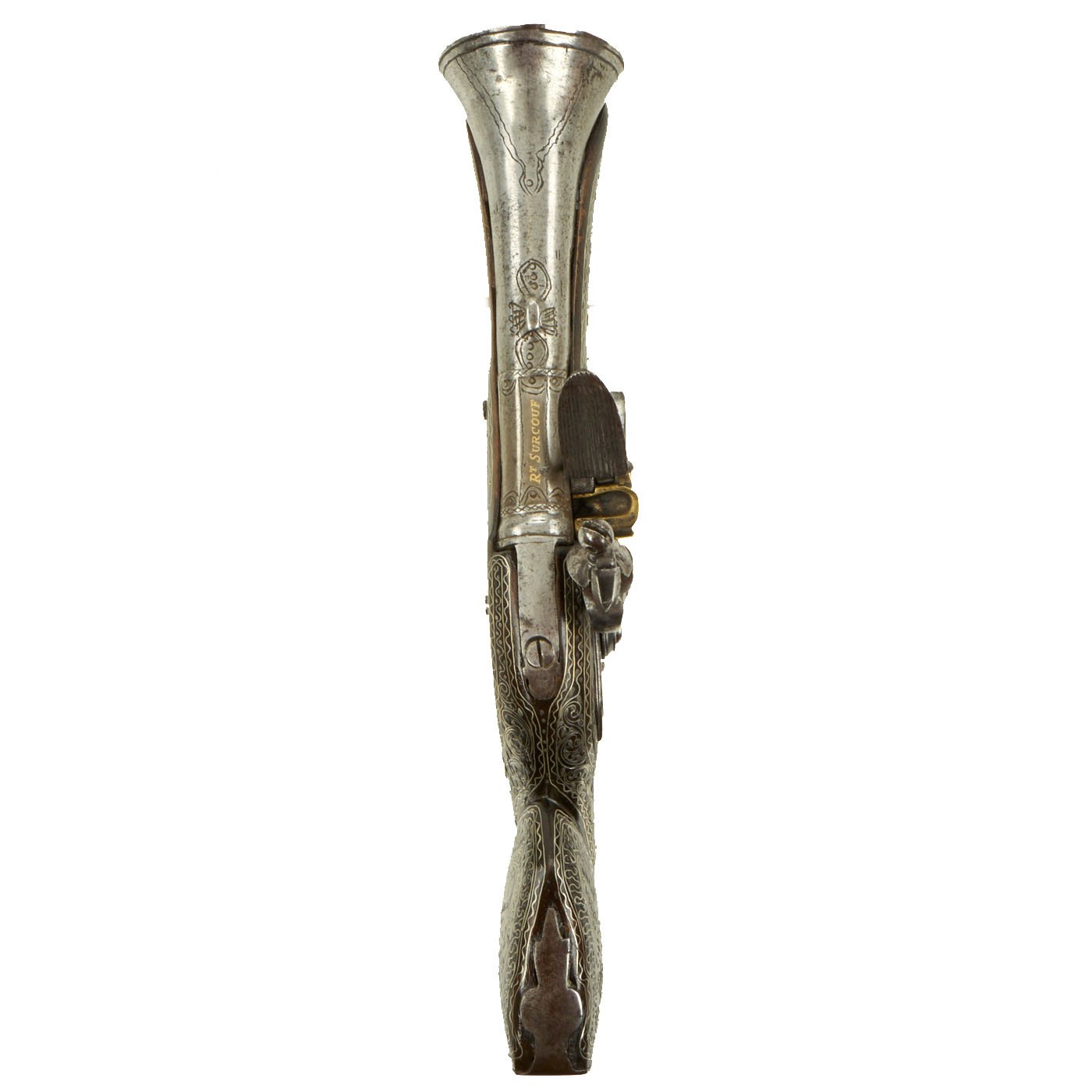 We rather suppose this truly lovely ottoman flintlock blunderbuss pistol was a "prize" Surcouf had taken at sea, and had his name put on it as a personal trophy.