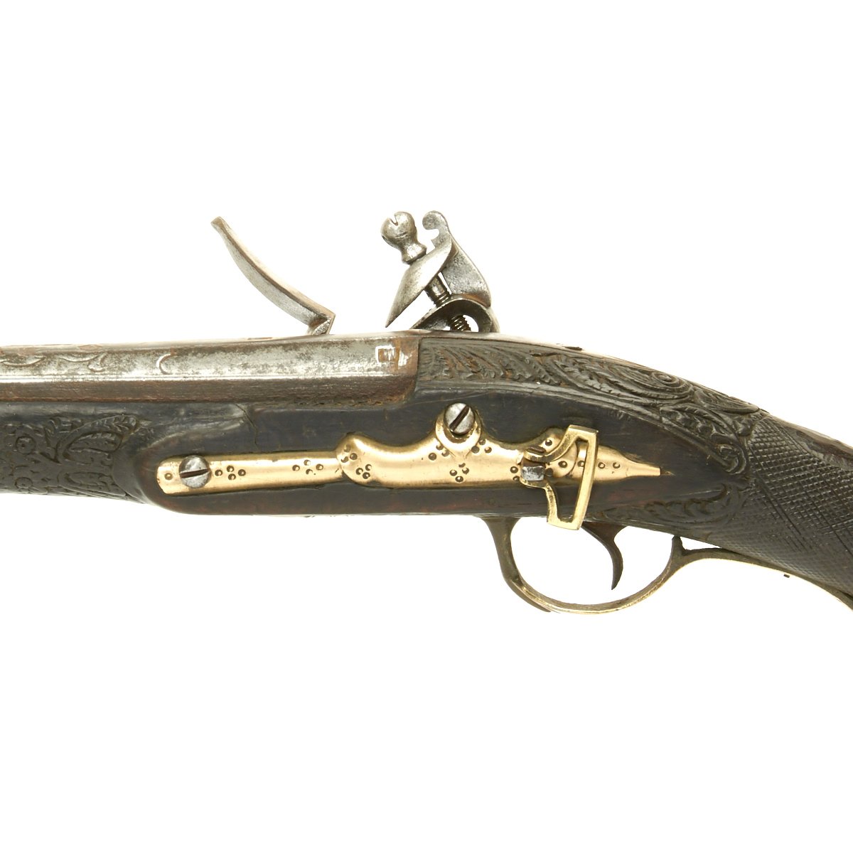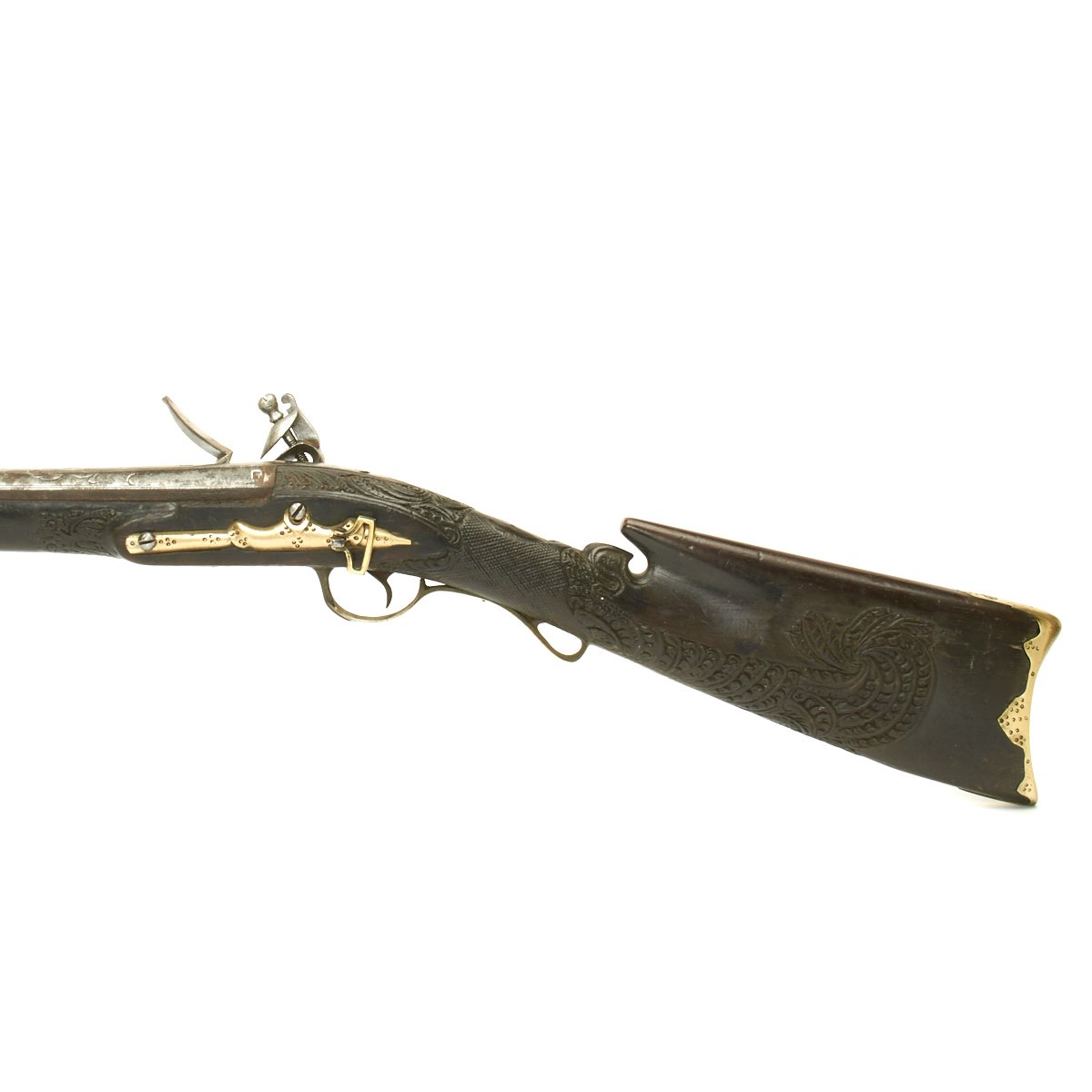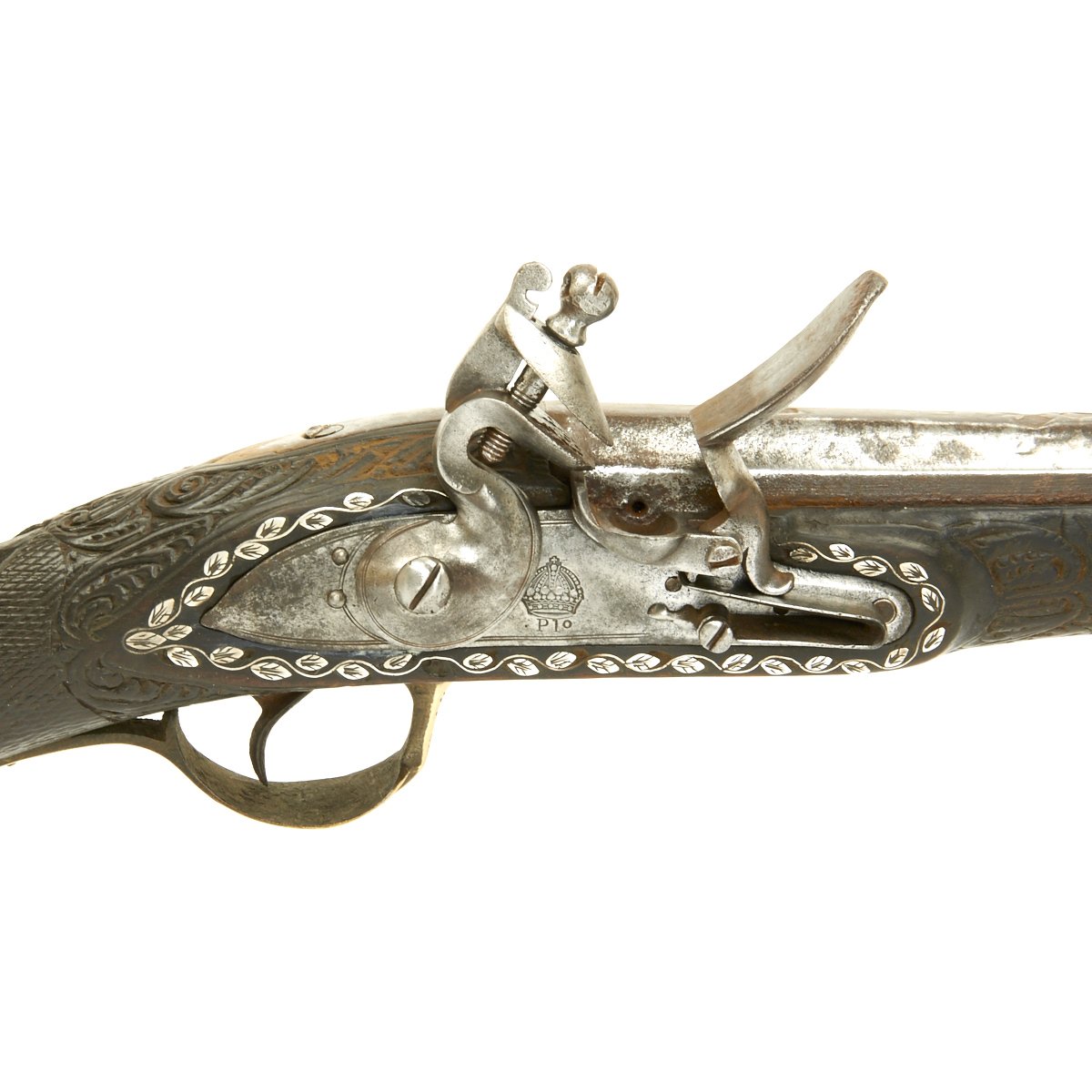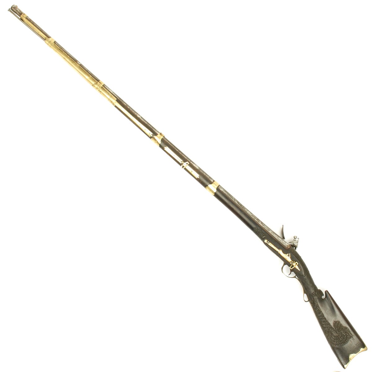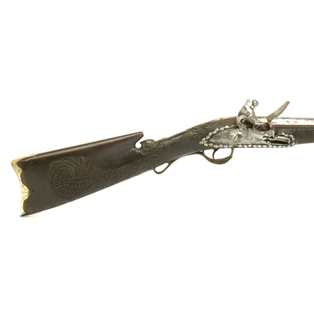 The long arm is almost full stocked in a dark hard wood. The butt, wrist and action area heavily carved with decoration. The mounts are all decorated and there is a most impressive "garland of Laurel Leaves" all around the lock opening in SILVER. One piece of the brass inlay missing from fore end, which could easily be replaced. Barrel with faux Armorer's cartouches measures 57" and the Musket is 73" in overall length. Very impressive and ready to display.