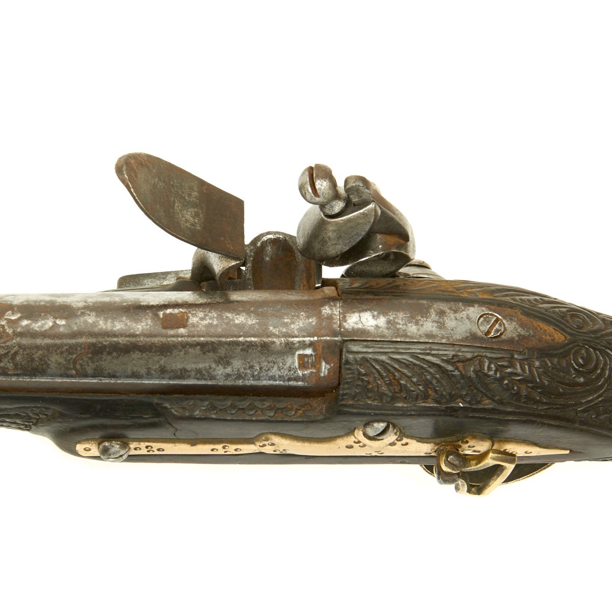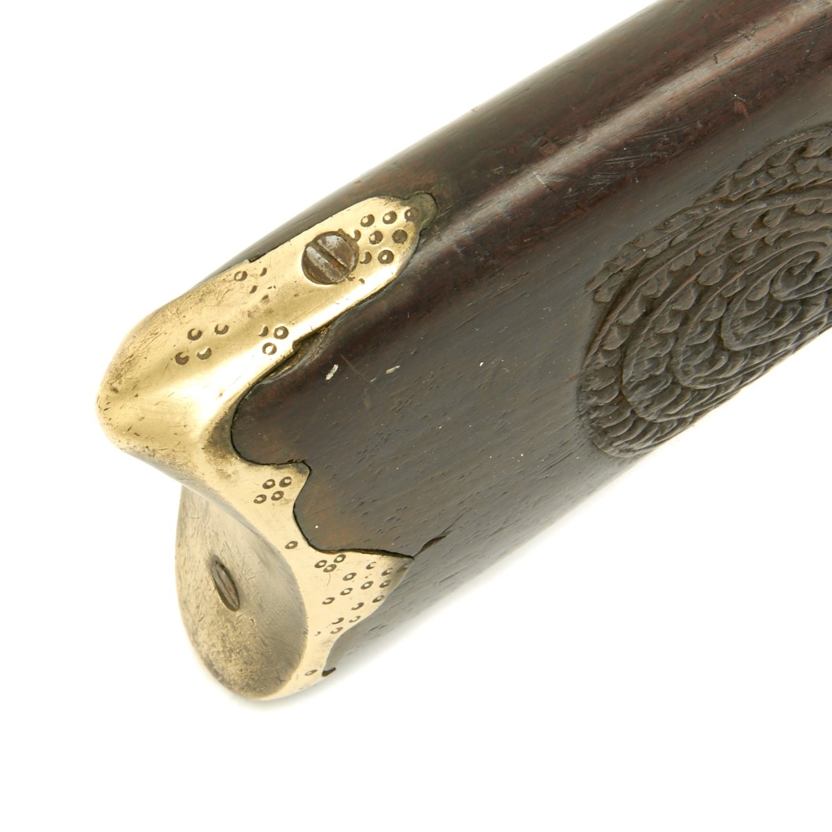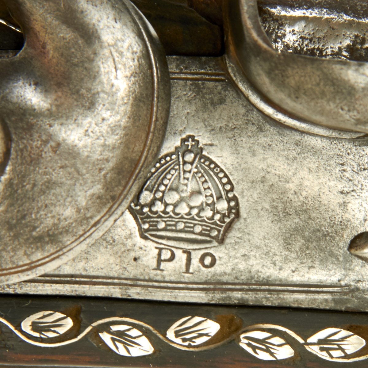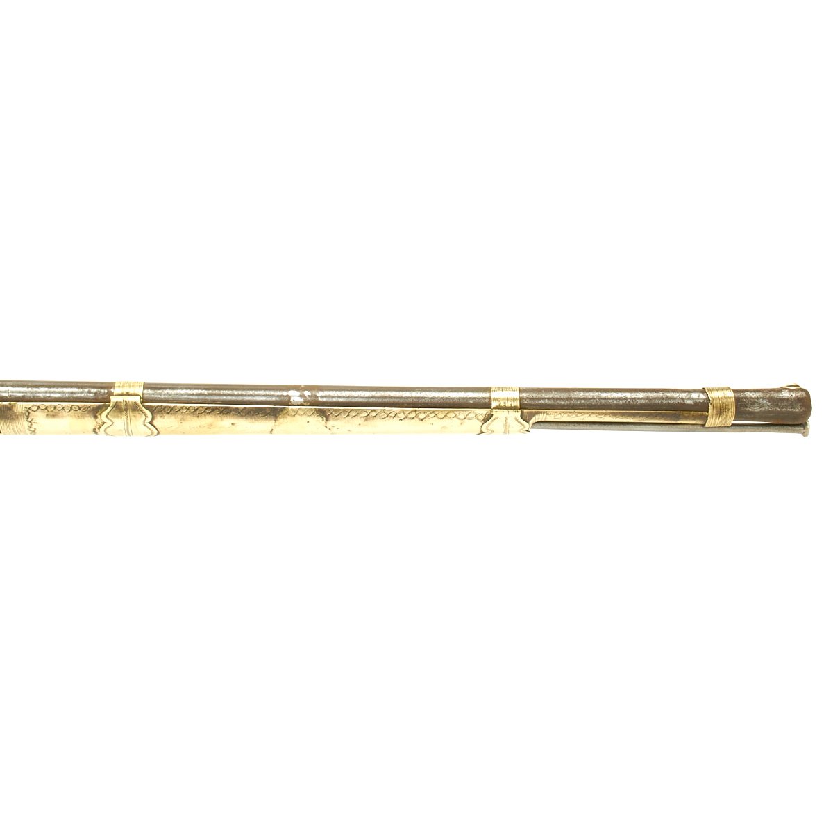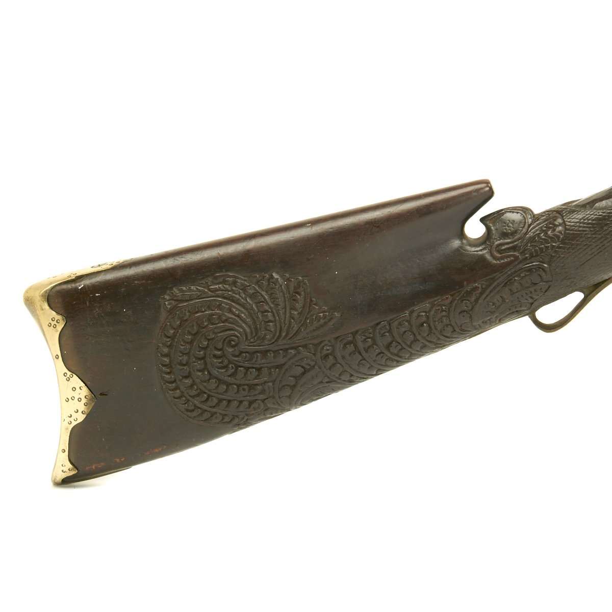 The long arm is almost full stocked in a dark hard wood. The butt, wrist and action area heavily carved with decoration. The mounts are all decorated and there is a most impressive "garland of Laurel Leaves" all around the lock opening in SILVER. One piece of the brass inlay missing from fore end, which could easily be replaced. Barrel with faux Armorer's cartouches measures 57" and the Musket is 73" in overall length. Very impressive and ready to display.