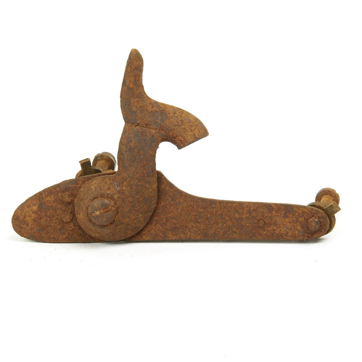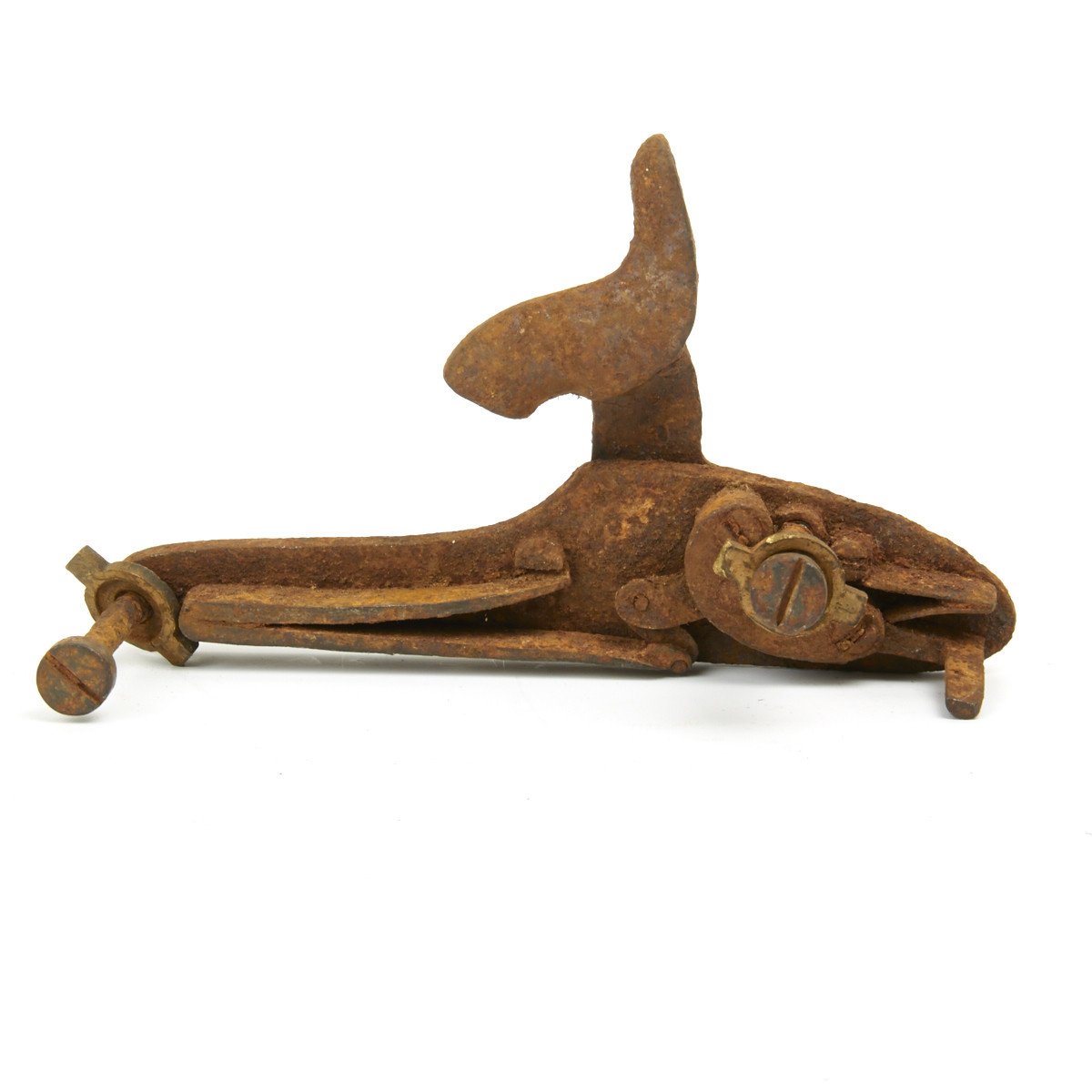 These P1853 locks come complete with integral parts and side screws. Integral lock parts include: Lock plate, Hammer, Hammer Screw, Tumbler, Sear, Sear Spring, Bridle, Link, and Mainspring. They have been inspected to make sure all integral parts are present but the function is unknown due to rust and storage seizure. Each lock is handmade, it will require fitting into any stock or barrel configuration. While we do supply the original side screws, the screws could be stripped, detached, slightly bent, or if connected, will most certainly be stuck in place after over 150 years in storage. The brass escutcheons may or may not be present. We refer to these as grade 1B because they are quite dirty/rusty, but solid, and should be able to be restored with some work and oil.
