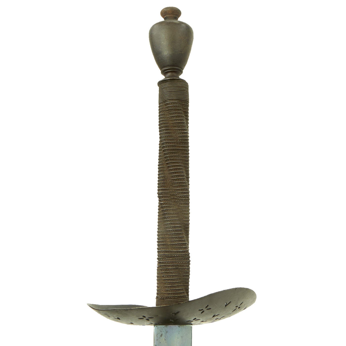 The blades on these are very attractive, and are in fact a design popular in the 17th century, known as a colichemarde. In this style, the blade features a wide forte, which abruptly tapers to a much narrower form at a point varying between a fifth to a third of the blade length from the hilt. The blade cross section was most often triangular and hollow-ground.