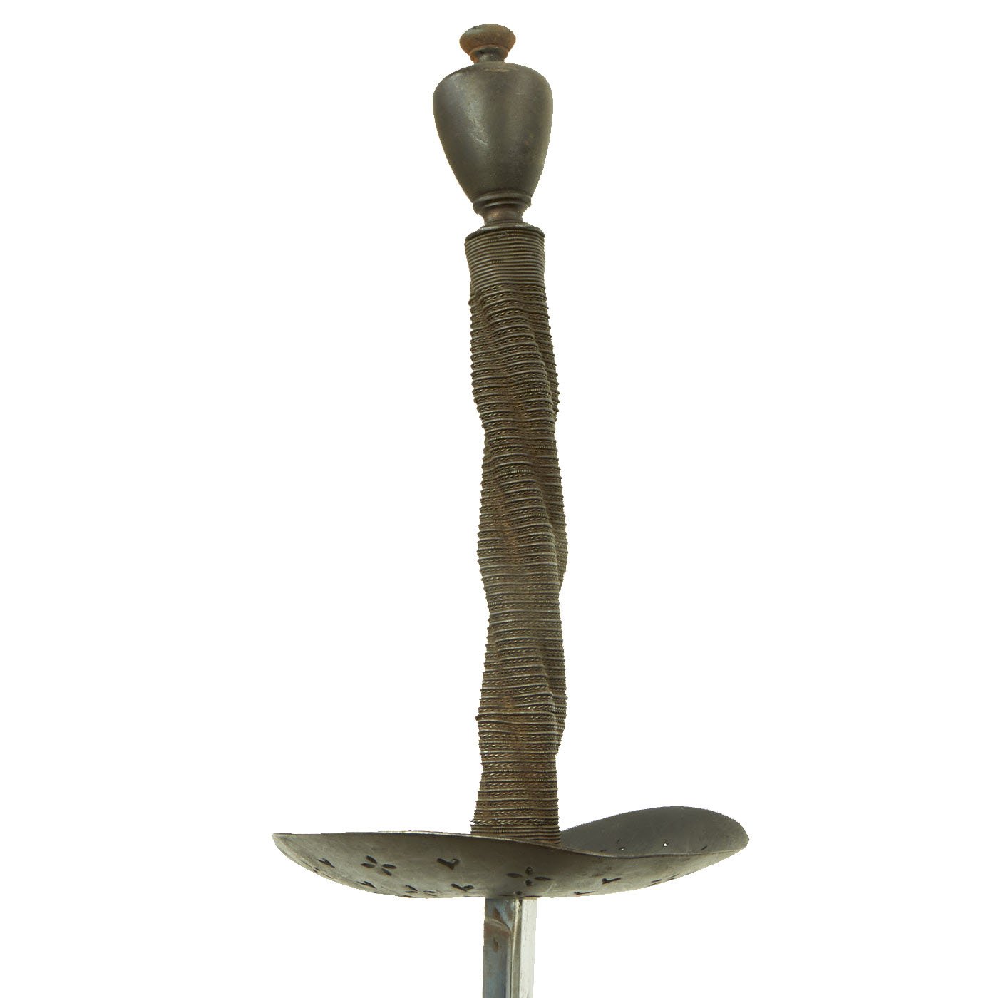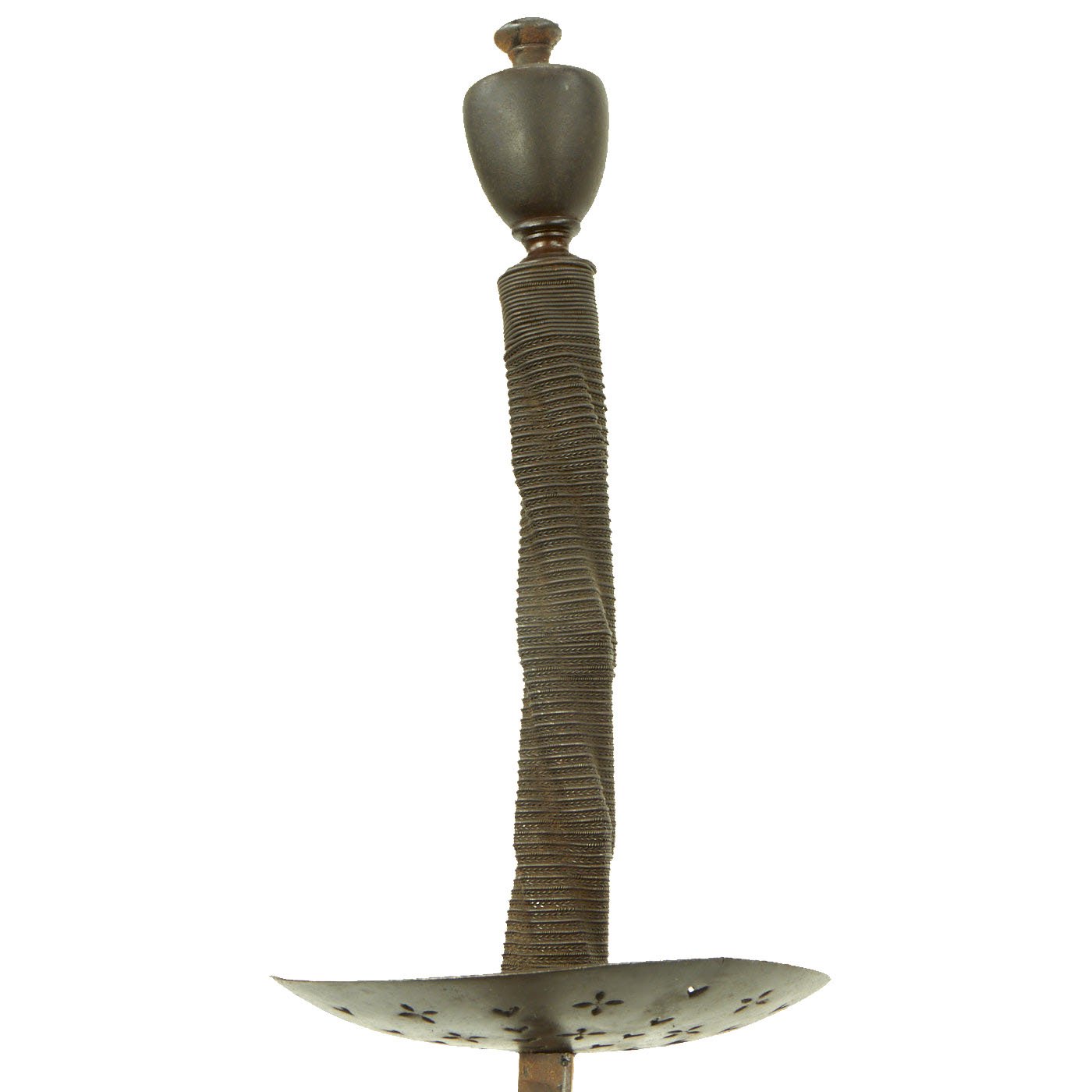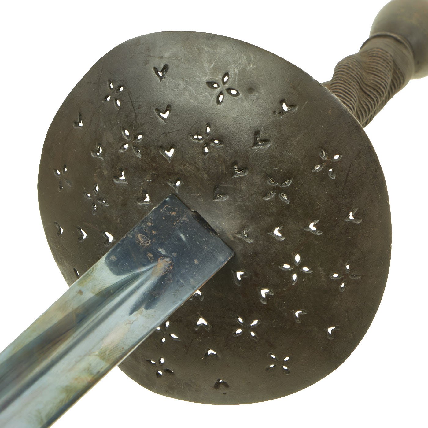 This is a very nice set of later 19th Century Épée Short Swords for Fencing and Dueling, probably from the era of Napoleon III. They are 42 inches in overall length, with very comfortable grips, probably made from 4 pieces of twisted wood, then heavily wire strapped. They have 4 inch wide perforated guards, similar to those used with épée swords currently. The grips are still tight to the blade, however the guards are definitely loose, as the leather buffers that would have padded them have rotted away.