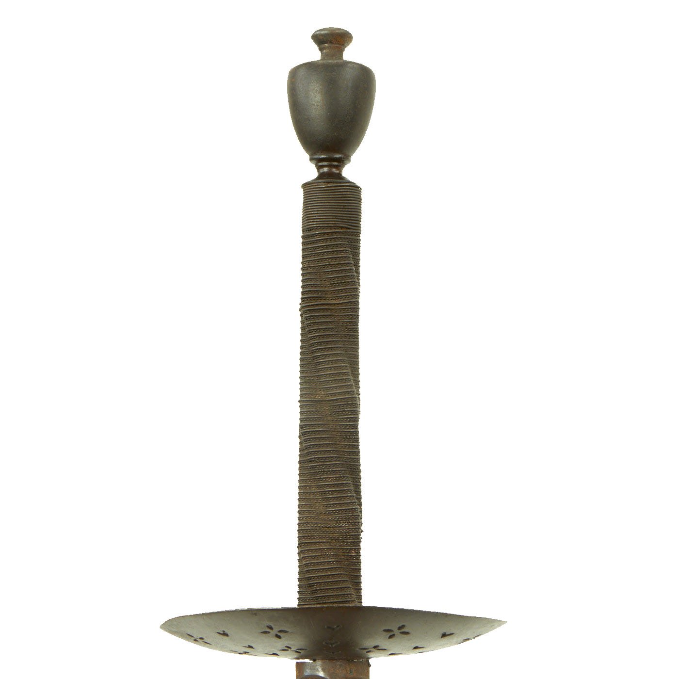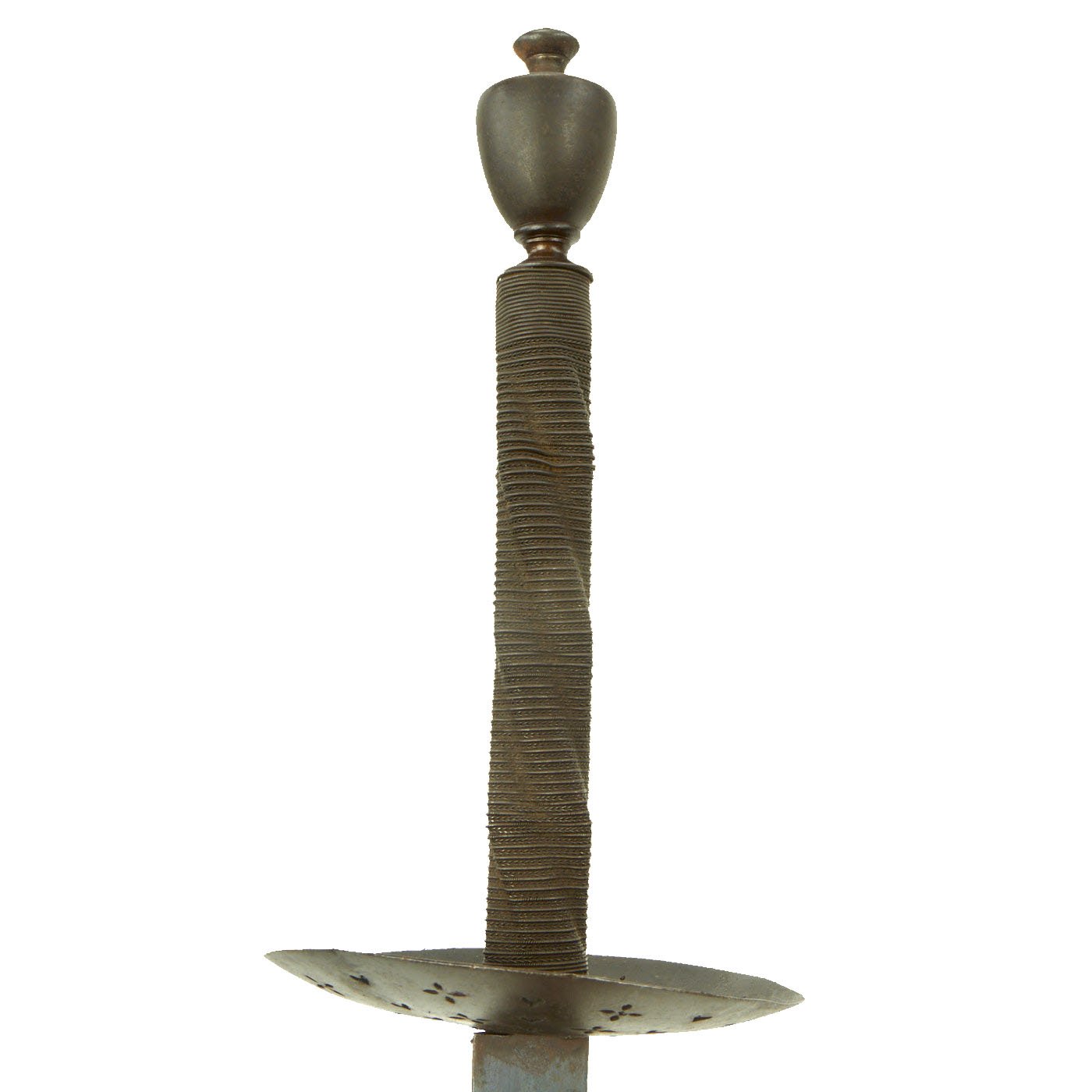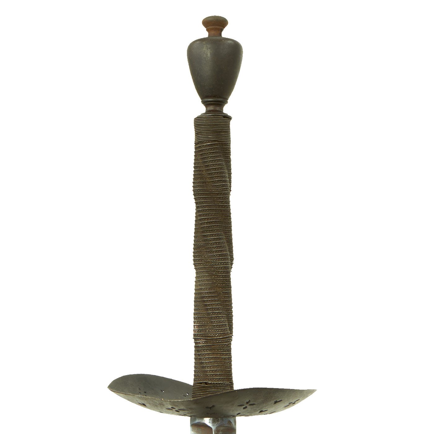 This is a very nice set of later 19th Century Épée Short Swords for Fencing and Dueling, probably from the era of Napoleon III. They are 42 inches in overall length, with very comfortable grips, probably made from 4 pieces of twisted wood, then heavily wire strapped. They have 4 inch wide perforated guards, similar to those used with épée swords currently. The grips are still tight to the blade, however the guards are definitely loose, as the leather buffers that would have padded them have rotted away.