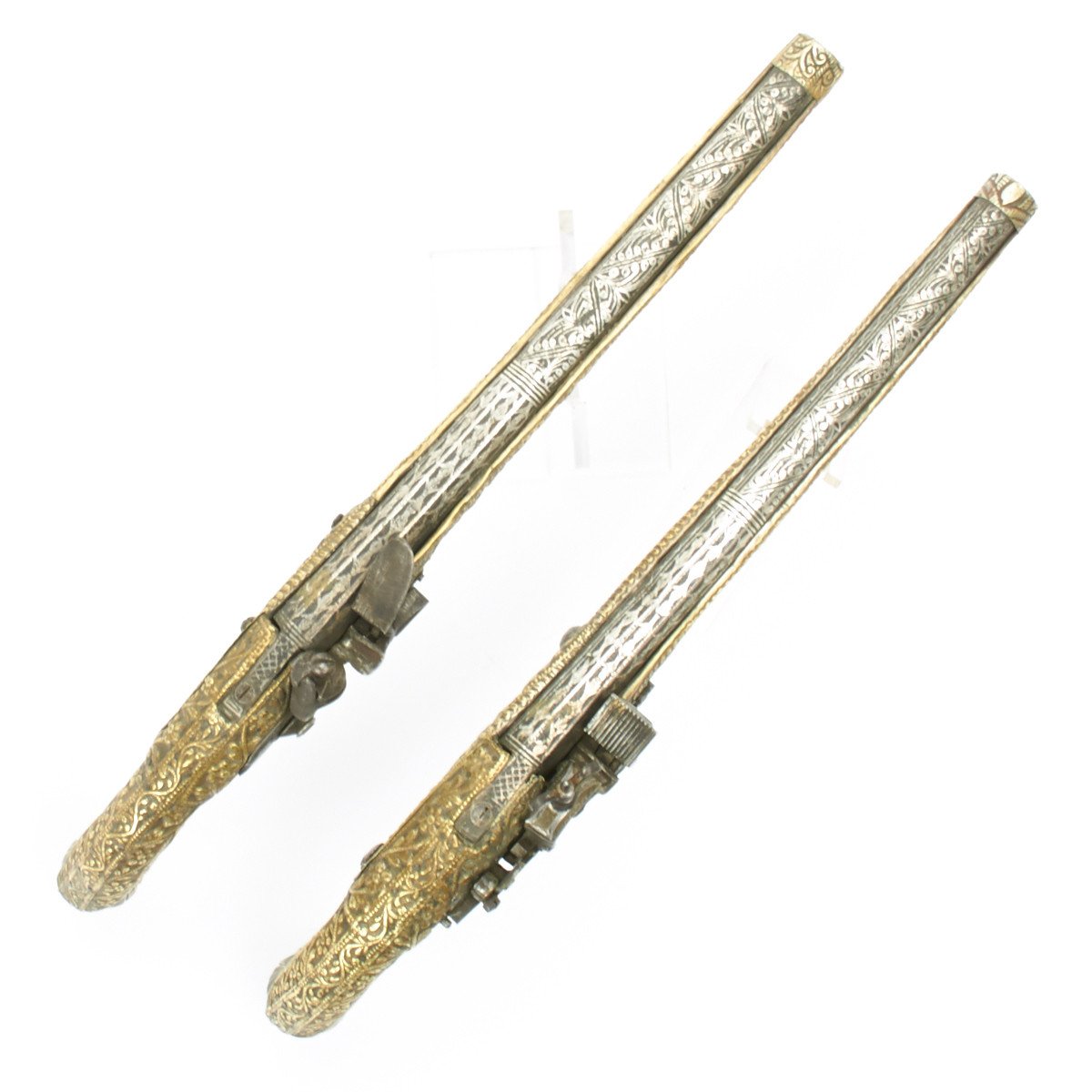 This brace of flintlock pistols are of Moroccan/Algerian origin and although every North African Bazaar has offered tourist copies for the last 200 years we feel there is reason to believe that this brace may have started life in the age of Piracy and were manufactured as weapons not souvenirs.
