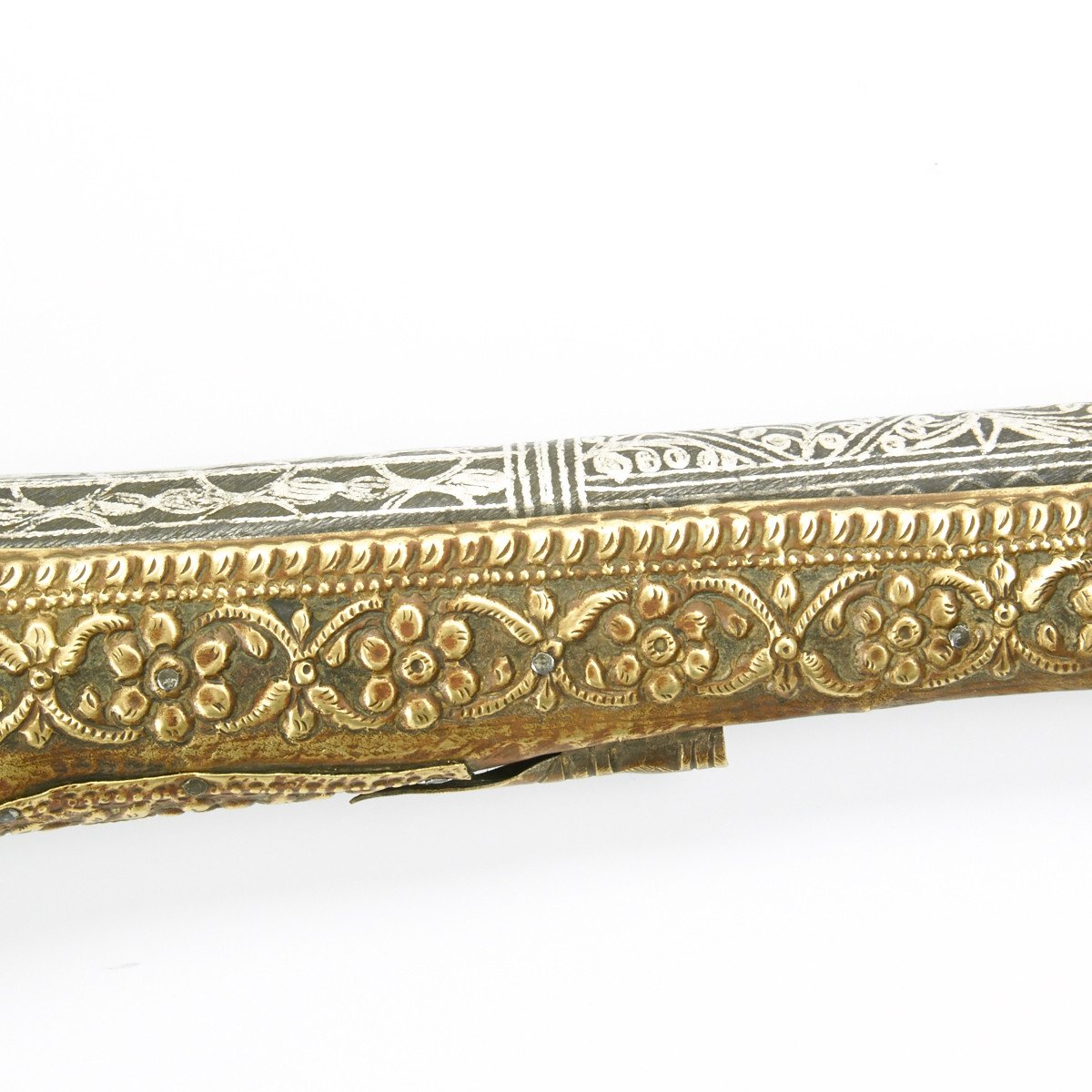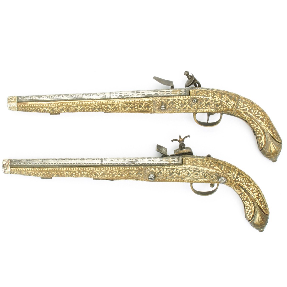 The 12.25-inch barrels are heavily decorated with silver and each pistol has a silver nose cap. Various repairs are apparent especially on one trigger guard.