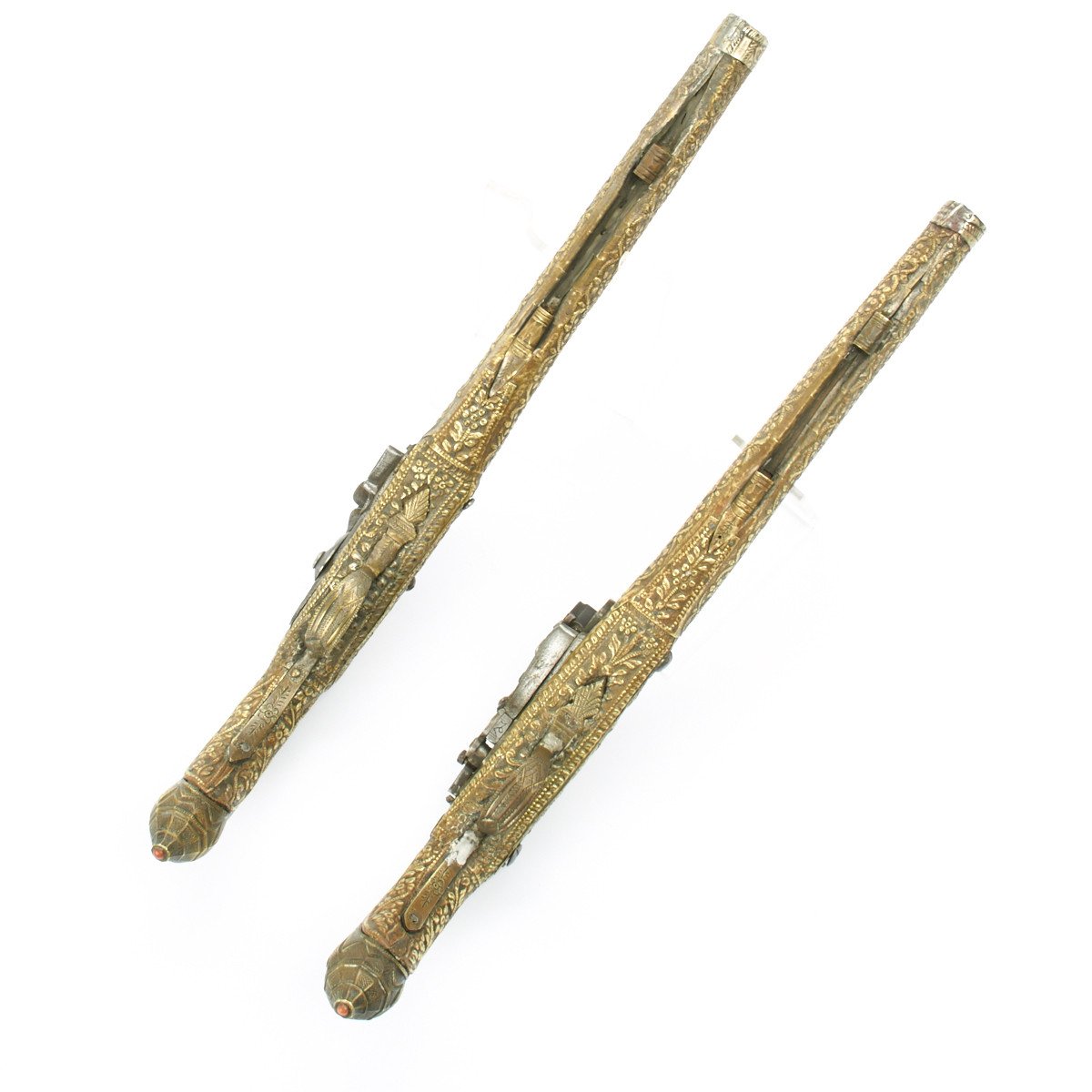 The entire wood stocks are covered in ornately embossed brass sheeting and each pistol has a substantial skull crusher brass butt cap each inlaid with a single coral stone. The pistols appear to have had European style under the barrel ramrods, which are not present but these channels are not cut for full-length ramrods to be installed.