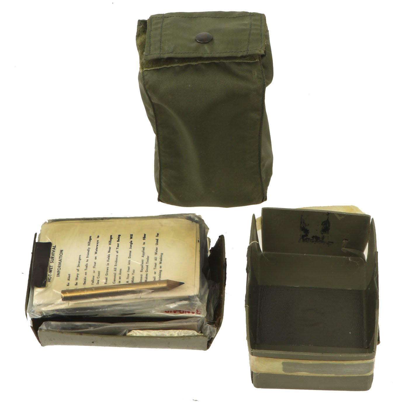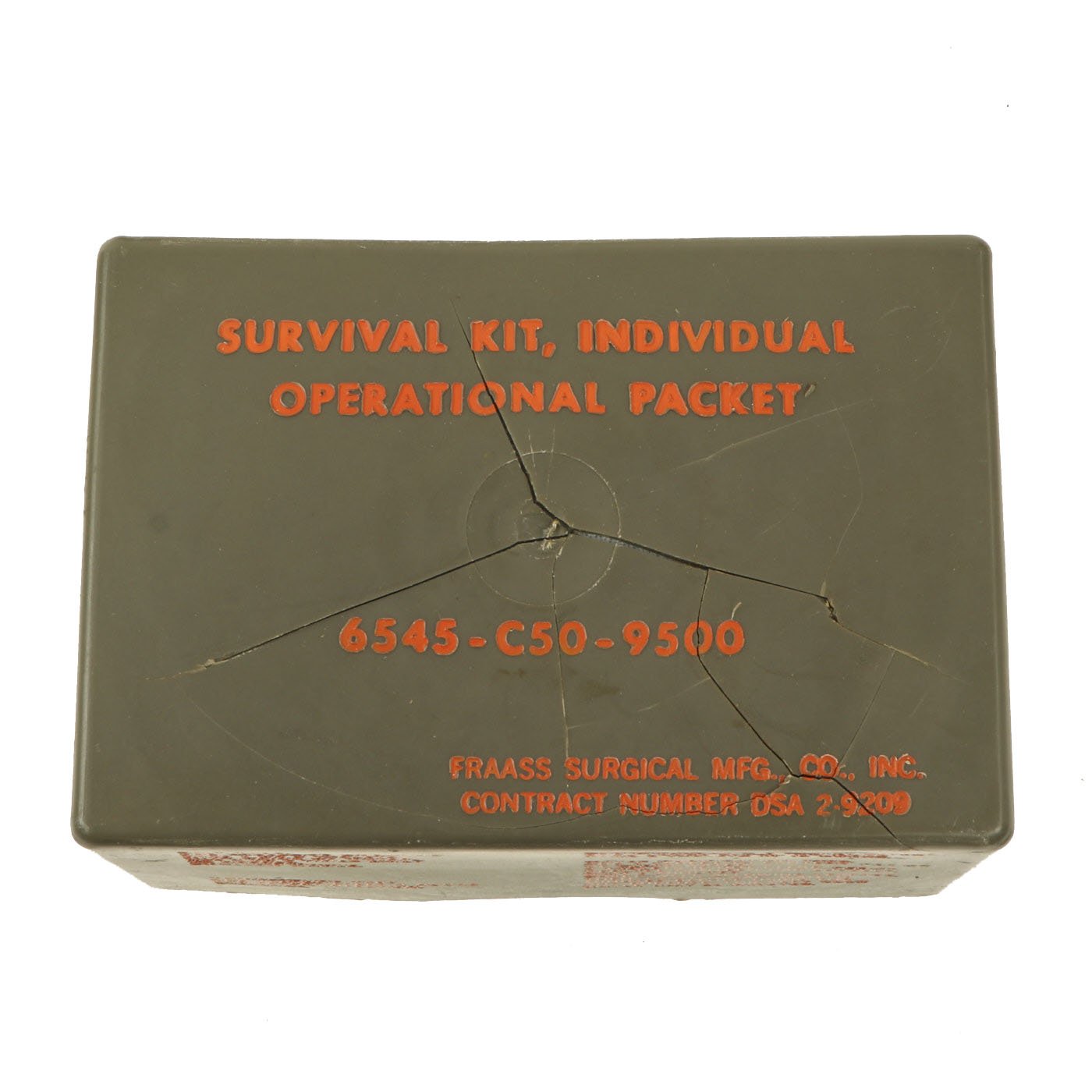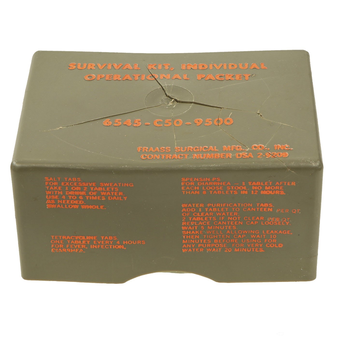 Original Items: Only One Pair Available. Now these are definitely rare! Officially called the SURVIVAL KIT, INDIVIDUAL OPERATIONAL PACKET, these were issued to Special Forces personnel during the Vietnam conflict, and contain a variety of first aid and medication items. These were specifically designed to work in the Hot and Wet climate in the Vietnam Jungle, and contain items such as Salt Tabs to prevent excessive sweating. They also contain items like insect repellant, water purifier, fungicides, and more.