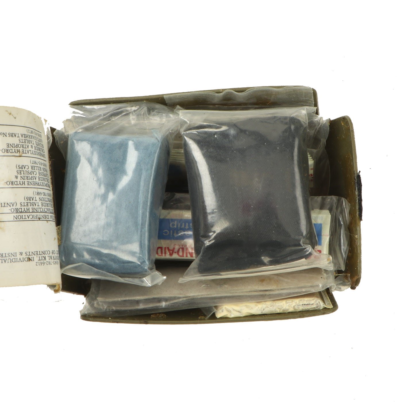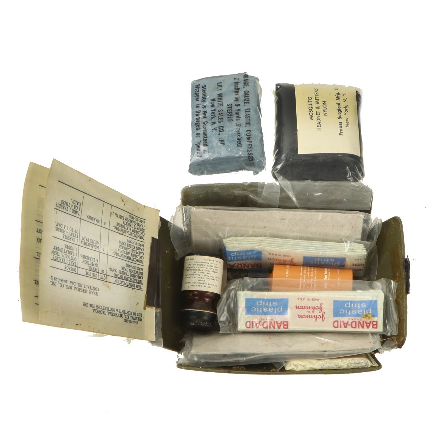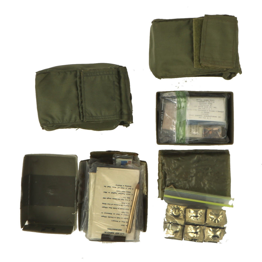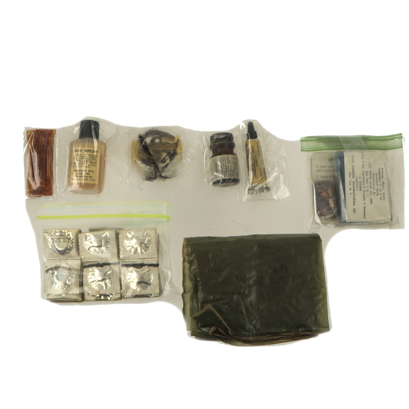 Original Items: Only One Pair Available. Now these are definitely rare! Officially called the SURVIVAL KIT, INDIVIDUAL OPERATIONAL PACKET, these were issued to Special Forces personnel during the Vietnam conflict, and contain a variety of first aid and medication items. These were specifically designed to work in the Hot and Wet climate in the Vietnam Jungle, and contain items such as Salt Tabs to prevent excessive sweating. They also contain items like insect repellant, water purifier, fungicides, and more.