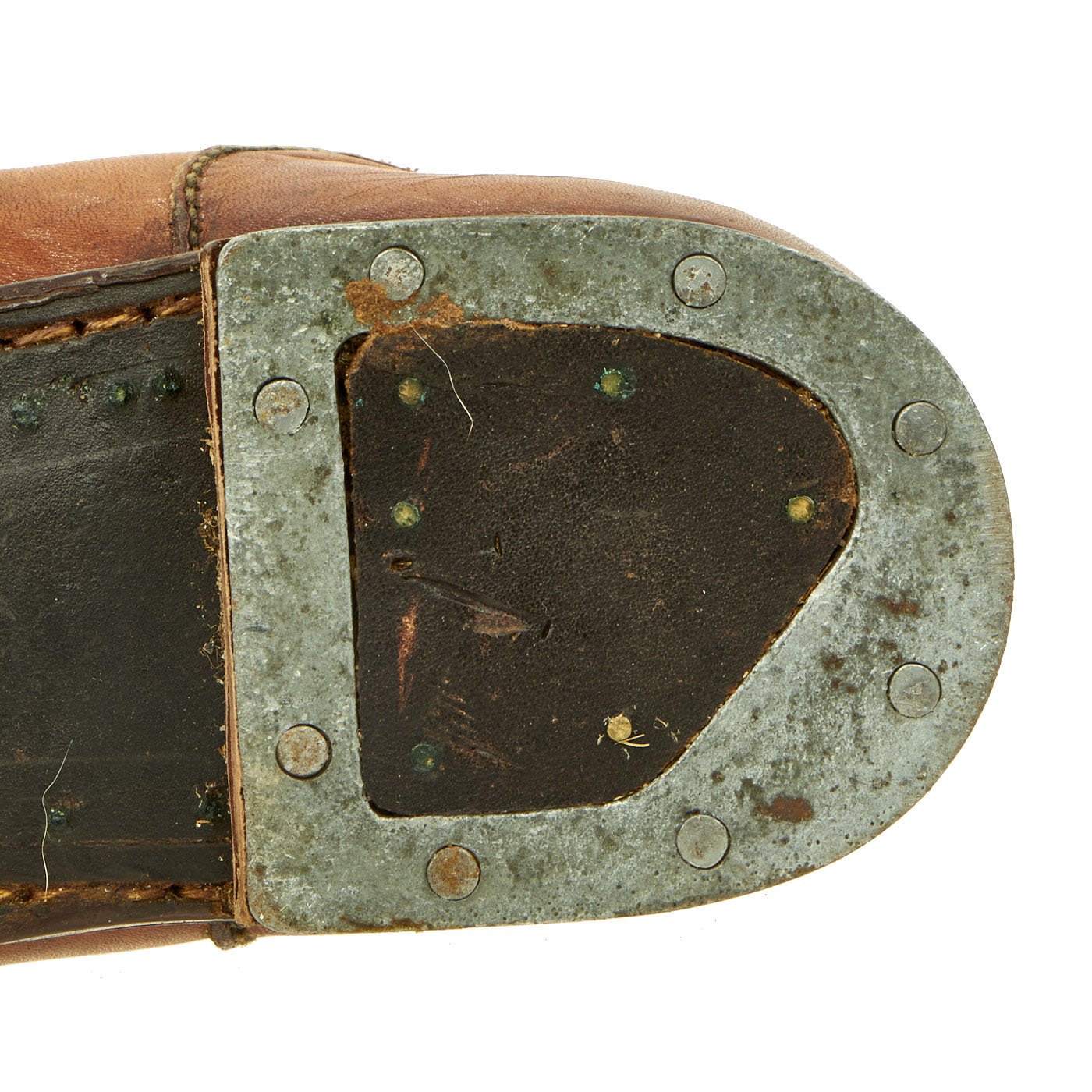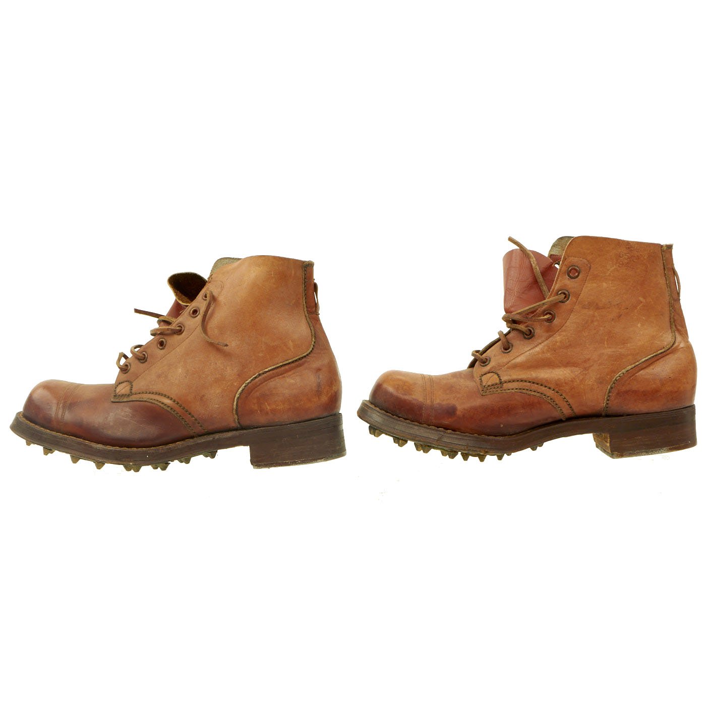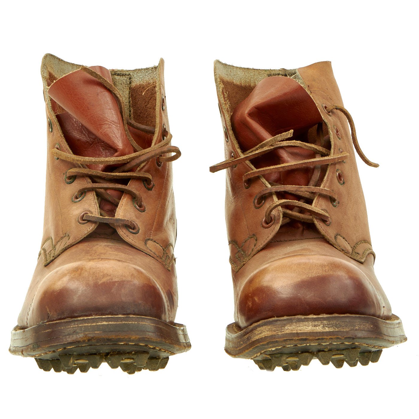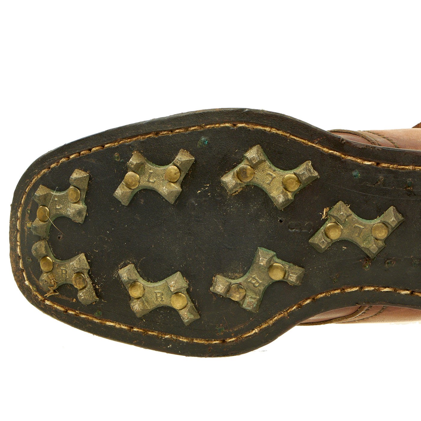 Original Items: Only One Set Available. This is a great unissued pair of hard to find Australian "Pattern 10085" Leather service boots, complete with rare brass "Jungle Cleats." These were designed for use in the Pacific theatre, where many of the areas occupied by Japan had tropical climates, and a firm foothold was very important. These boots are really in great shape, and even have some post war "shoe trees" inside to help maintain the shape and form of the leather.