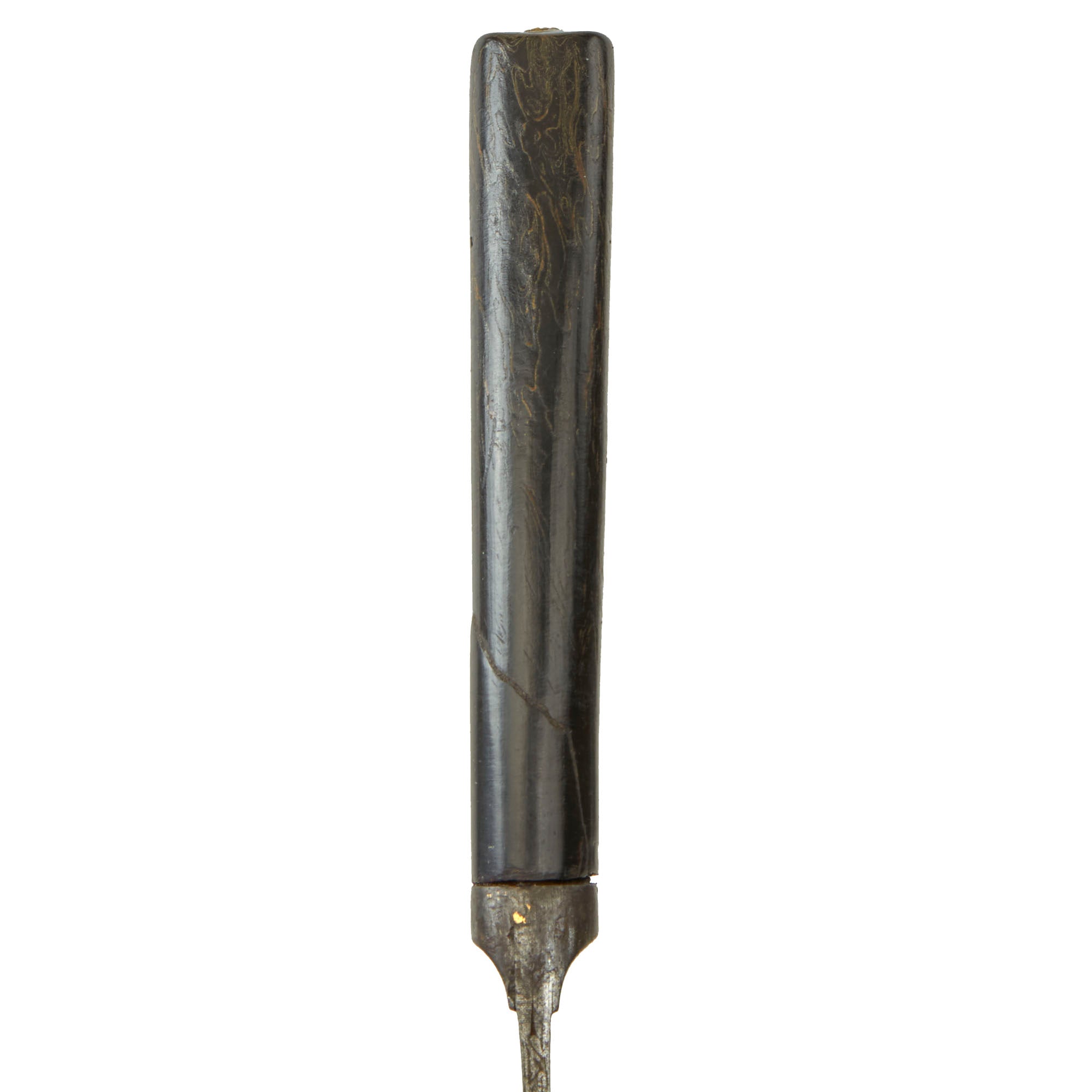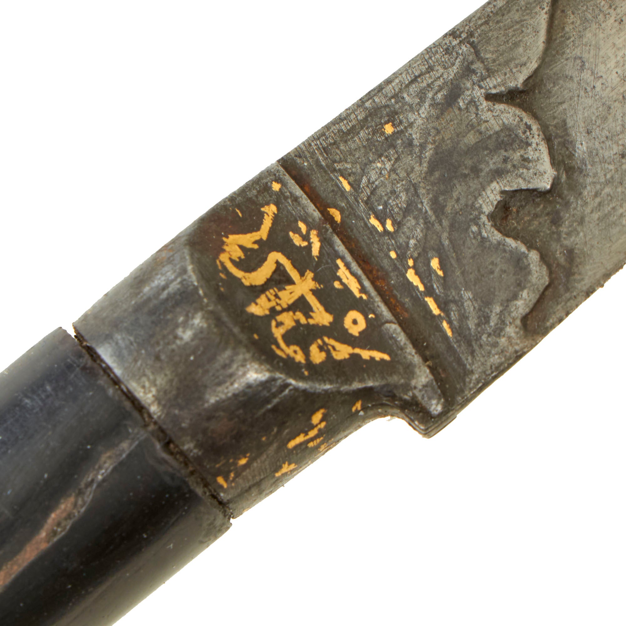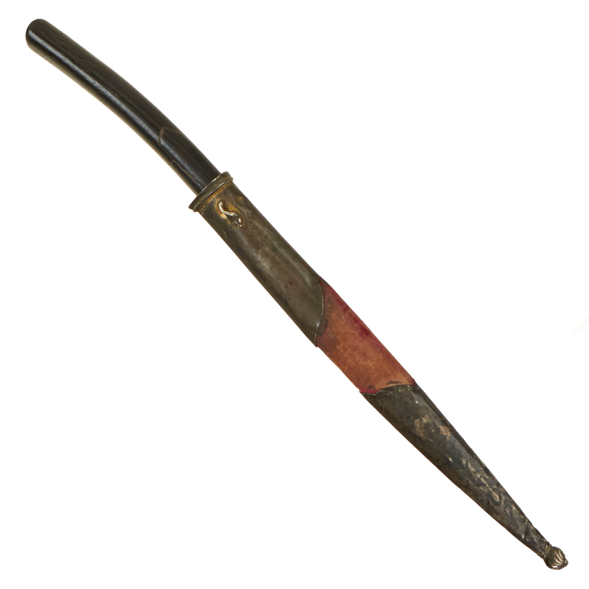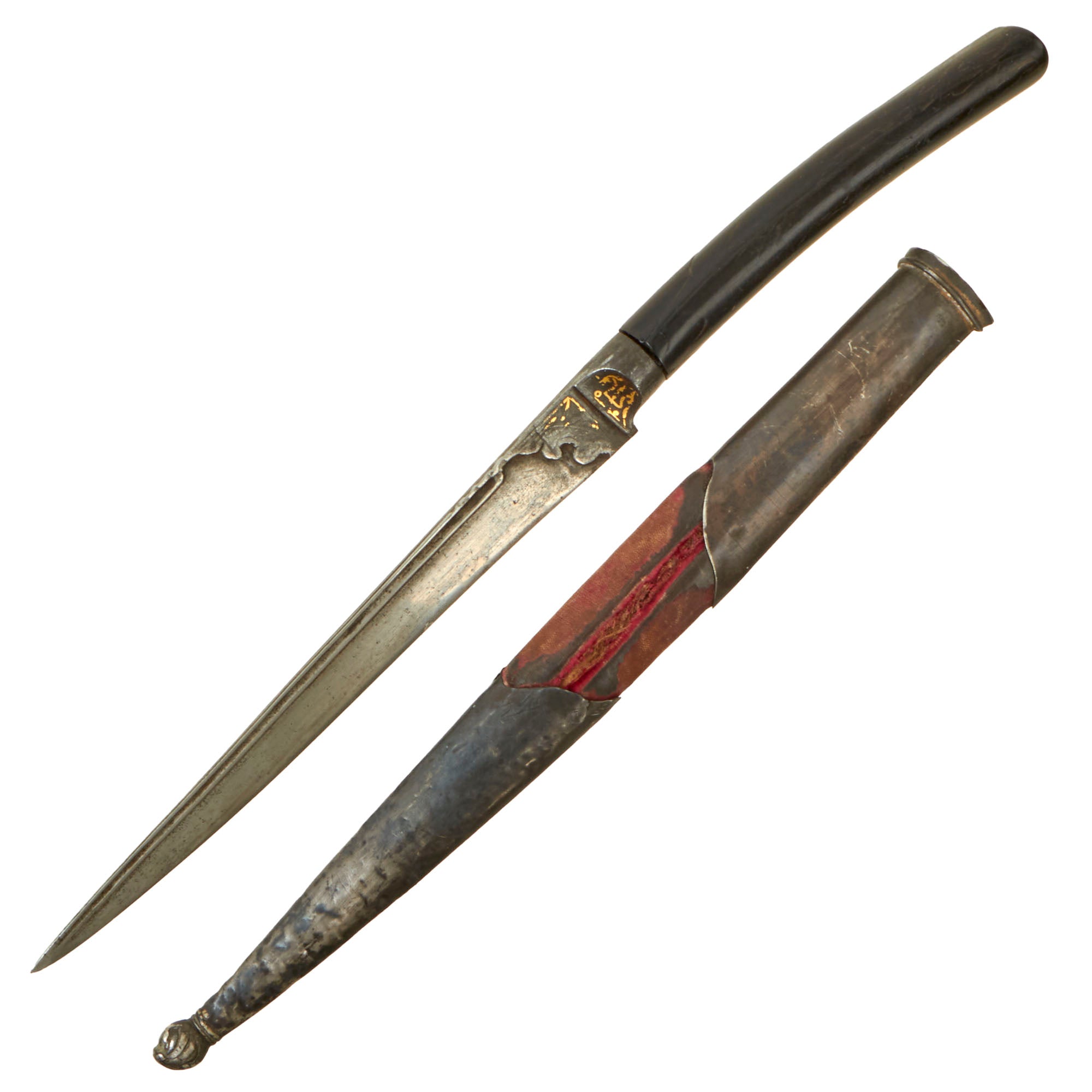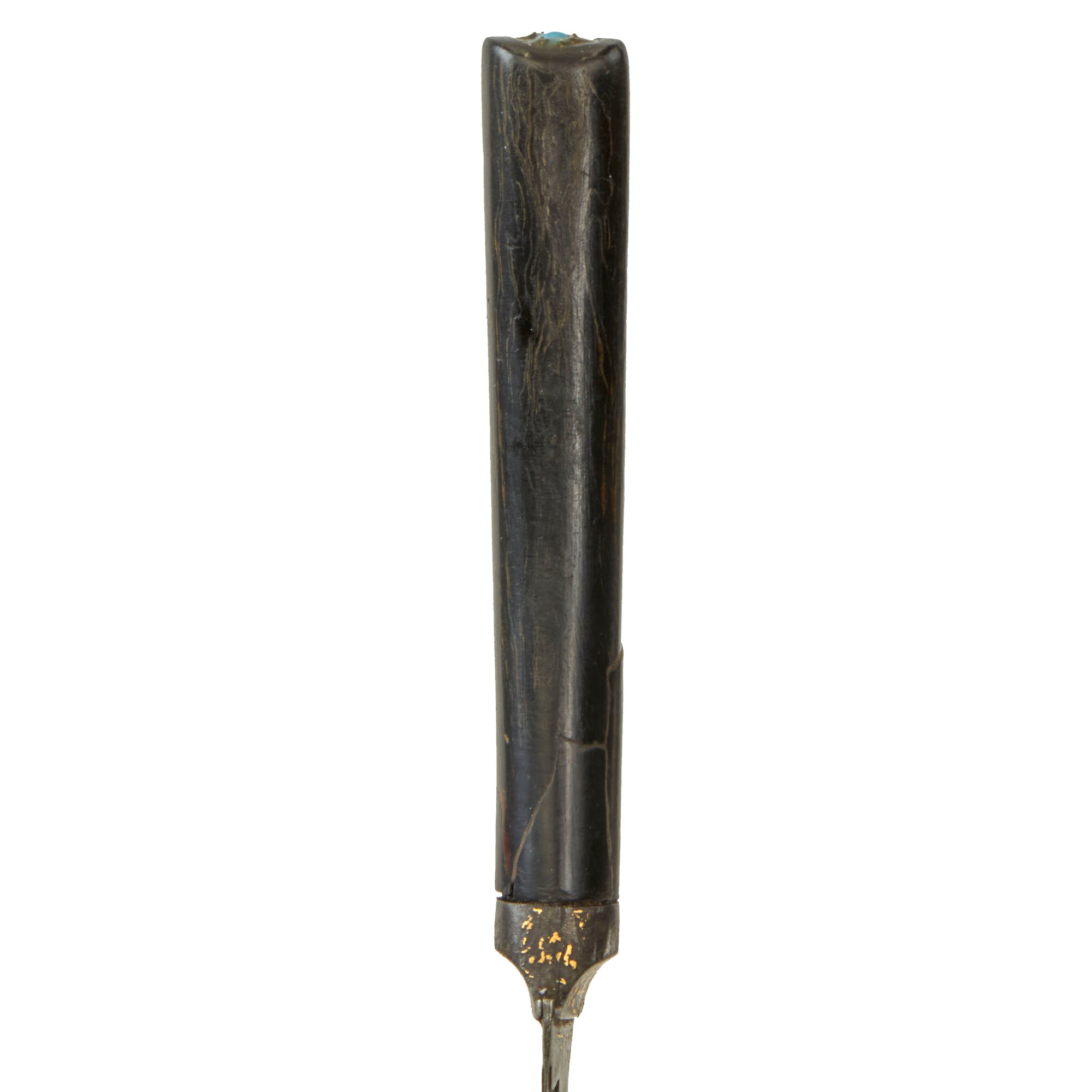Original Item: Only One Available. This is a very nice large Persian Dagger, known as a "Kard" (Persian for knife), with an overall length of 12⅛". It features a 7" single edged blade with gold inlaid on the end. The hilt is of wood with a small bright blue stone embedded in the pommel.