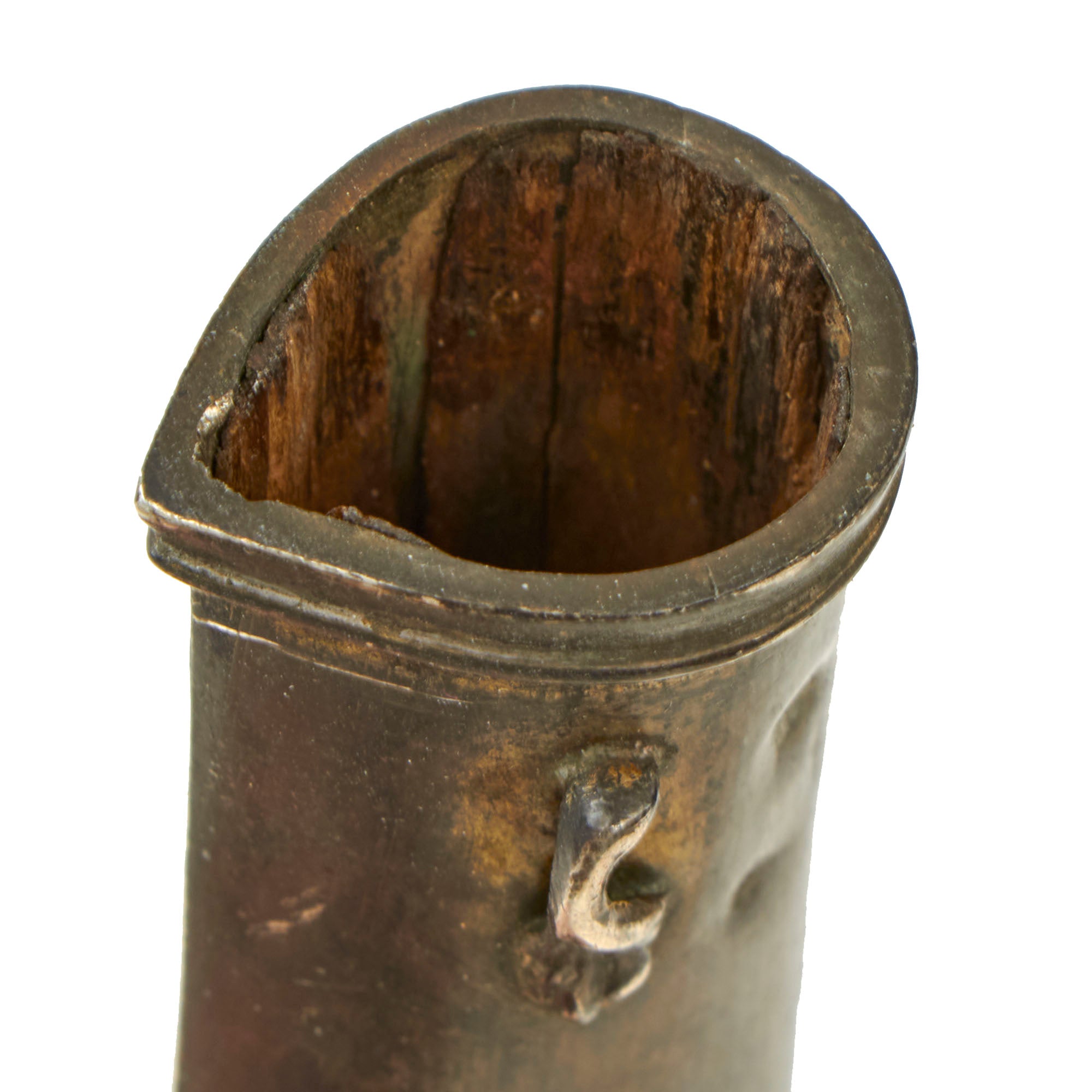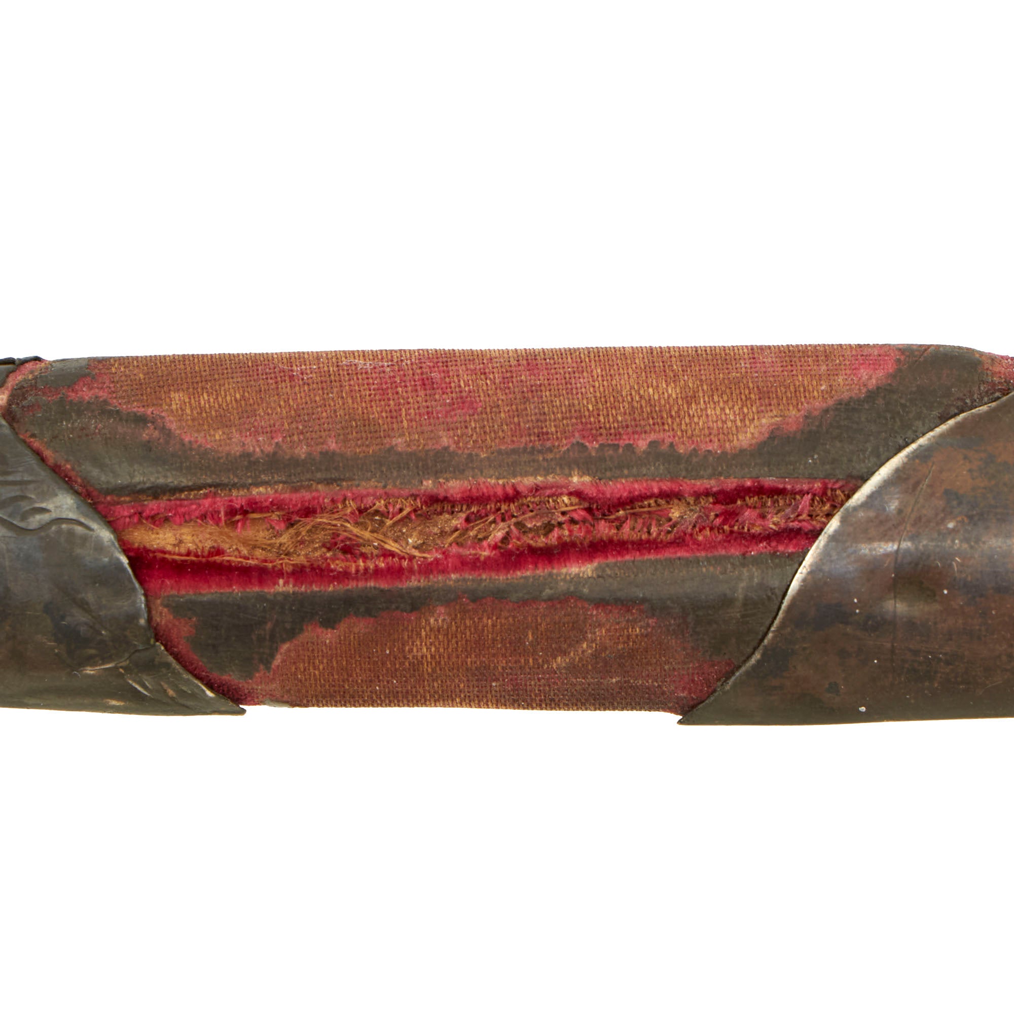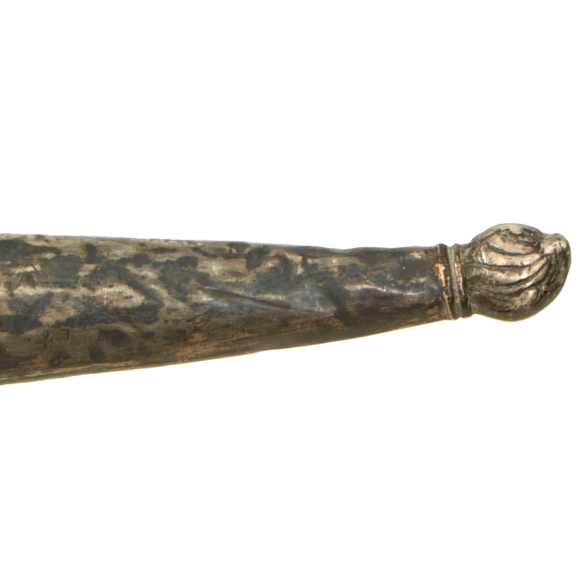 This dagger means "ALL BUSINESS". The smoke colored blade could very well be Damascus/Wootz steel and is of very high quality. The included scabbard is of what we believe to be silver with an originally red velvet leather center which has lost the majority of its stitching and finish.