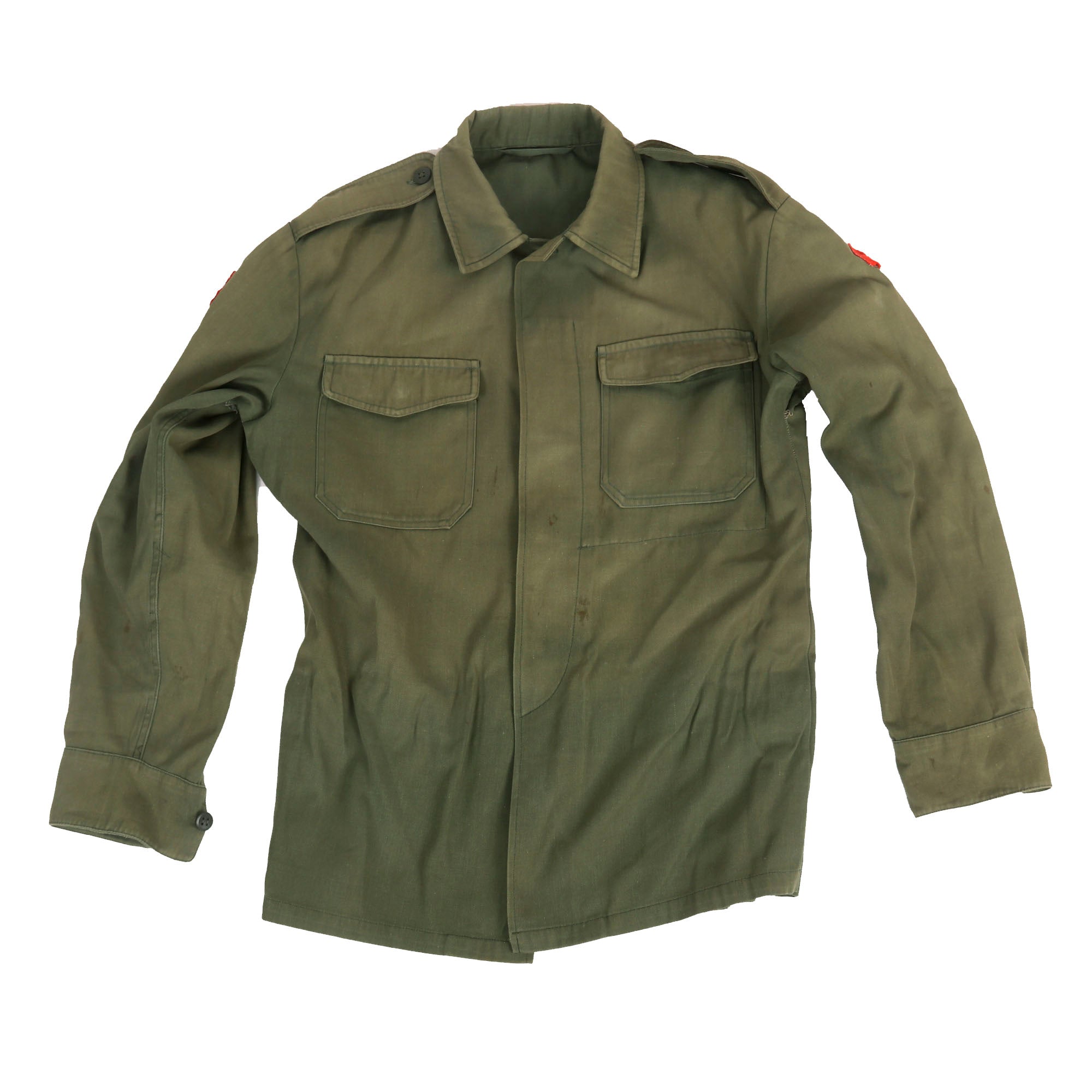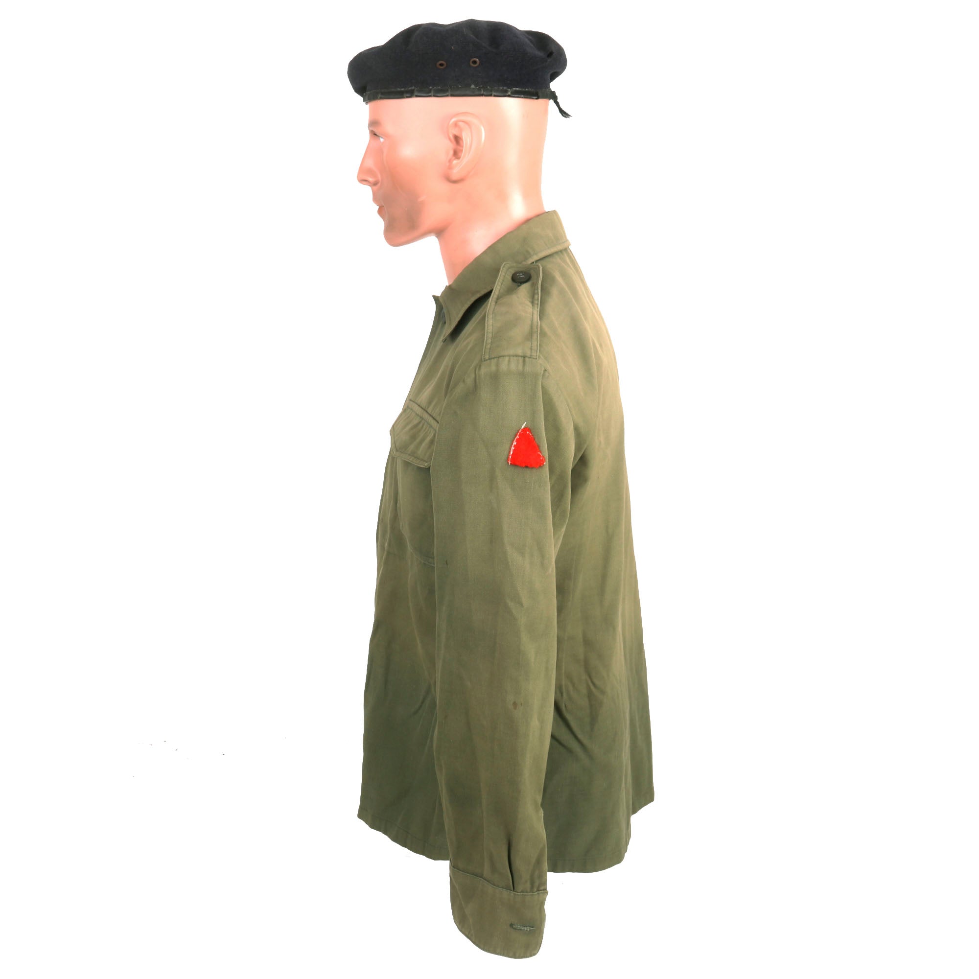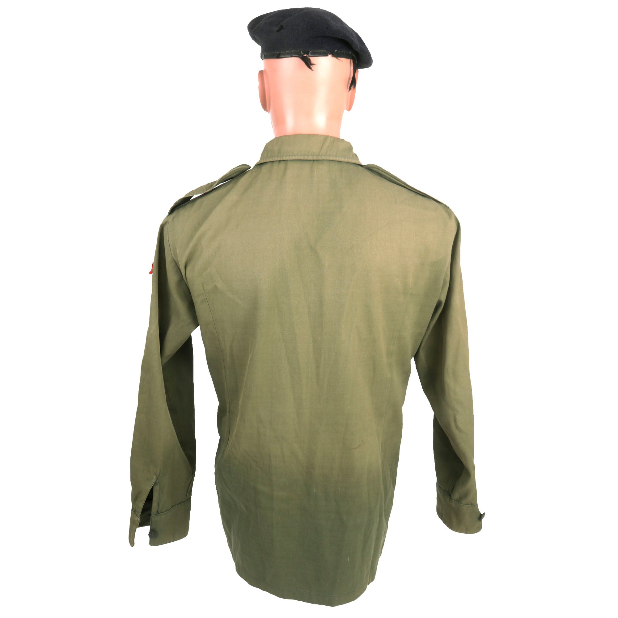 The uniform consists of a top and pair of trousers, both are green for the Ministry of Defense and do have the Republican Guard patch located on both shoulders. There are no shoulder boards or rank insignia of any kind. The top and bottom are in good but faded condition with the beret being borderline relic with heavy fading and moth nips.