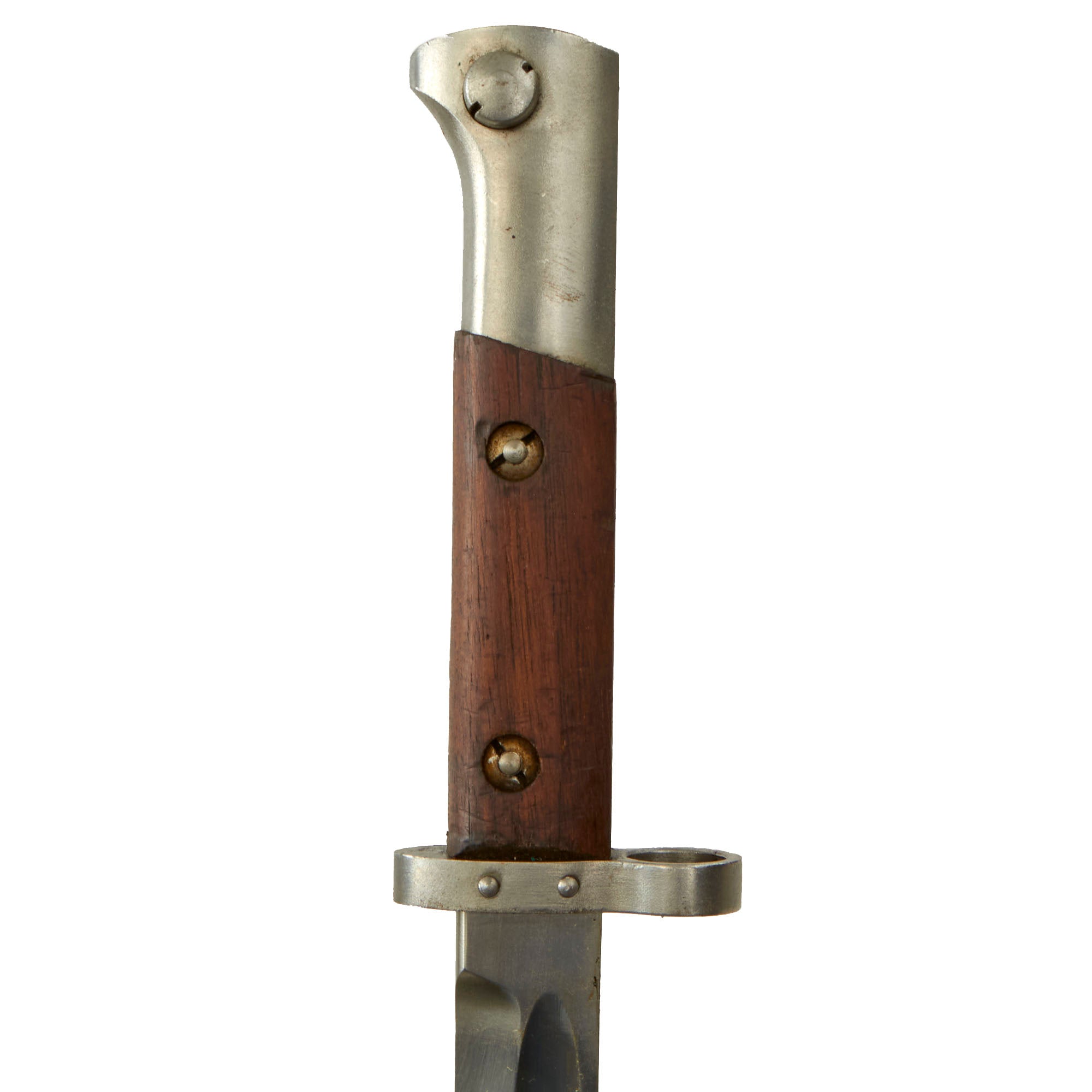 Former Czechoslovak Army VZ–23 bayonets exported to Persia (Iran) had an edge-up blade profile and scabbard with the same frog stud as the Czech VZ–22 bayonet. New-made Model 98/29 bayonets exported to Persia (such as this example) had blades with a conventional edge-down profile and scabbard with a wire frog loop.