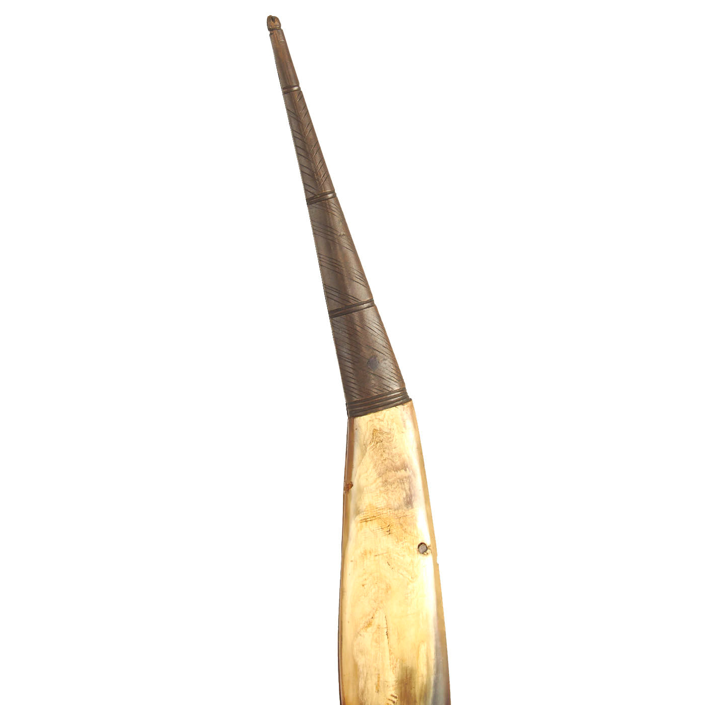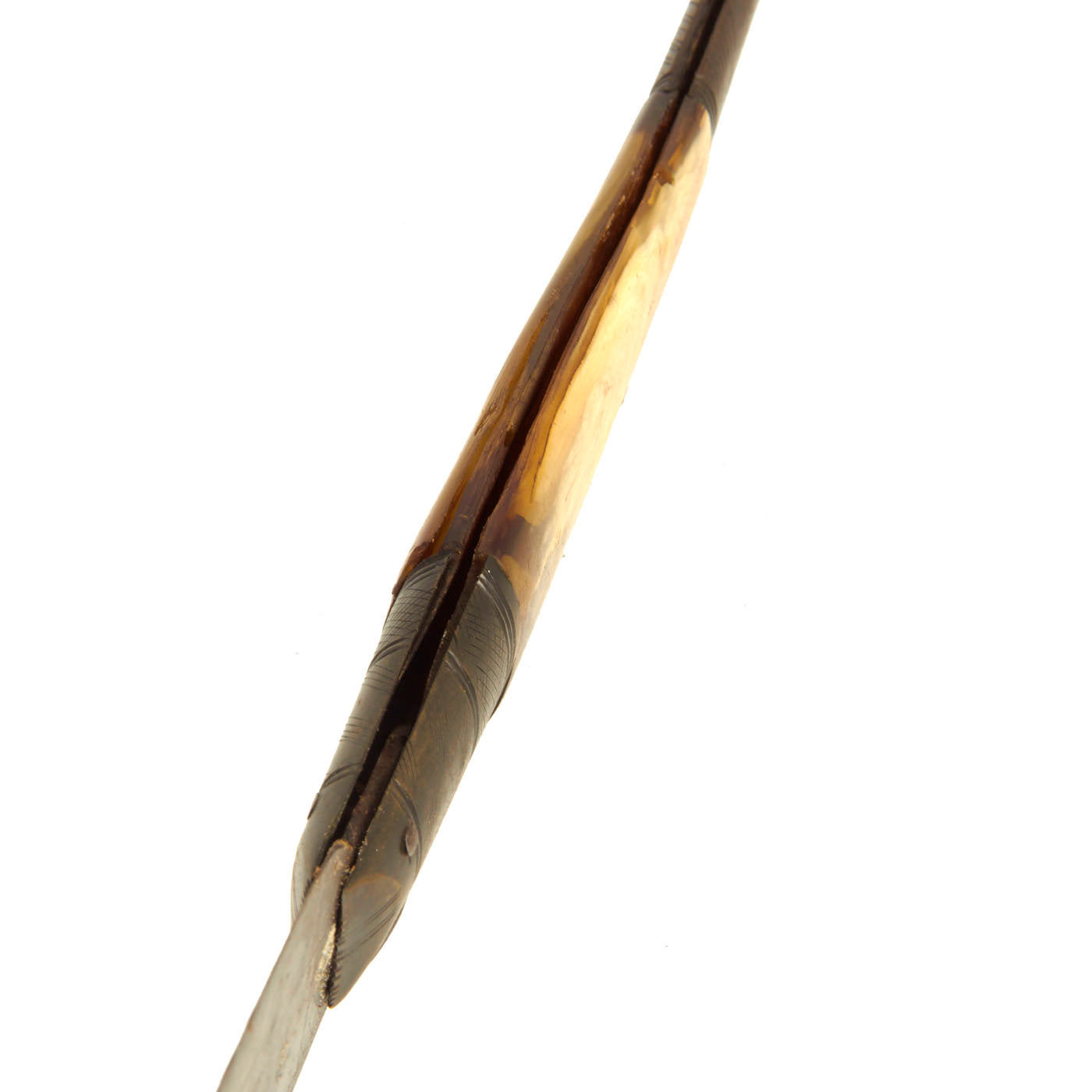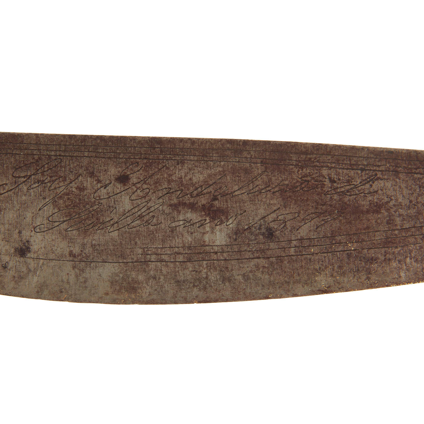 This example of the navaja sevillana is in lovely condition with the ratcheting mechanism still functional. The steel and brass constructed knife features lovely horn grip scales over what appears to be an inner wooden structure. The scales are somewhat loose due to expansion from probable water damage and the layers have come apart slightly. The etching on the brass adornments are still highly visible and are the typical lines and crosshatch patterns often found on this style of knife. The 10 ⅛” blade features the same type of designs with lovely Spanish lettering engraved in script on the right side. From what we could make out, the writing is as follows: