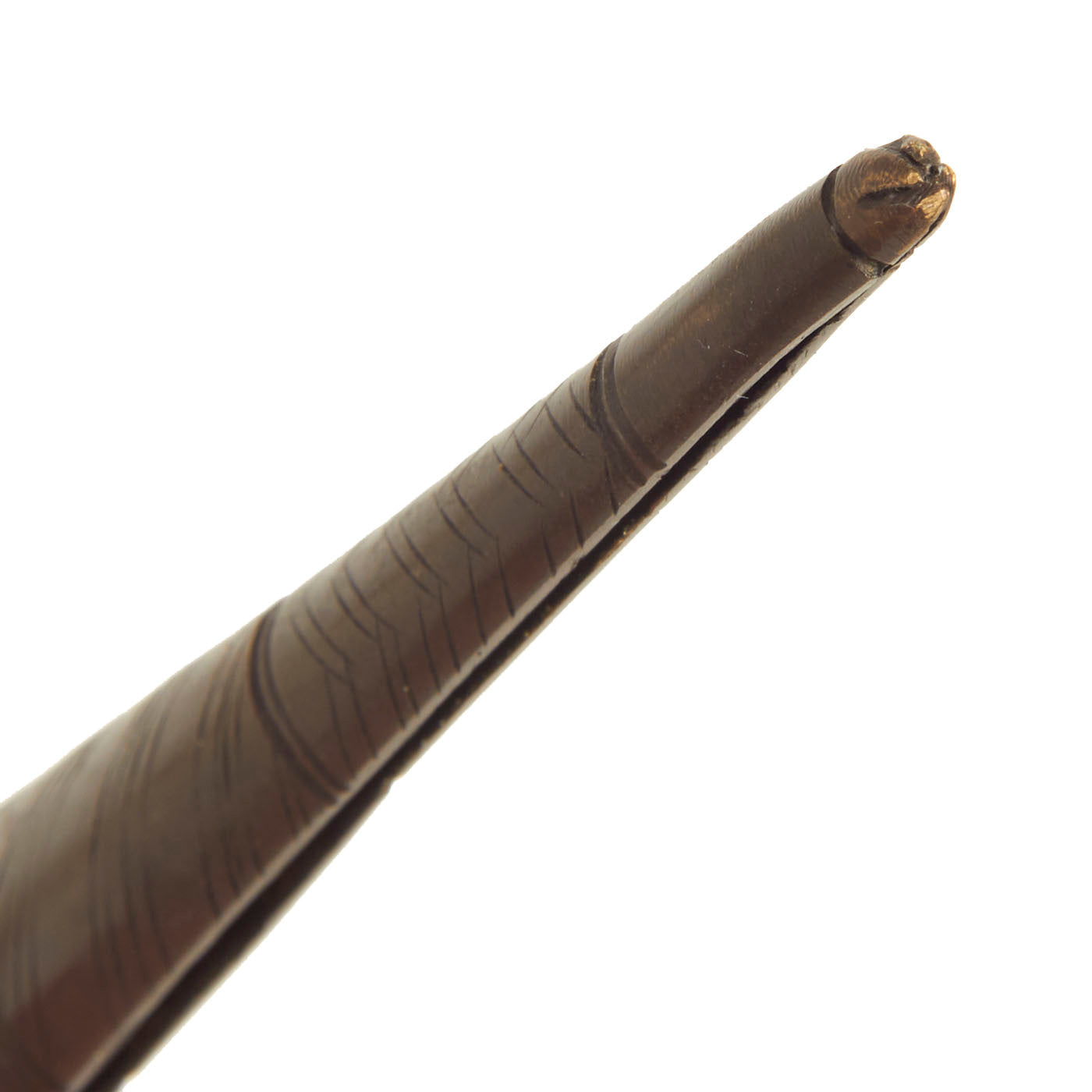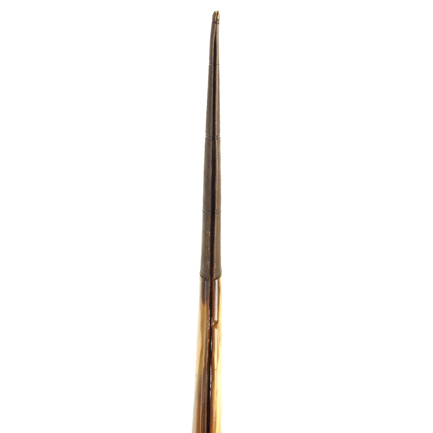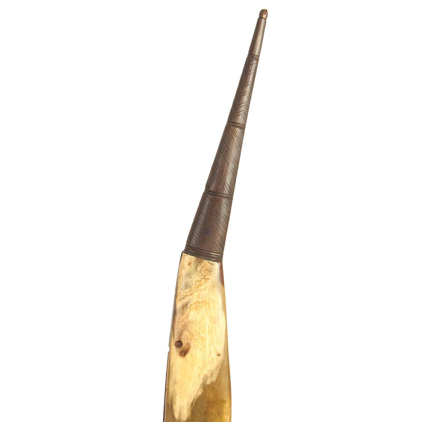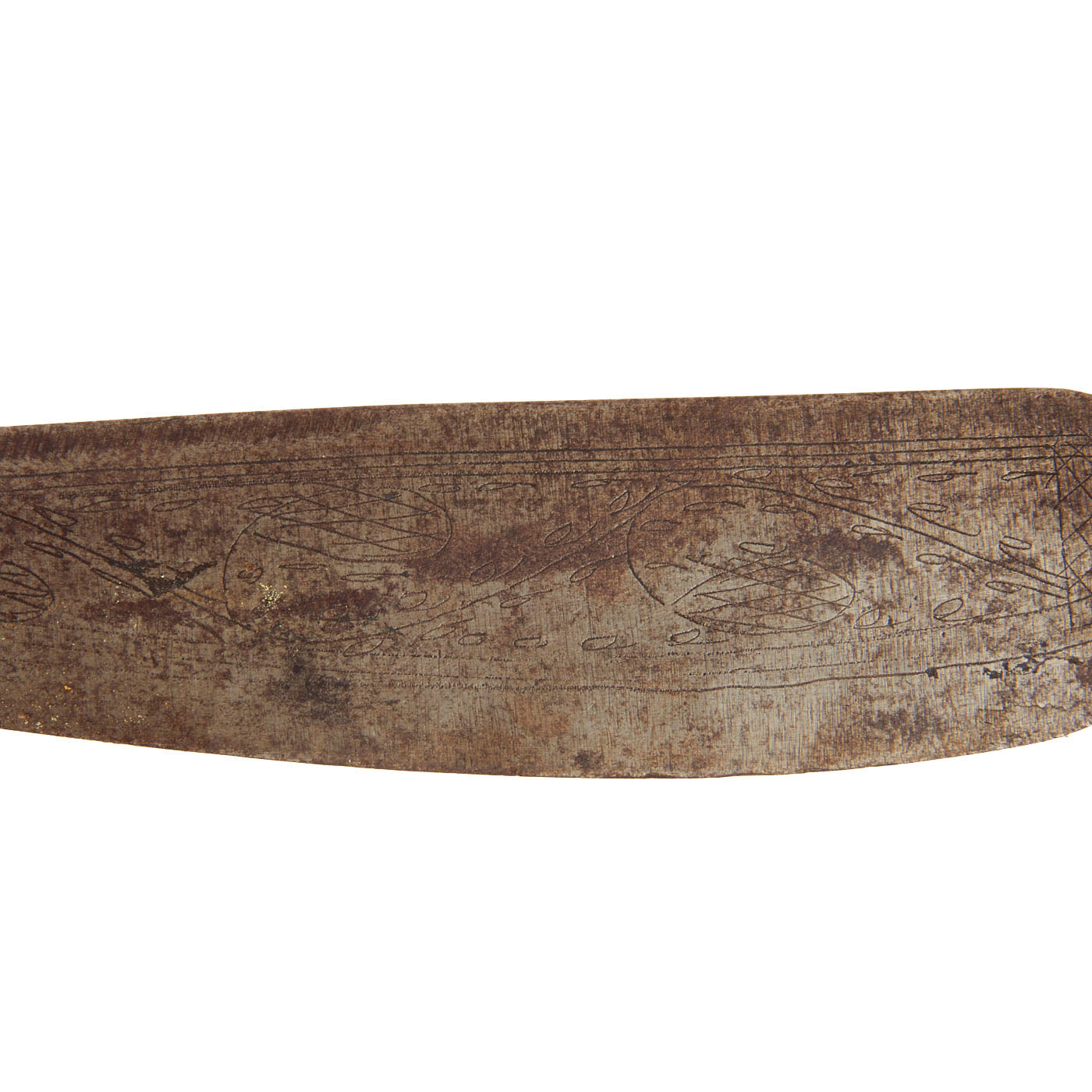 This example of the navaja sevillana is in lovely condition with the ratcheting mechanism still functional. The steel and brass constructed knife features lovely horn grip scales over what appears to be an inner wooden structure. The scales are somewhat loose due to expansion from probable water damage and the layers have come apart slightly. The etching on the brass adornments are still highly visible and are the typical lines and crosshatch patterns often found on this style of knife. The 10 ⅛” blade features the same type of designs with lovely Spanish lettering engraved in script on the right side. From what we could make out, the writing is as follows: