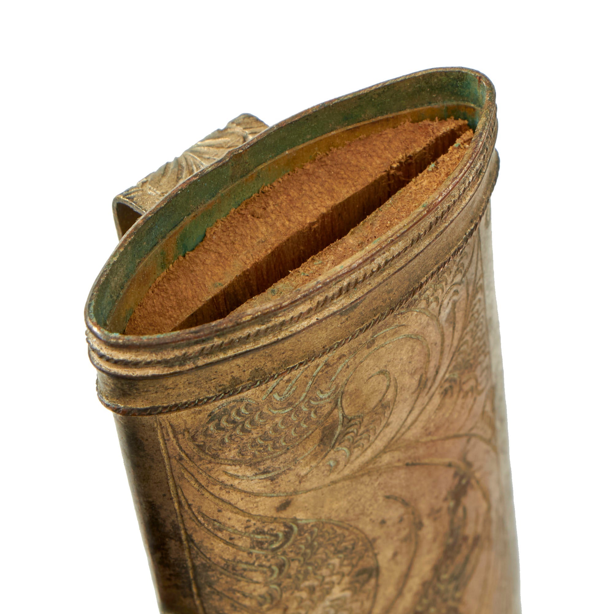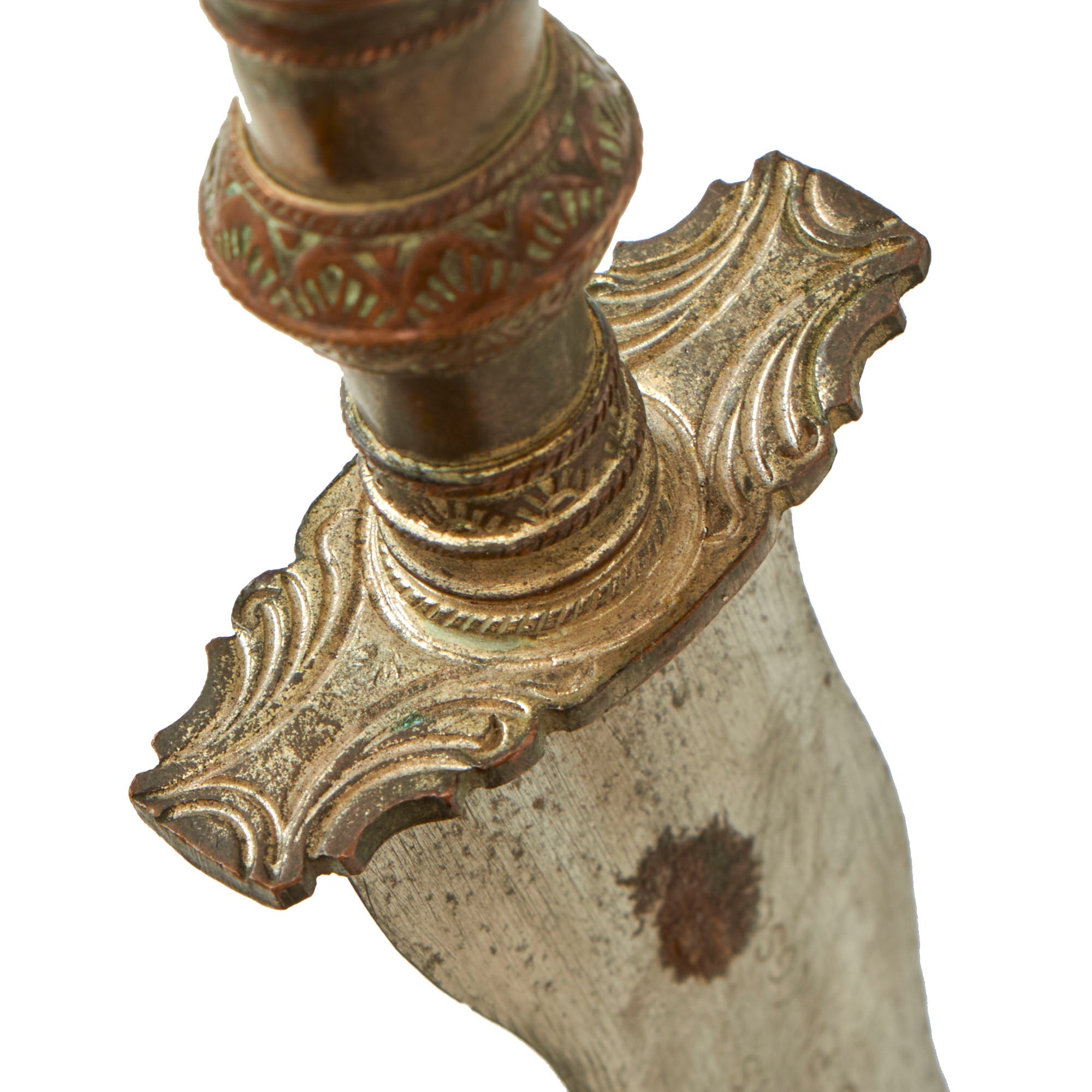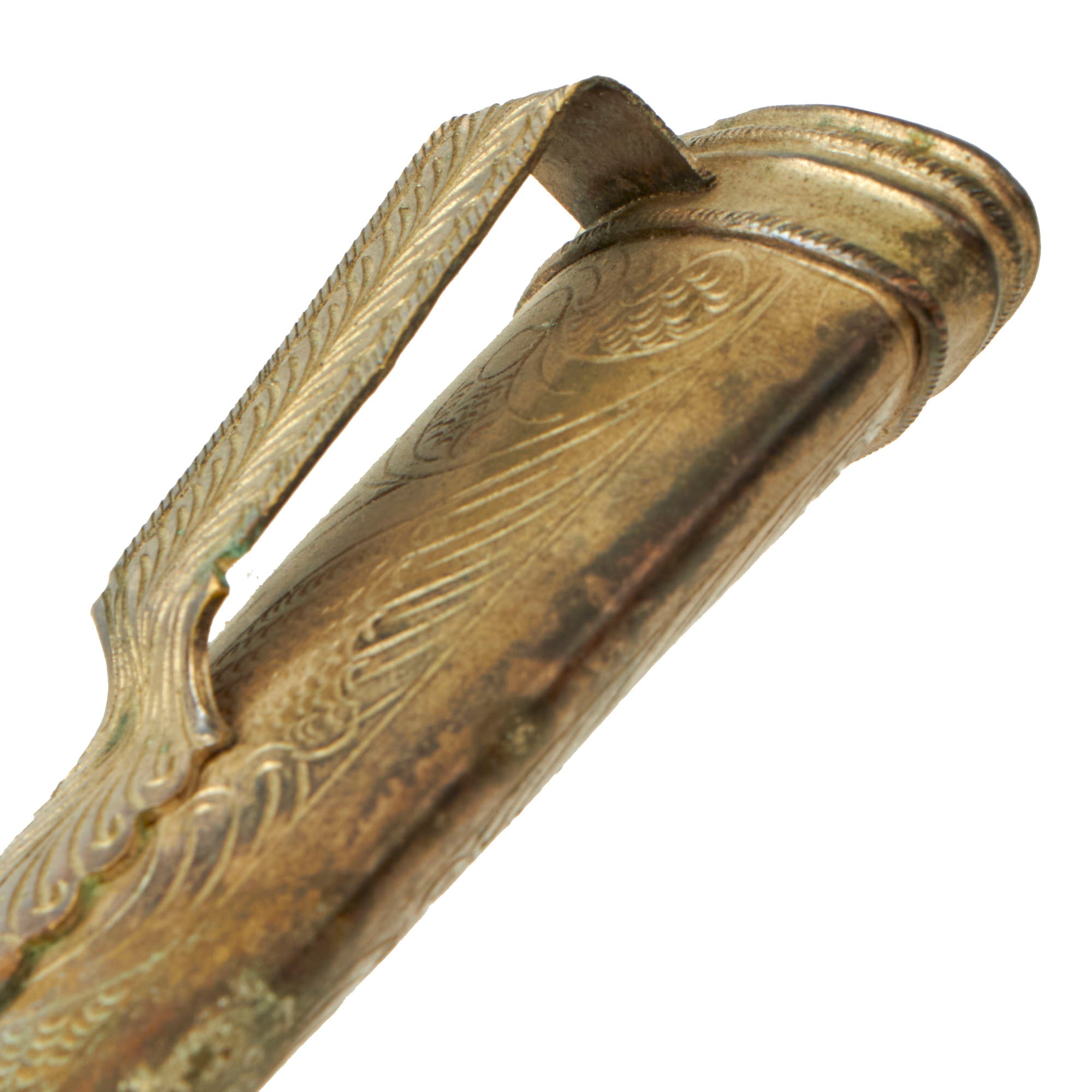 The dagger measures 9½” long with a 6⅛” blade, and a 6¼” scabbard. The scabbard retains its belt loop and is beautifully ornamented with engravings. The blade is in good shape with some oxidation as shown. Someone has attempted to get rid of the engraving but was unsuccessful.