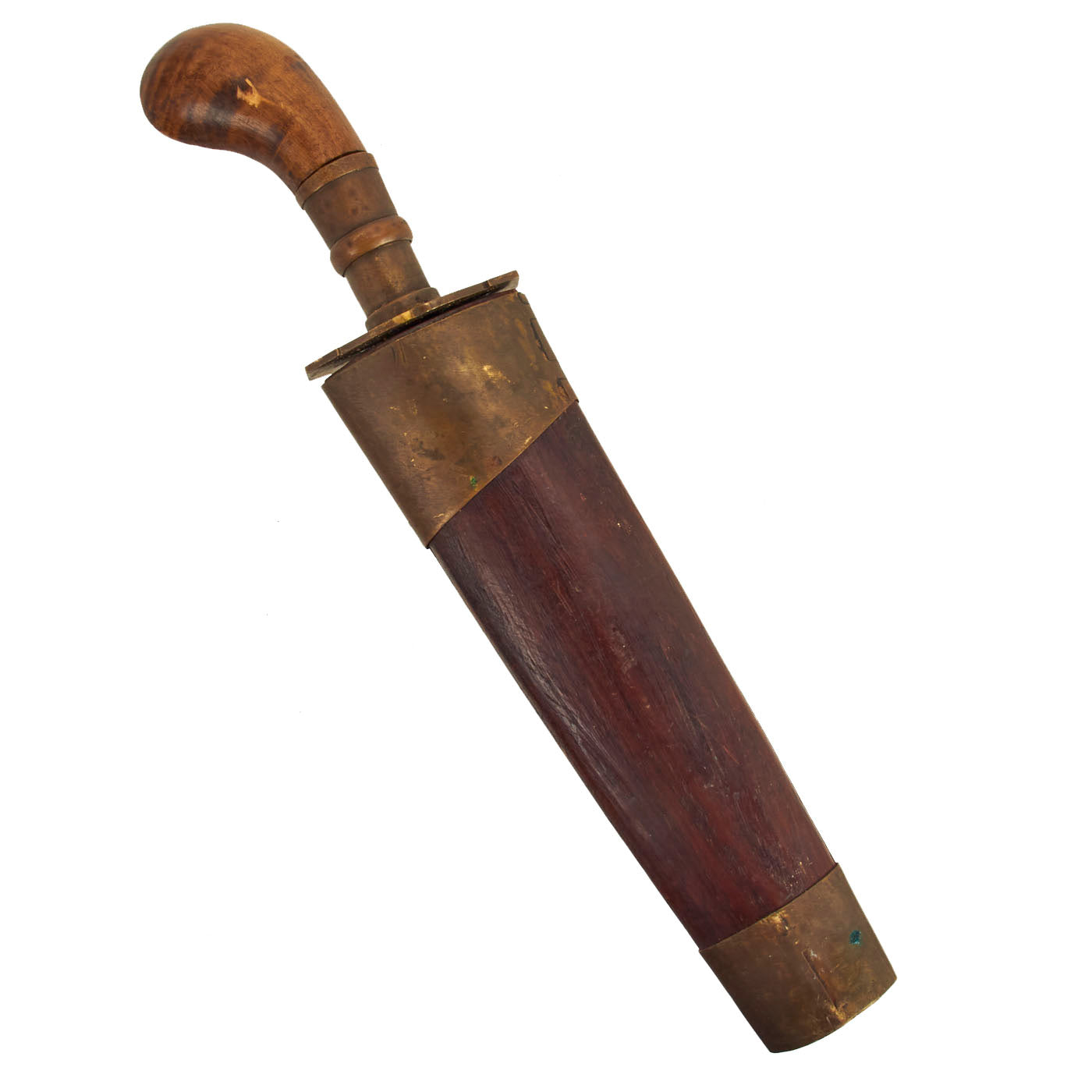 As with its larger relative, the kris or kalis, gunong can be either straight or wavy-bladed like this example. The blade may be single or double-edged and broadens towards the hilt to protect the bearer's fingers. The sheath and the handle can be made from either wood or metal. The style of the hilt can be used to differentiate modern pieces from those made before the American occupation. This example is double edged with a wood and brass scabbard.