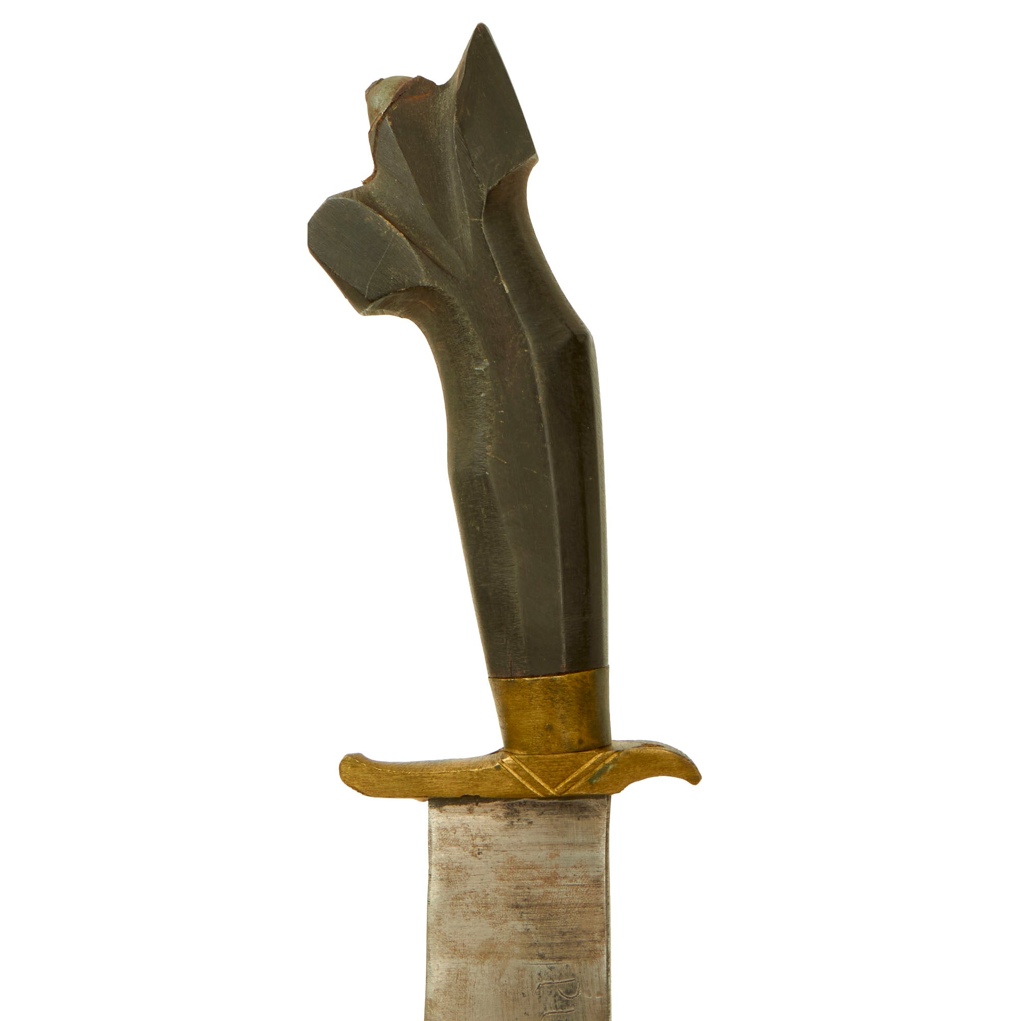 This example is in fantastic condition and has no movement in any of the components, which is a rarity when it comes to these bringbacks! The blade measures 16 ½” and tapers into a clip point. The wood handle measures 6” and has a 3” brass crossguard, all components in wonderful condition.