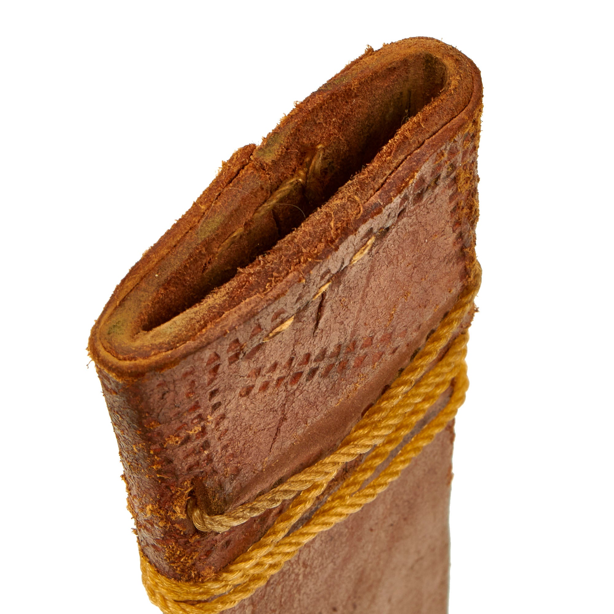 The 16 ¼” leather scabbard is in wonderful condition though it is missing a small portion on the tip, which leaves the tip of the blade exposed so handle with caution. There is no belt loop attachment present and the stitching is still very solid and intact.