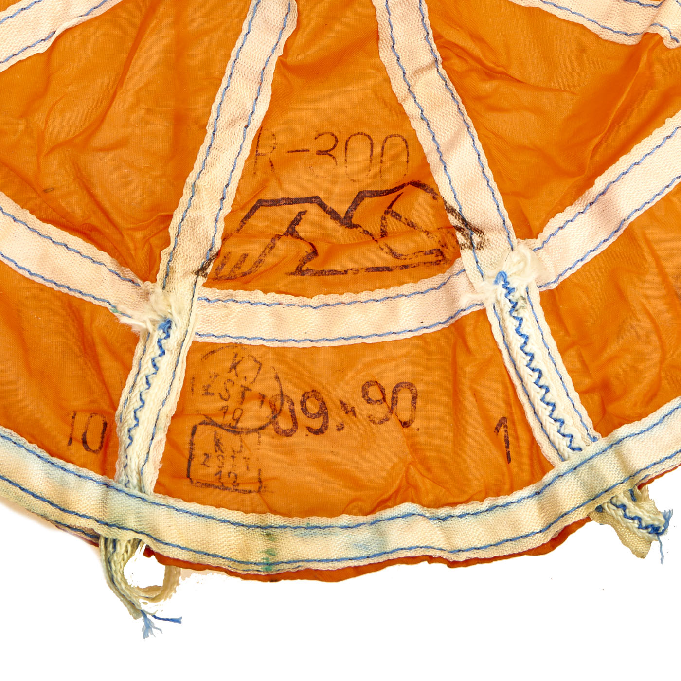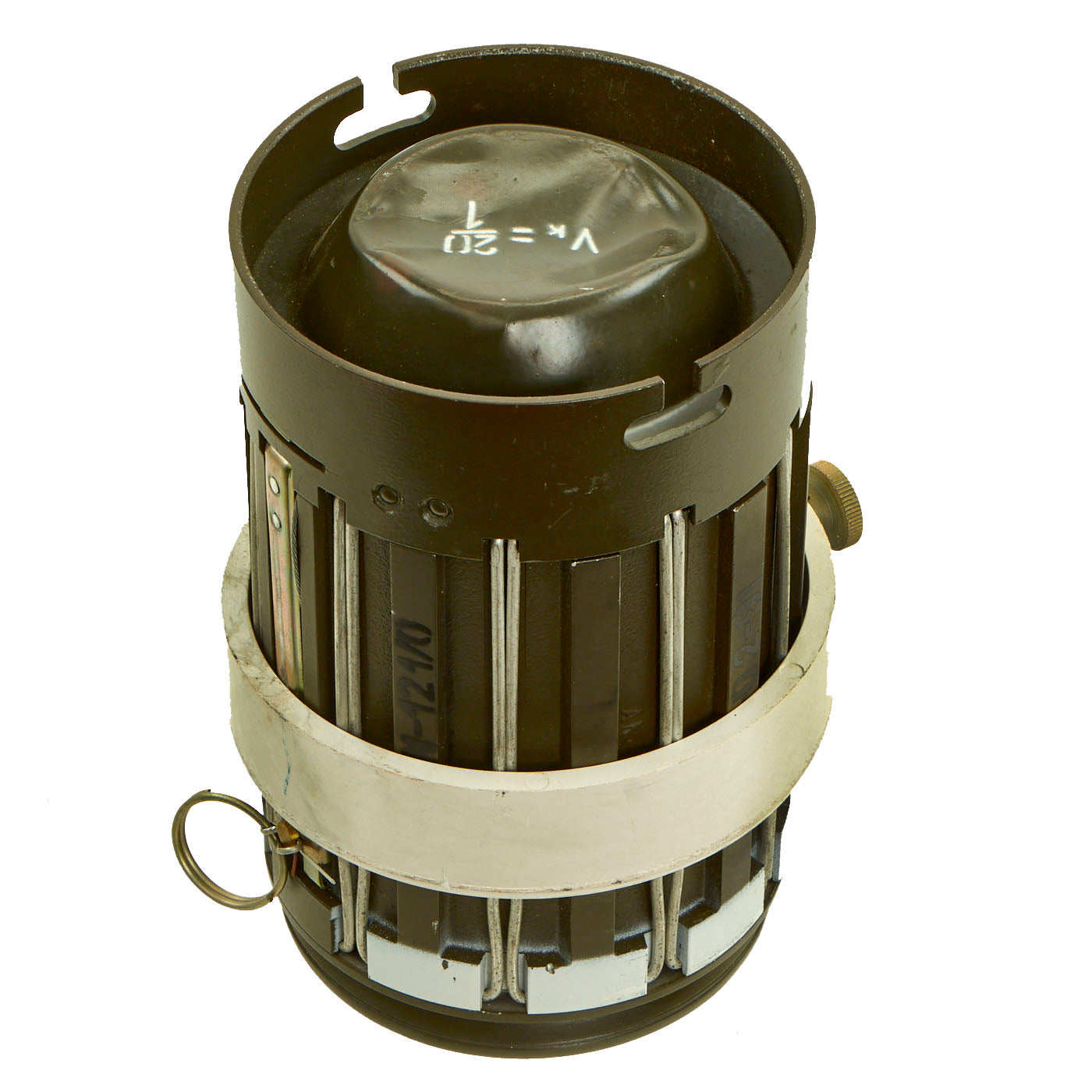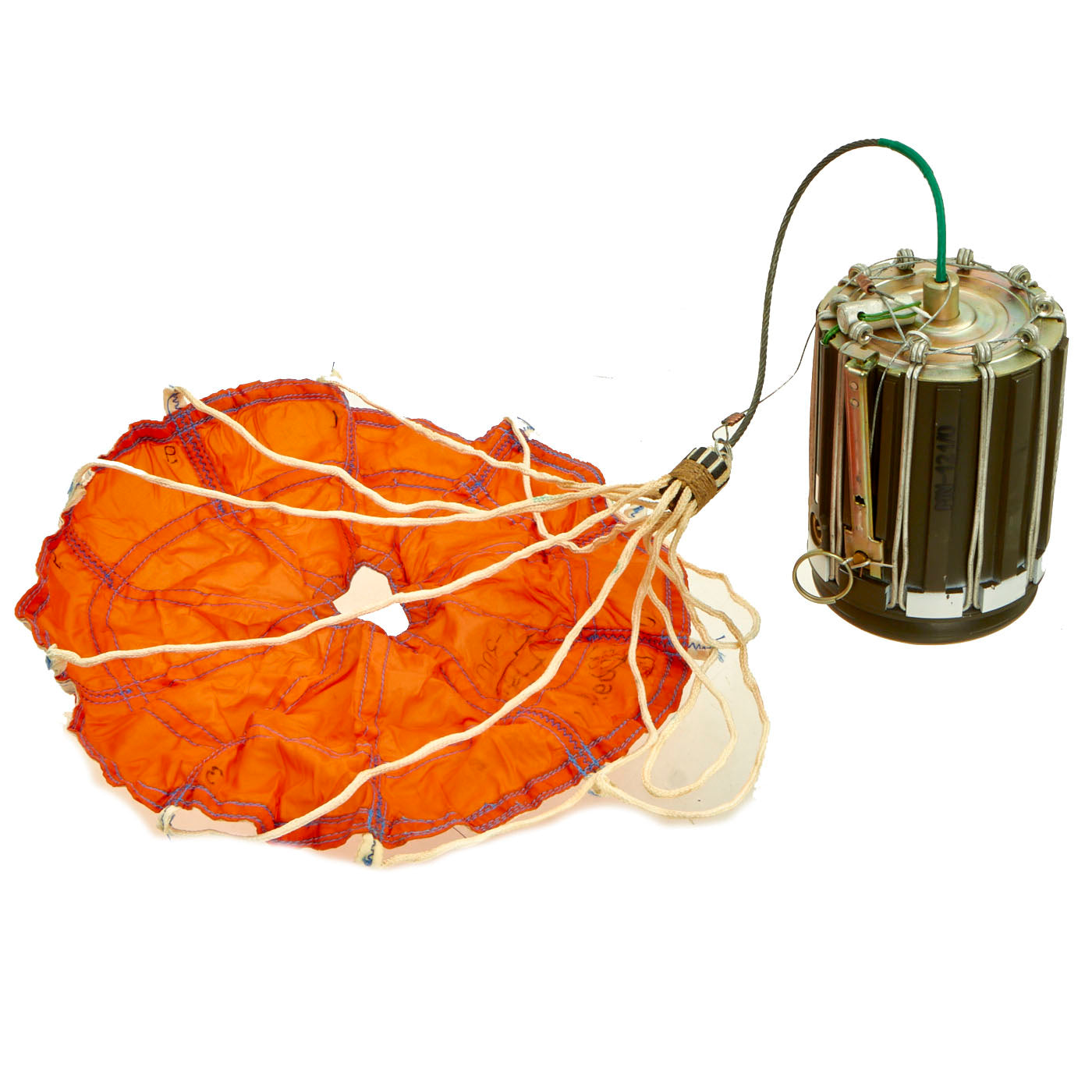 This training example is complete and retains all original markings on the outside of the canister as well as the orange parachute on the inside. There is no extensive damage but the top cone is dented in.