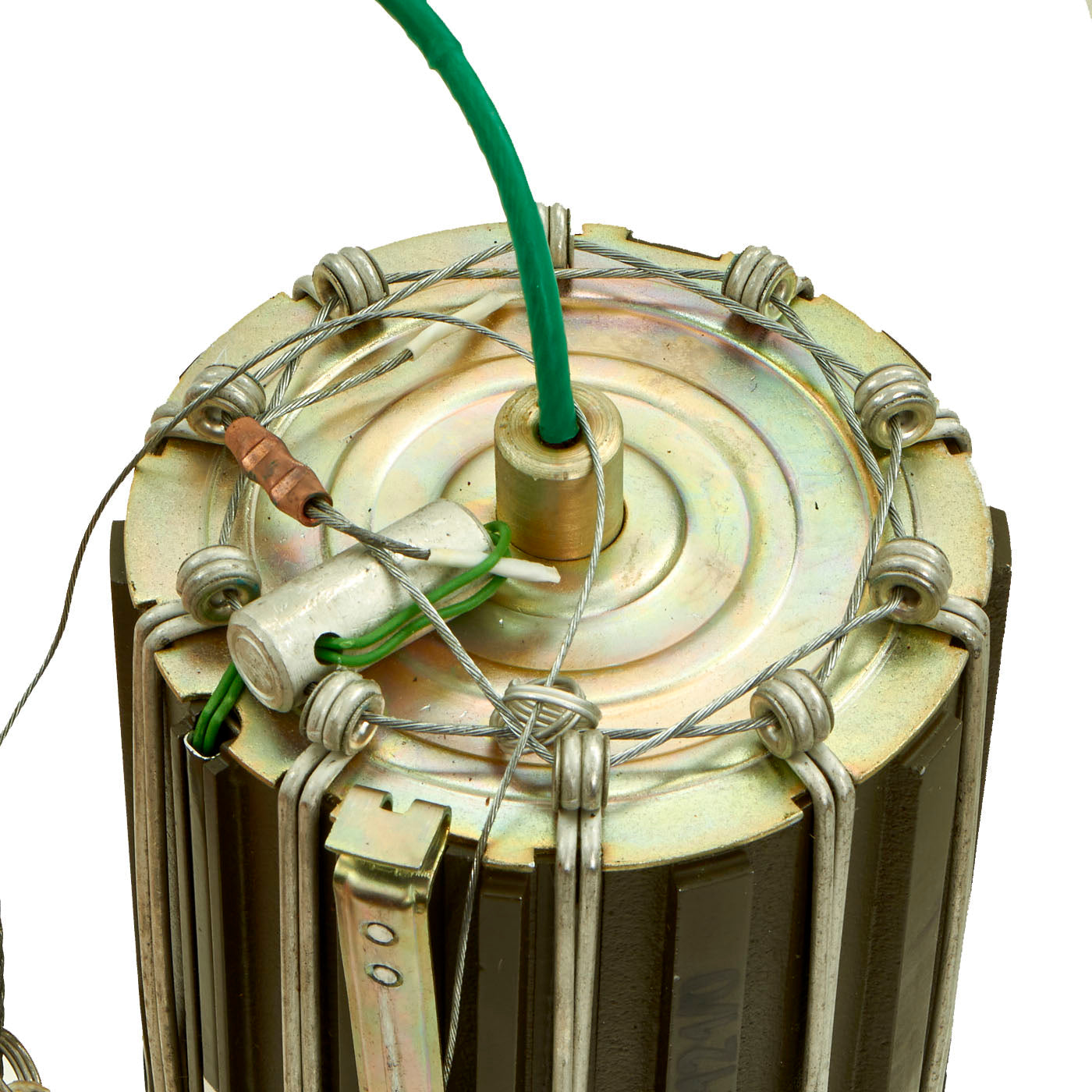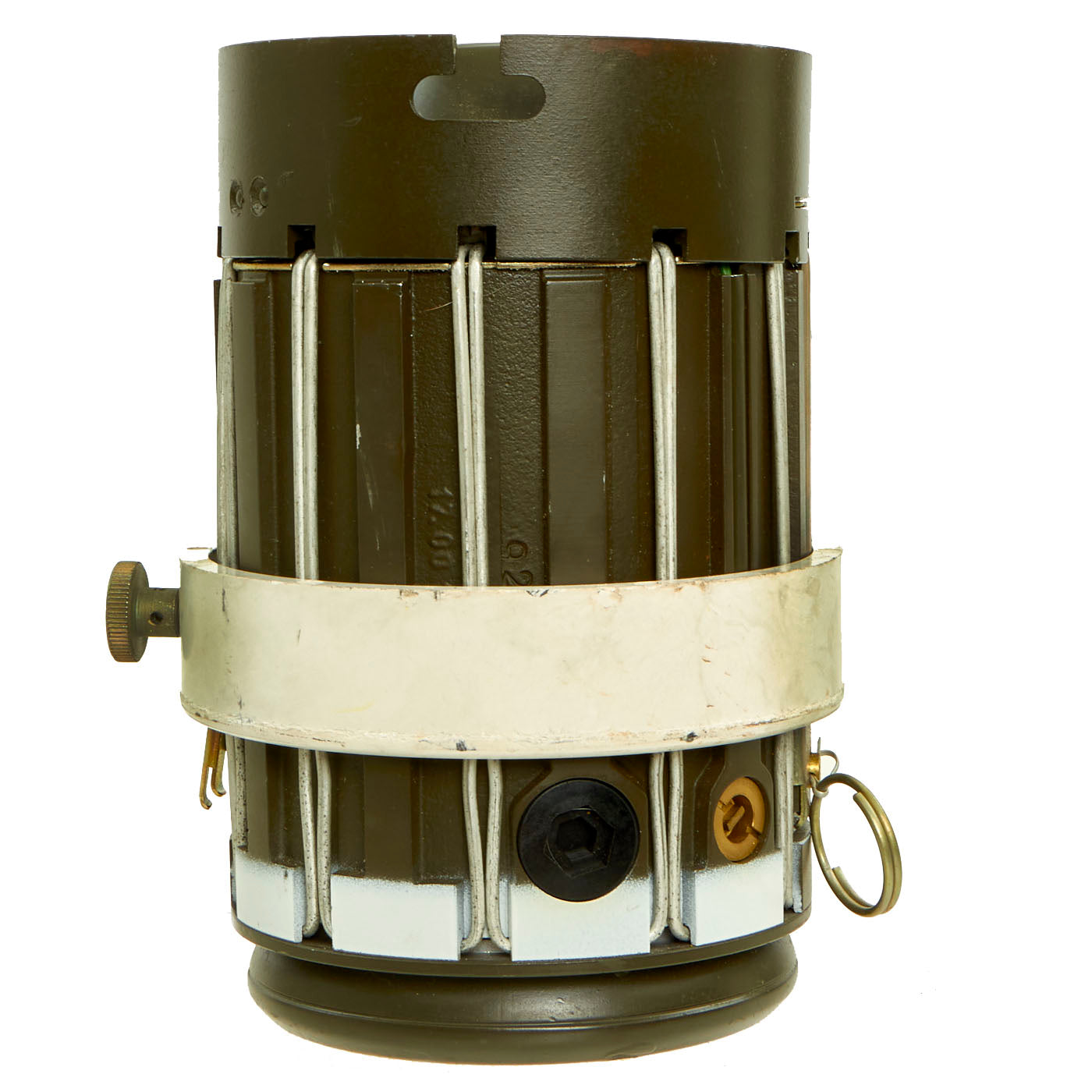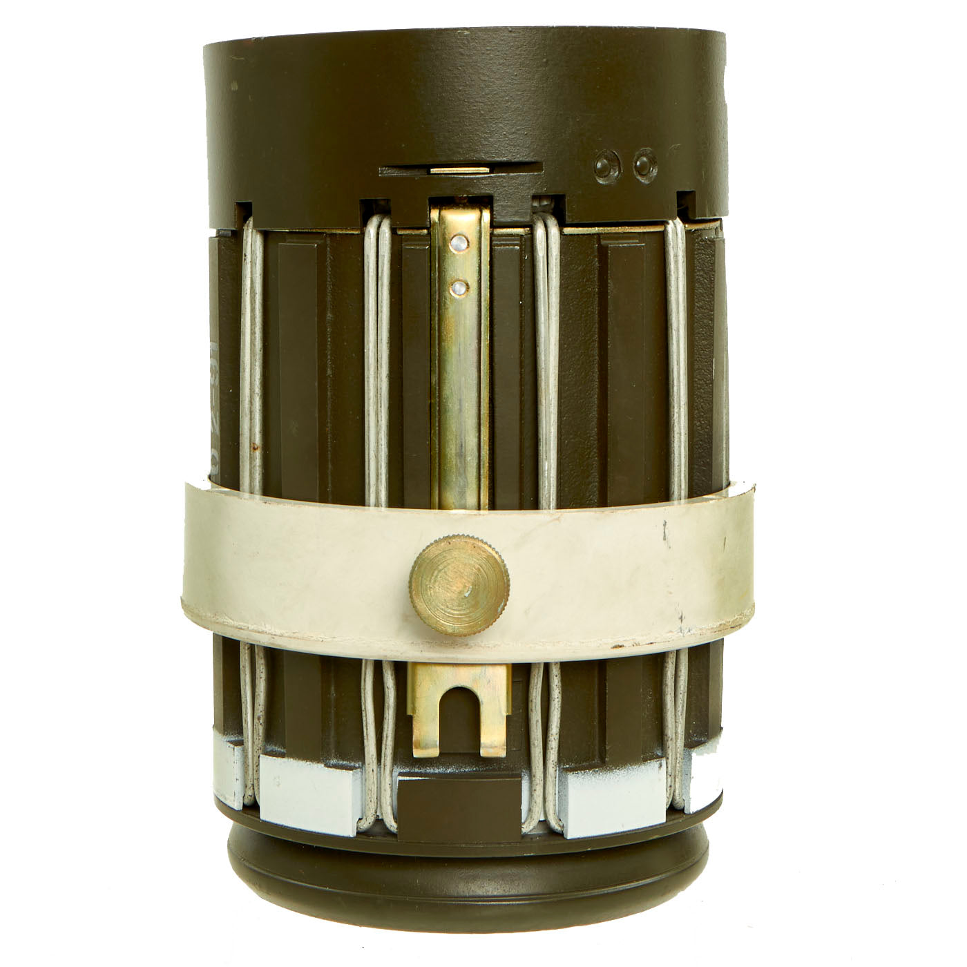 This training example is complete and retains all original markings on the outside of the canister as well as the orange parachute on the inside. There is no extensive damage but the top cone is dented in.