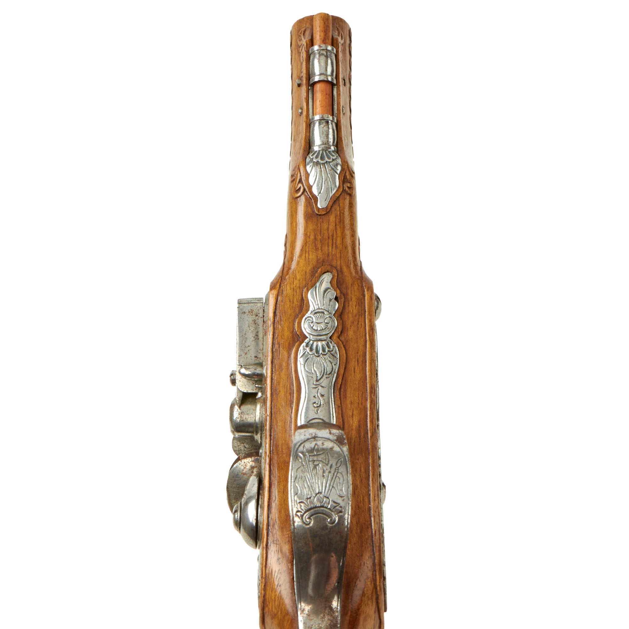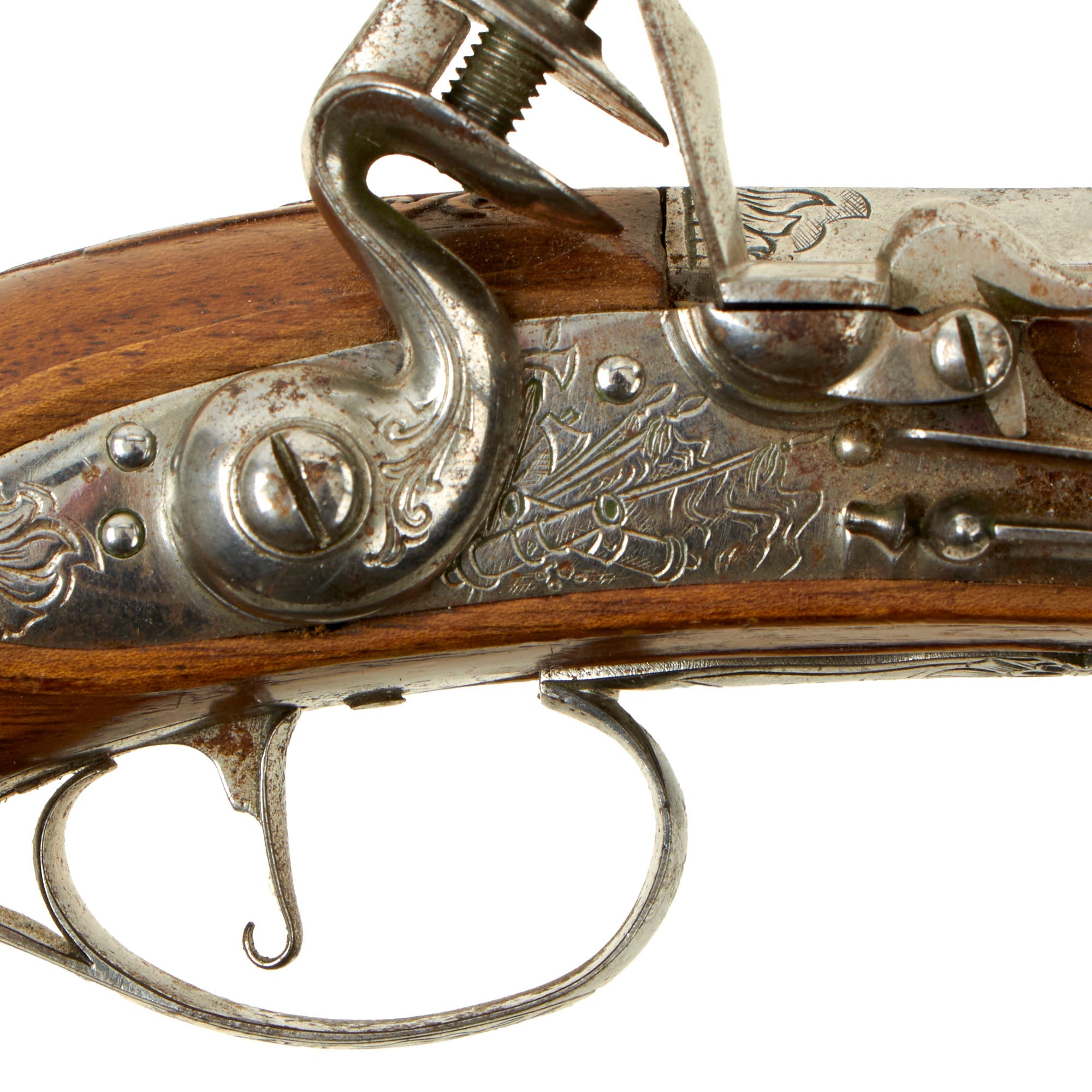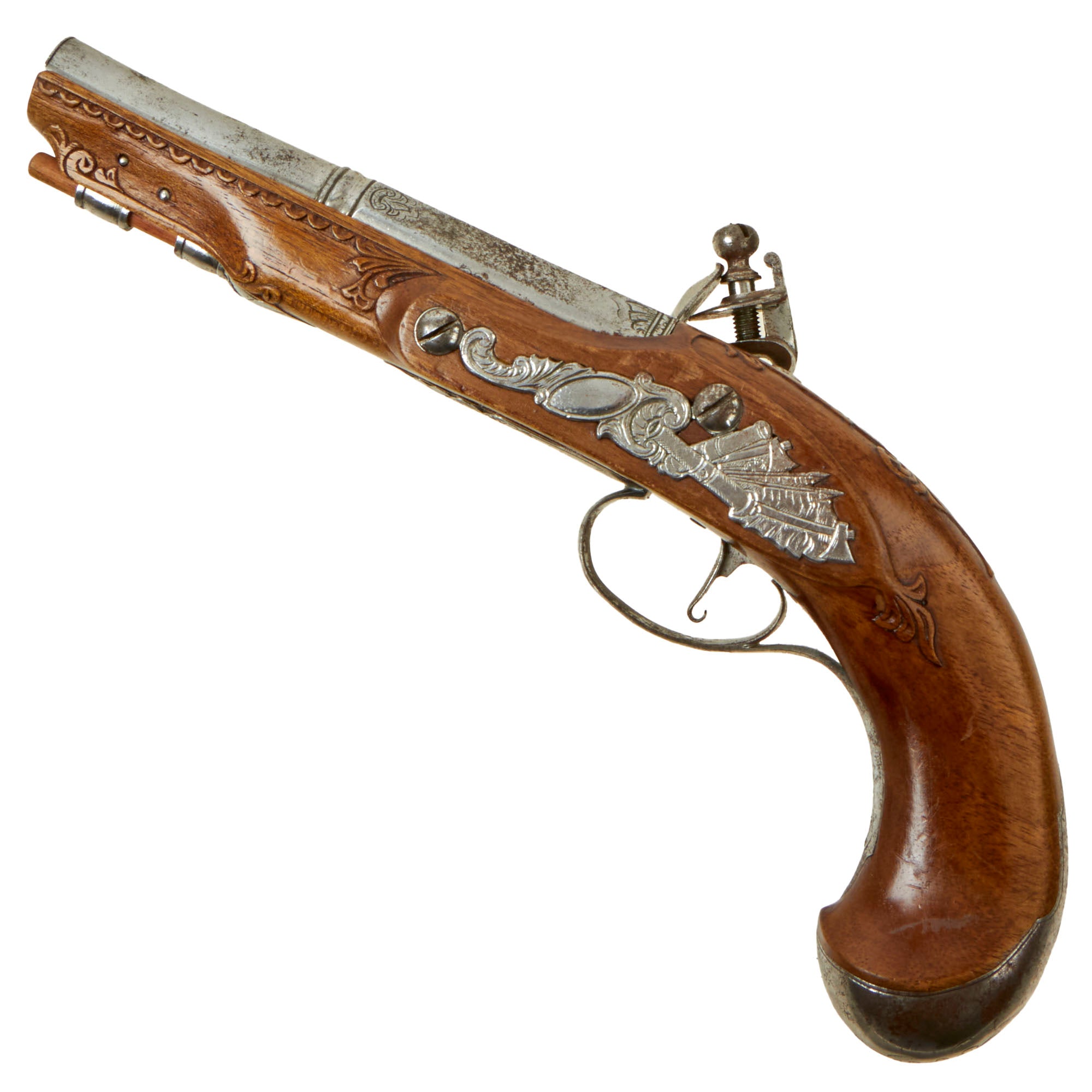 Original Item: One of a Kind. Now this is something that we have not had before! This is a truly lovely flintlock pocket pistol, which we believe originates from Poland. Located just to the east of Germany, the pistol shows some obvious similarities in design to the German pistols of the time. This example is definitely a very upmarket example, featuring fully engraved and embossed polished iron fittings, and the stock also has lovely carving and embellishments around the barrel and borders. The pistol definitely shows a level of artistry we are not used to seeing on something as utilitarian as a pocket pistol, so we assume it was made from some one who had money to spare.