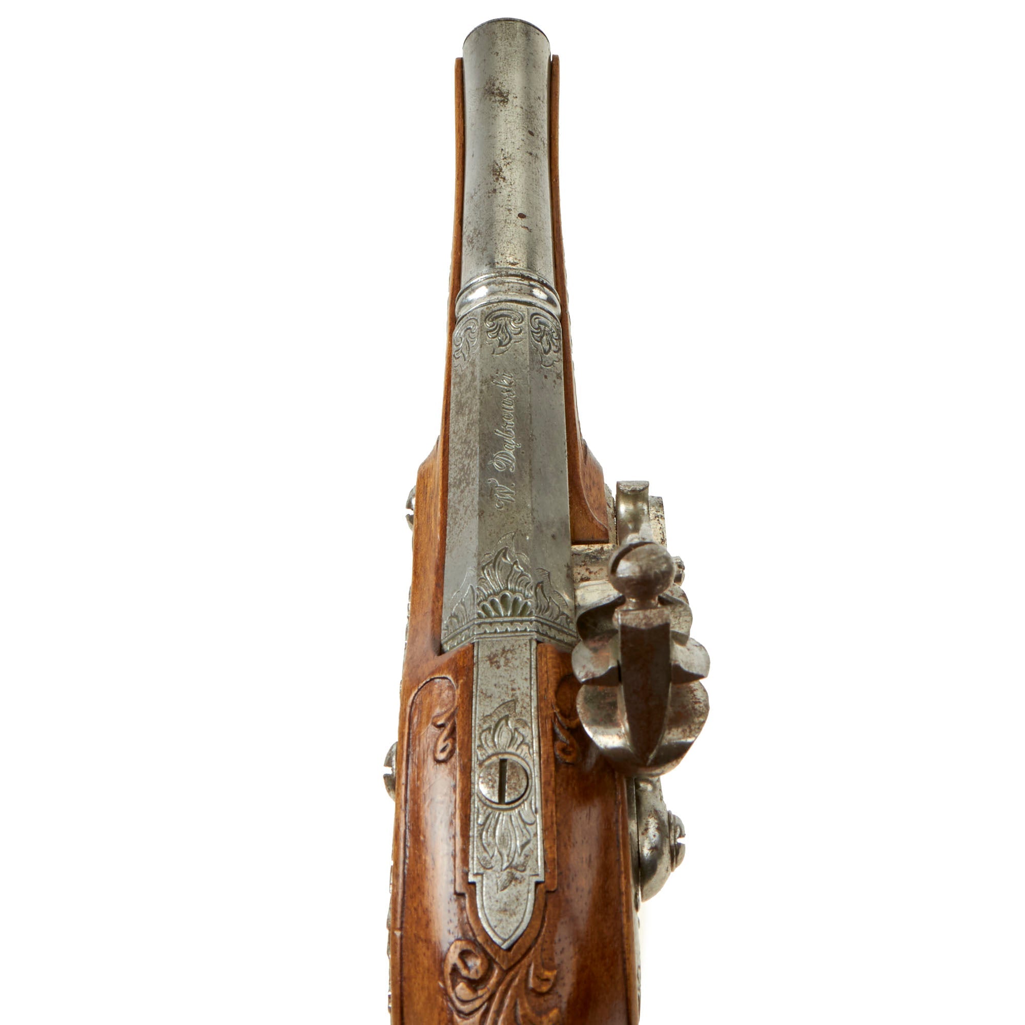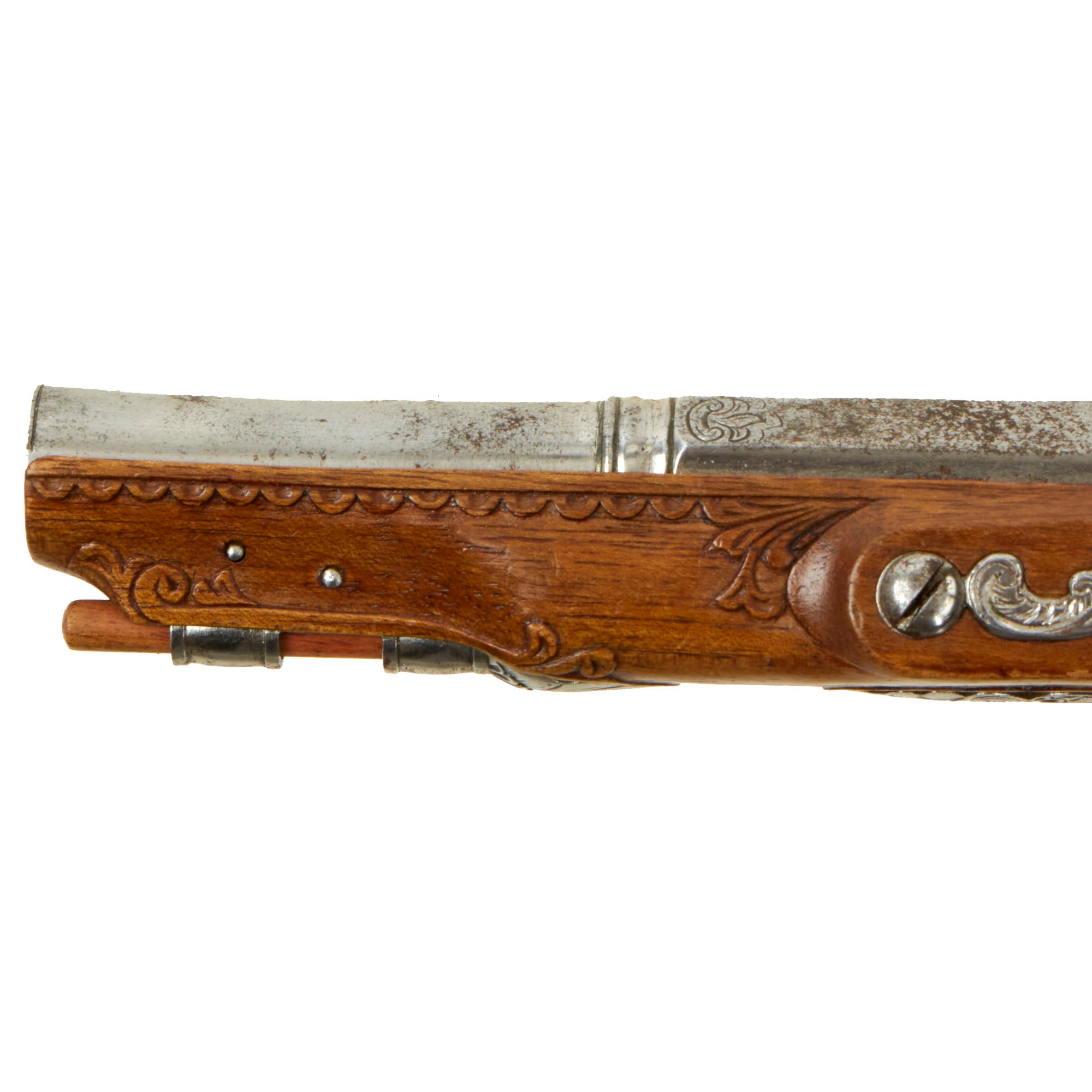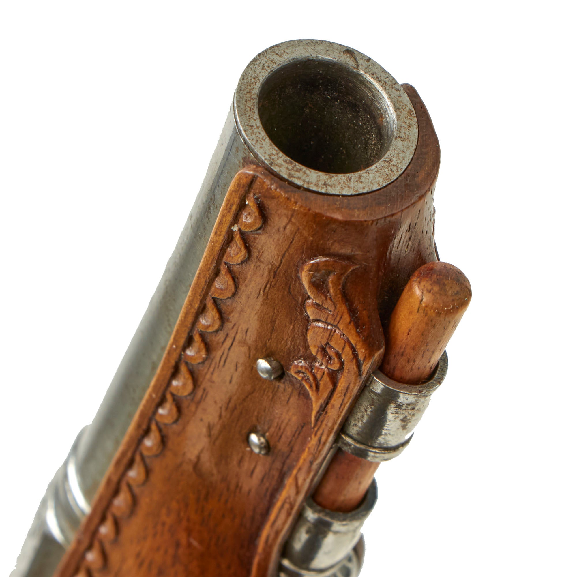 Original Item: One of a Kind. Now this is something that we have not had before! This is a truly lovely flintlock pocket pistol, which we believe originates from Poland. Located just to the east of Germany, the pistol shows some obvious similarities in design to the German pistols of the time. This example is definitely a very upmarket example, featuring fully engraved and embossed polished iron fittings, and the stock also has lovely carving and embellishments around the barrel and borders. The pistol definitely shows a level of artistry we are not used to seeing on something as utilitarian as a pocket pistol, so we assume it was made from some one who had money to spare.