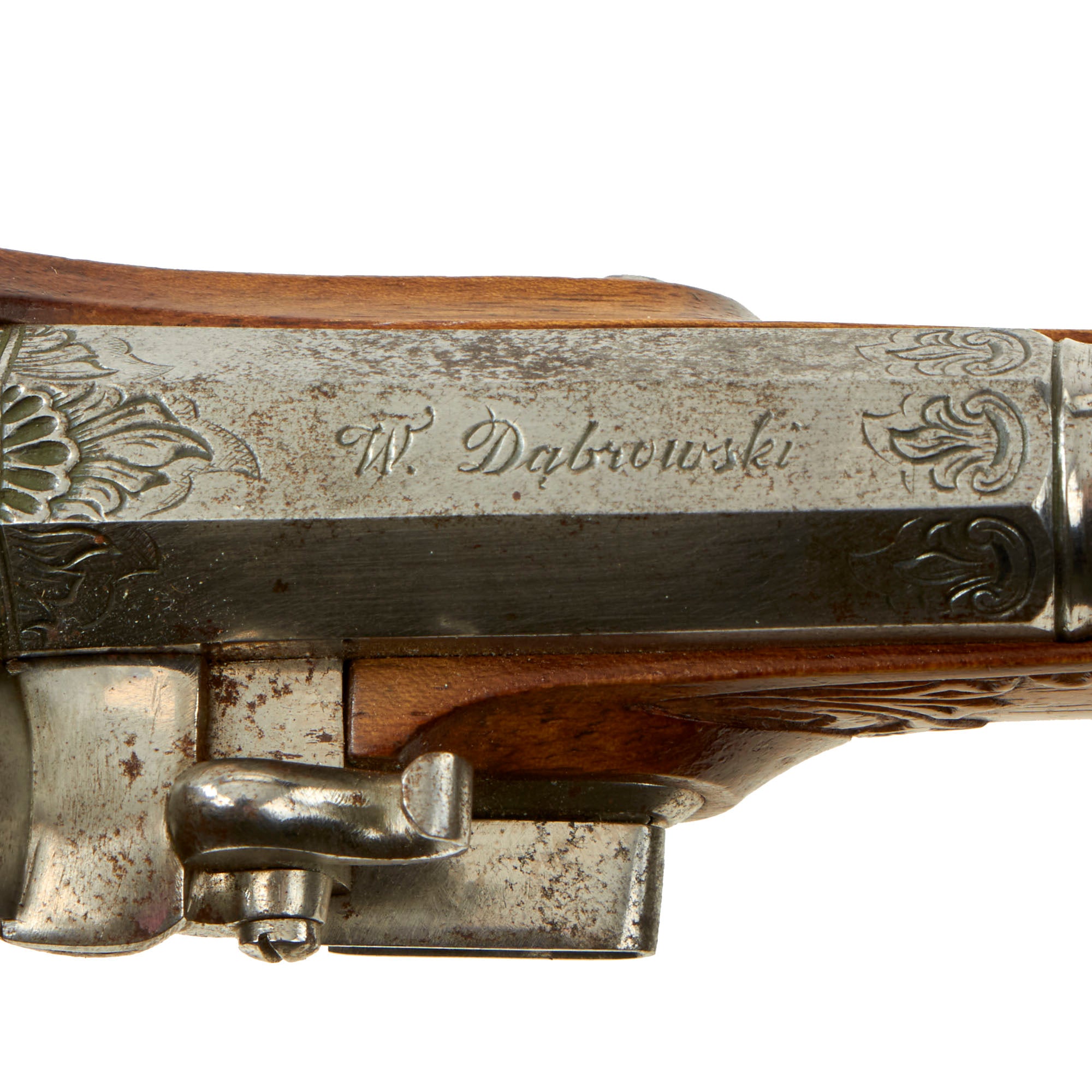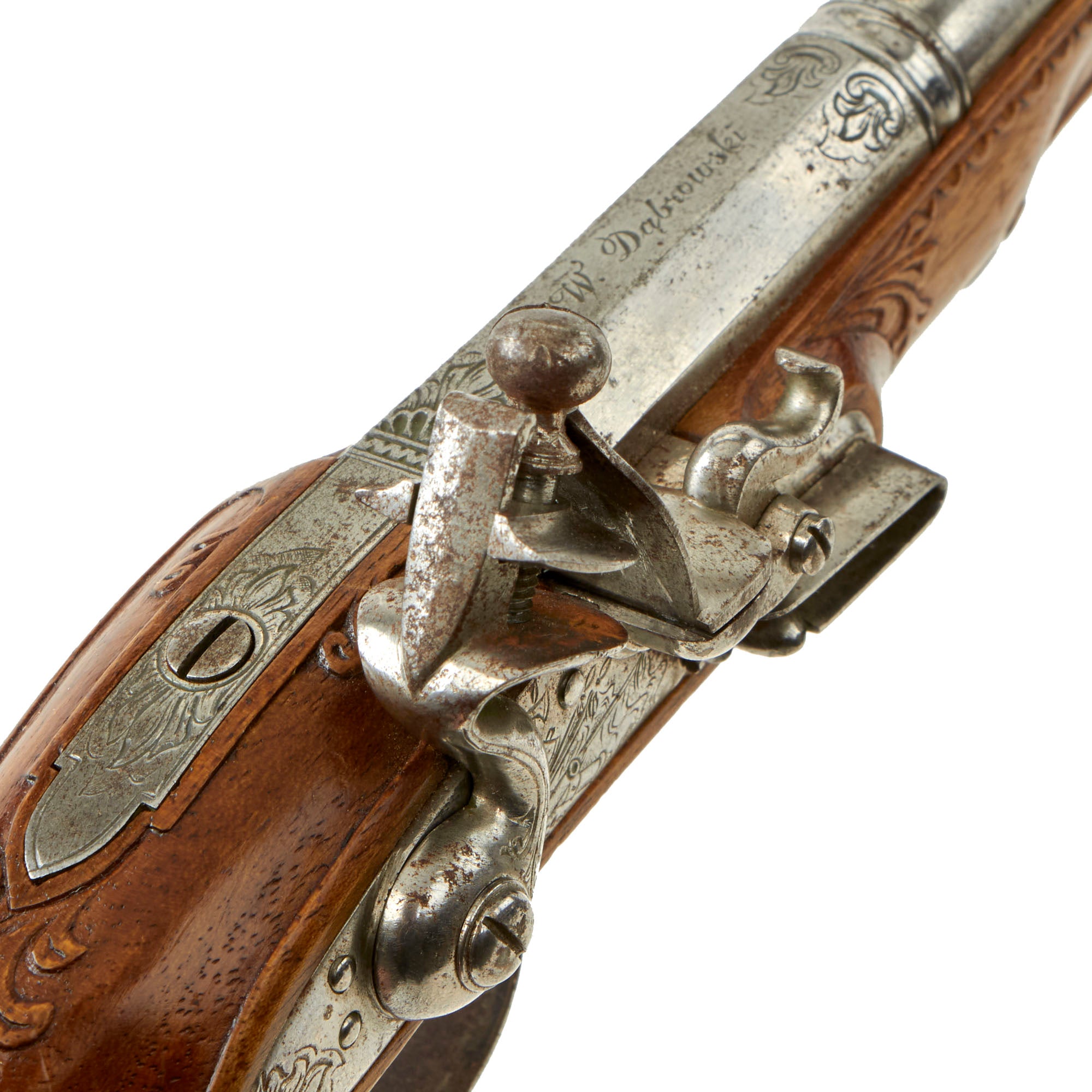 The only marking on the pistol is a script W. Dąbrowski on the top of the half-octagon barrel, located amidst some lovely engraved designs. Overall the pistol measures 9 inches in length, with a 4 3/4 inch .39" caliber smoothbore barrel. The lock and side plate both depict crossed cannons and other stands of arms, possibly indicating the owner was related to the Artillery in Poland. It is outfit for a ramrod, however the rod currently in the slot is just a replacement piece of wood. We assume that this originally had an iron ramrod with an enlarged head.