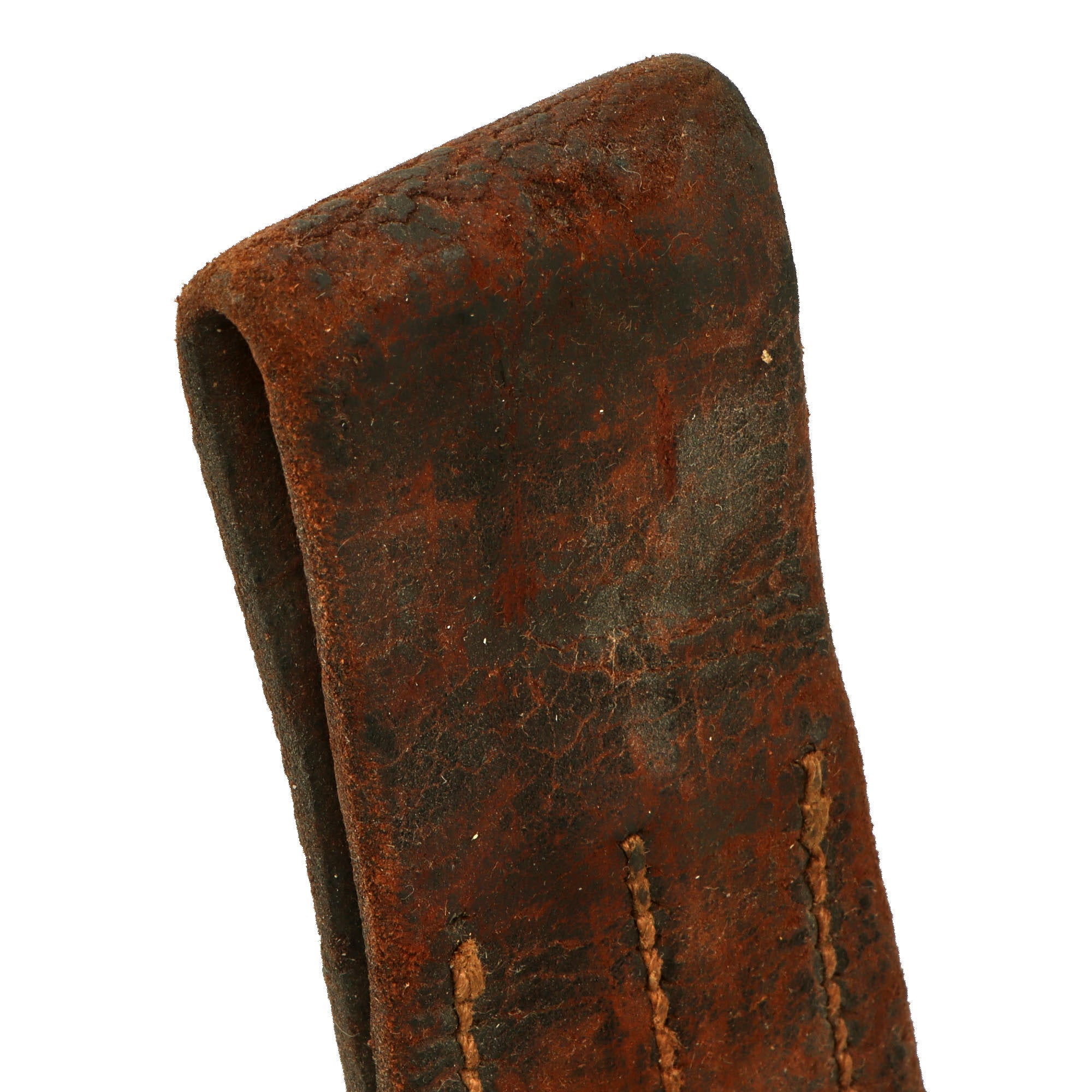 The scabbard now shows extremely heavy oxidation pitting along its length and is held in an original Polish leather frog which has breakage in the leather strap. The leather of the frog now shows some dry rot and other damage.