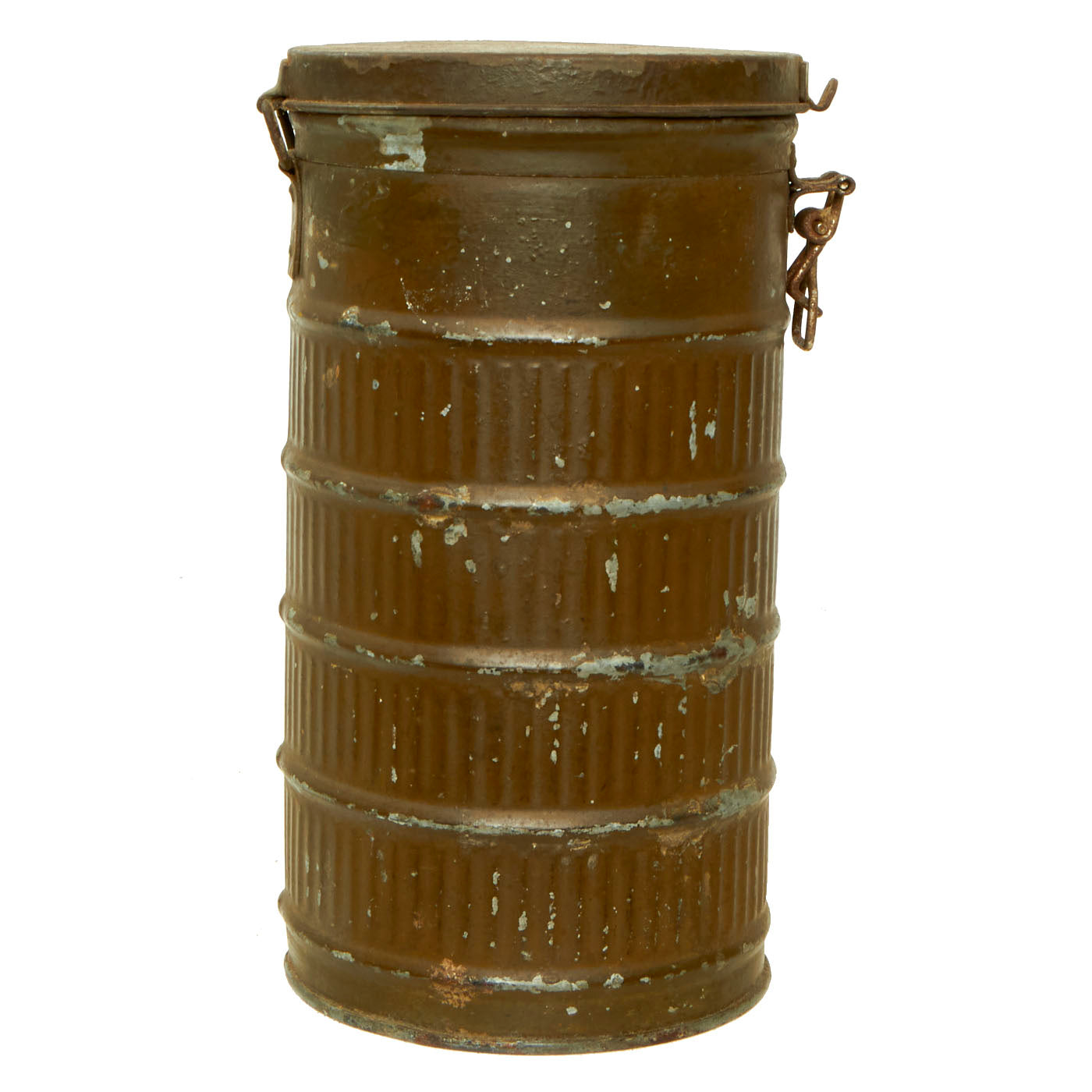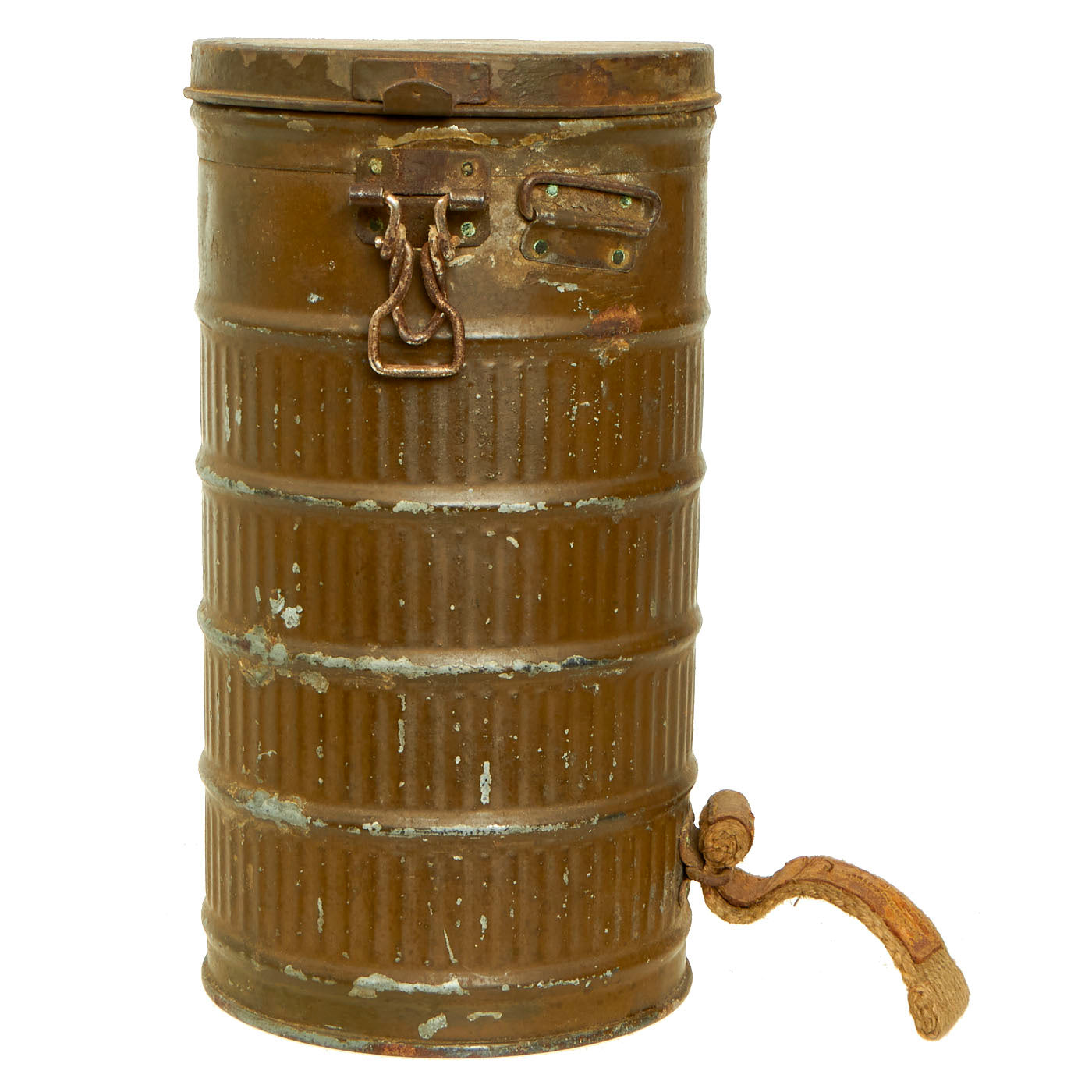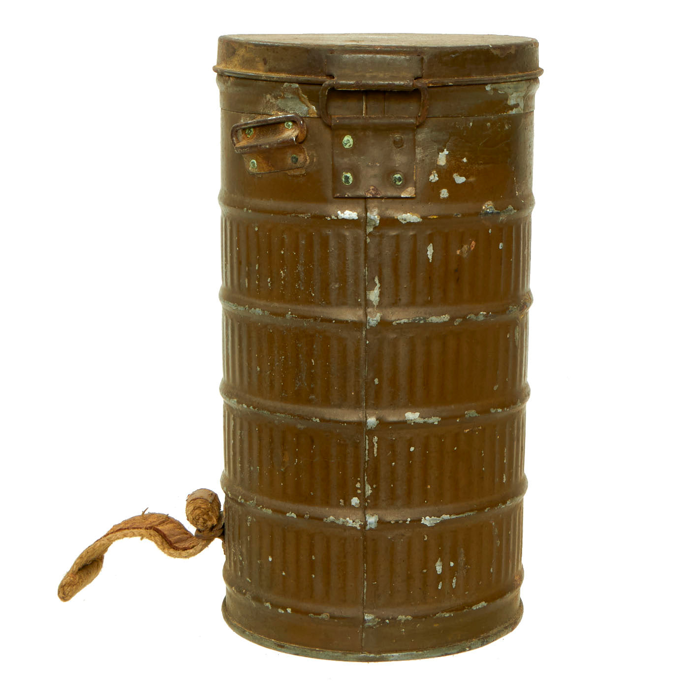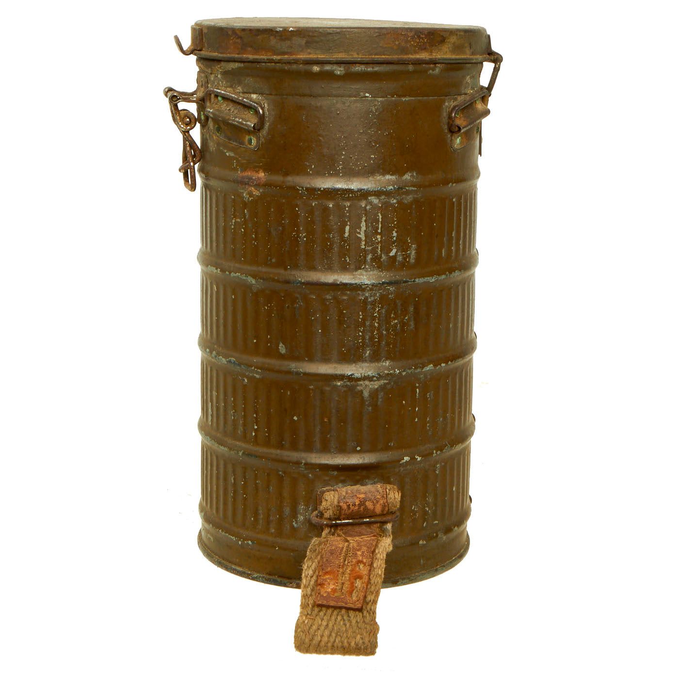 The Wz.24 consists of a face part with a harness and a filter. The set also includes the 9 ½”tall cylindrical can for carrying the mask, filter and spare lenses. The facial area is anatomically shaped and made of two layers. The outer layer is a cotton fabric attached on the inside of a protective color. Eyeglass lenses are made in two variants - glass or celluloid (hydrocellulose, cellophane) with this example being celluloid. They are framed with aluminum rings. These rings, in turn, are attached to a rubber frame glued between both layers of the facepiece and additionally stitched. The headband of the mask is made of elastic bands (two frontal, two parietal, occipital and clasp). In addition, the mask is equipped with an inelastic strap that allows it to be hung around the neck during a gas emergency.