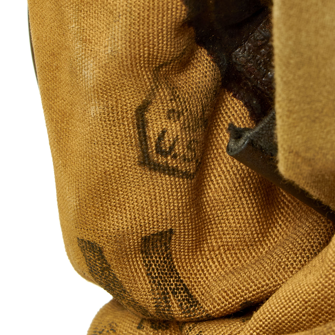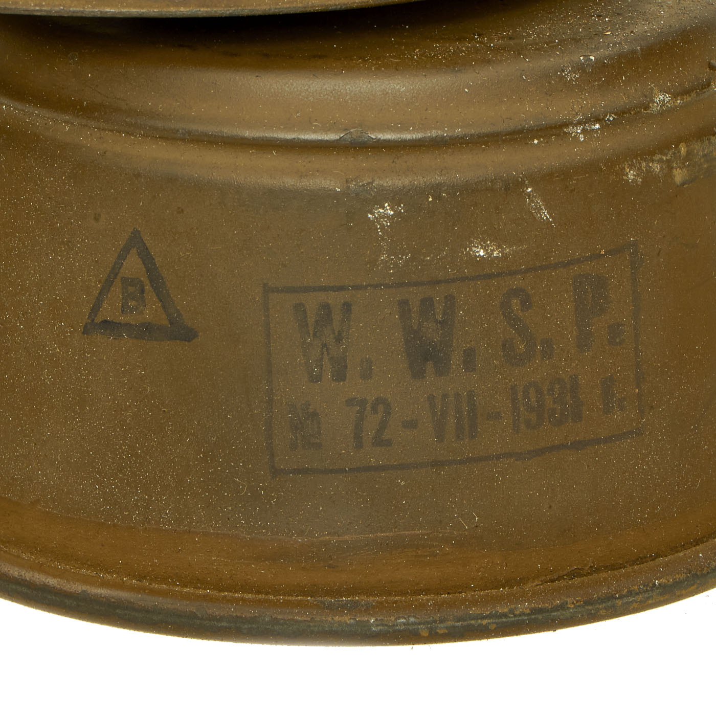 The mask itself has a date of 1931 stamped on the bottom of the steel base, and the filter also has a 1931 date stamped on the top. Unfortunately, the mask has been stored inside of the canister probably since the start of WWII and is now quite stiff. We did not try to loosen up the material due to risk damaging the mask. There are multiple other Polish arsenal markings that we can see but cannot read. One of the eye cups is completely separated from the mask.