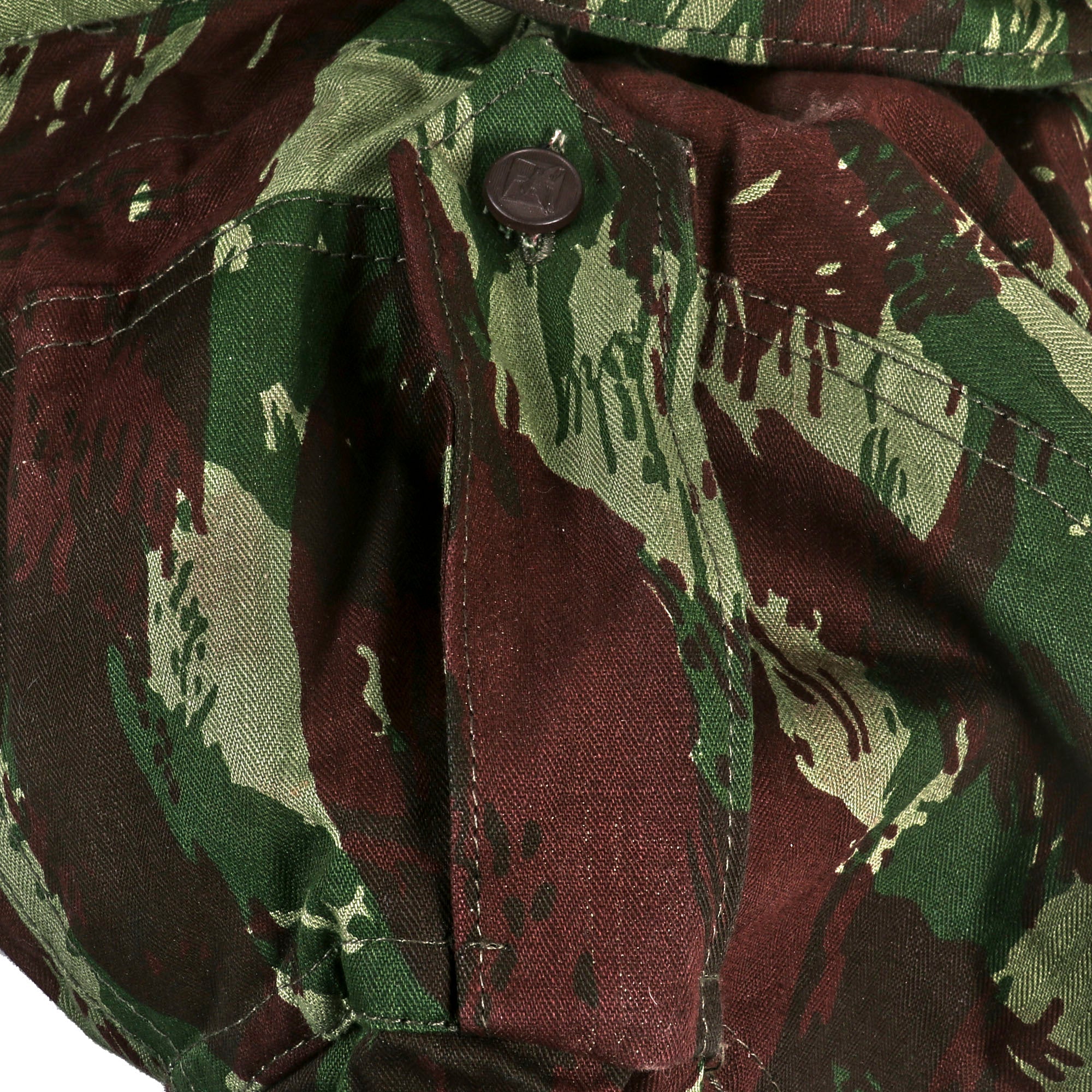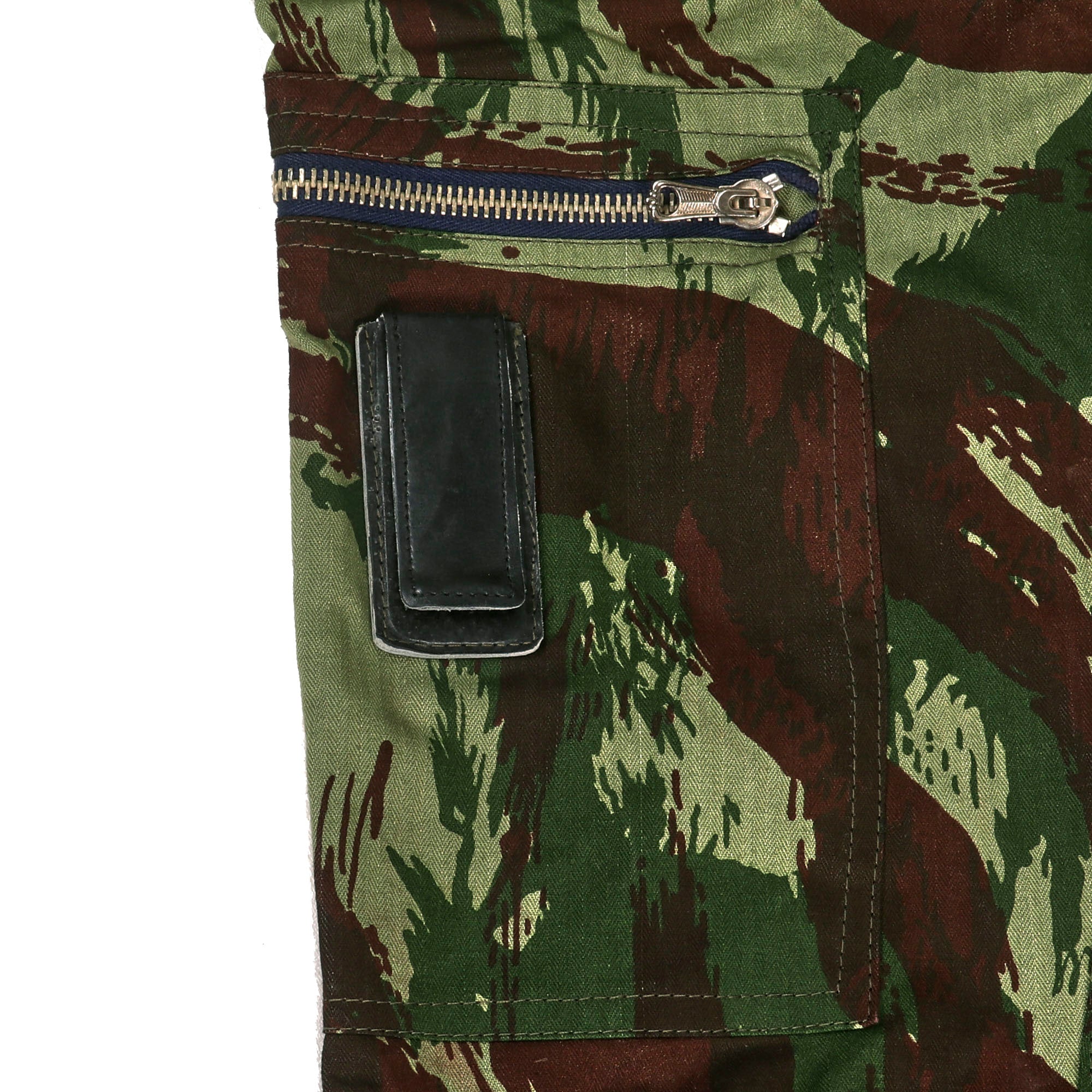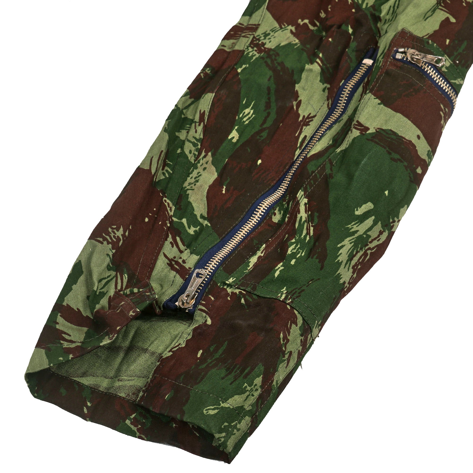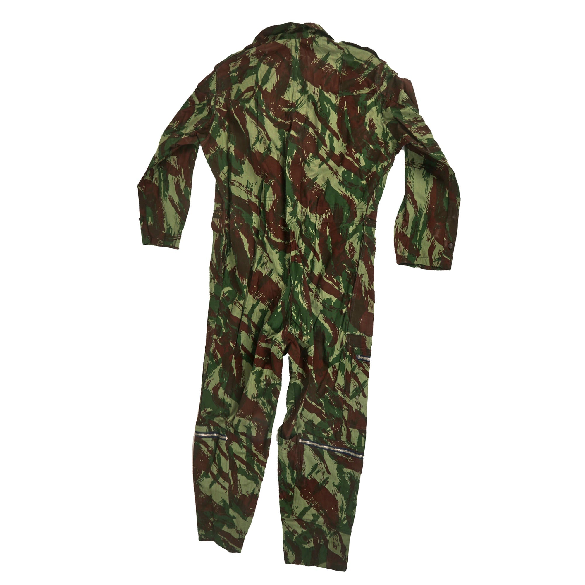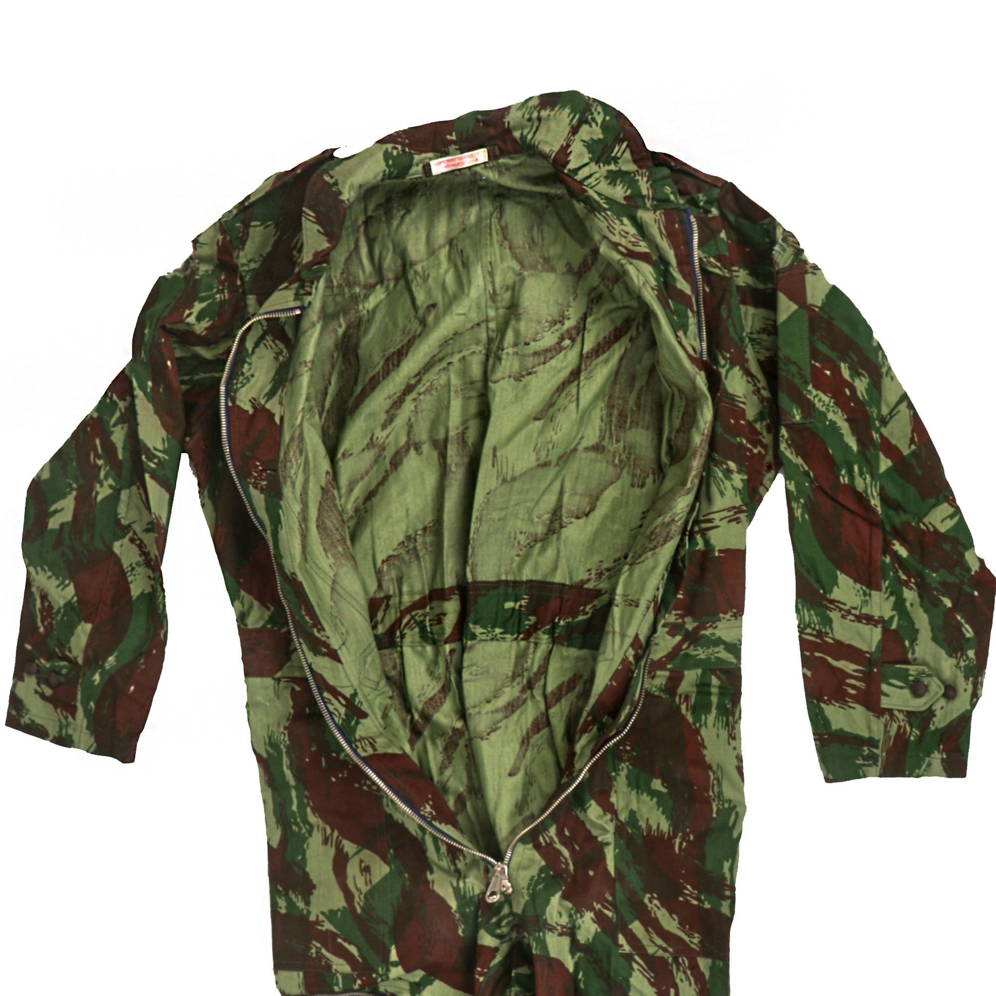 Original Item: Only One Available. This is a wonderful example of a near mint condition flight suit in TAP 47 “Lizard” camouflage, as used by the Portuguese forces during the Colonial War. The lizard pattern is a family of many related designs of military camouflage pattern, first used by the French Army on uniforms from 1947 to the late 1980s. It was based on the British paratroopers' Denison smock. The use of the pattern is widespread in Africa, despite its association with France, because armed factions and militaries tend to obtain them from whichever source has it available.