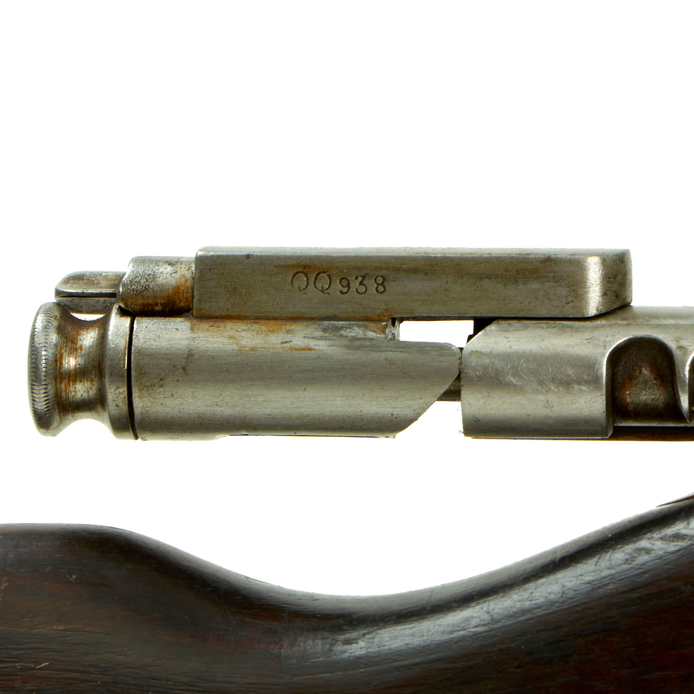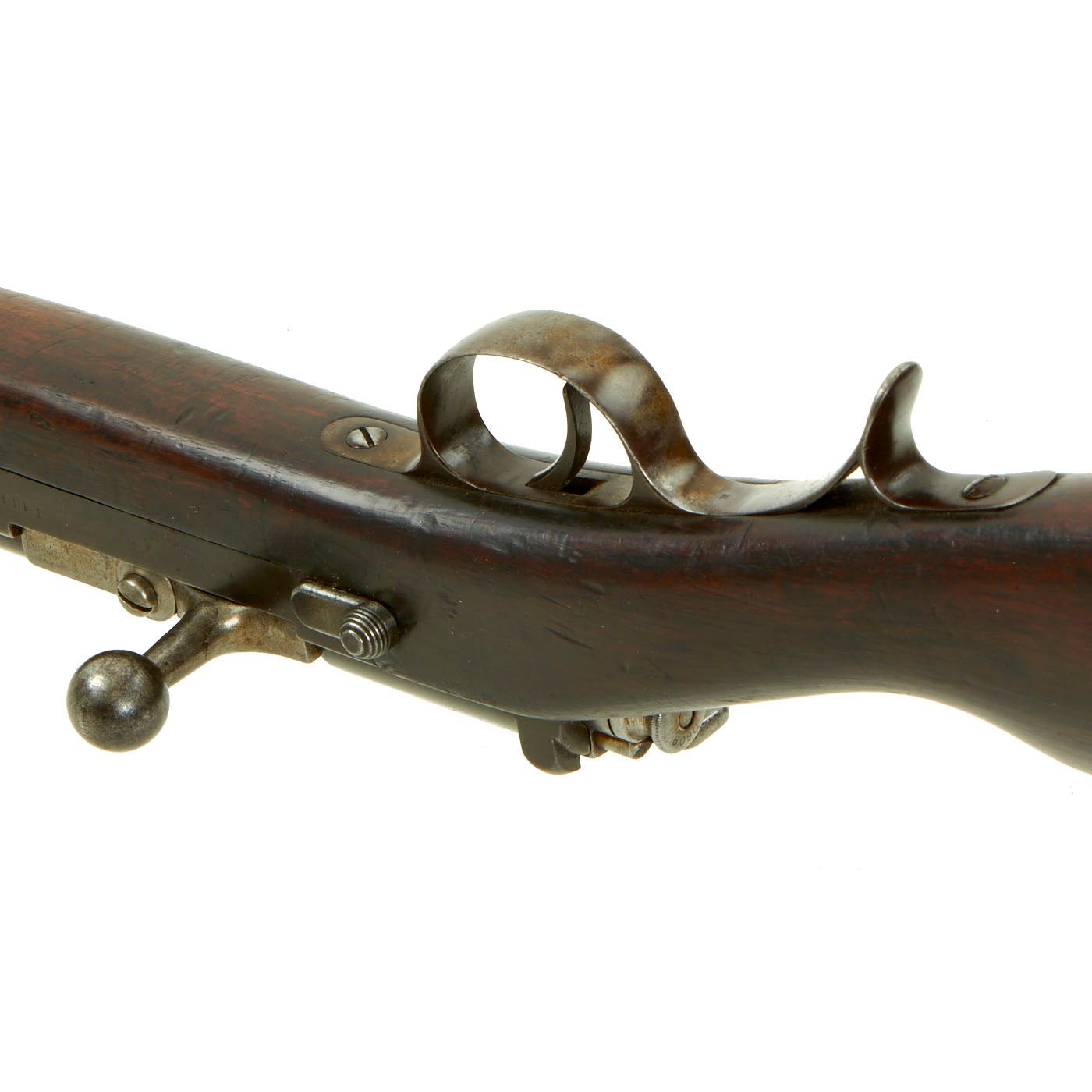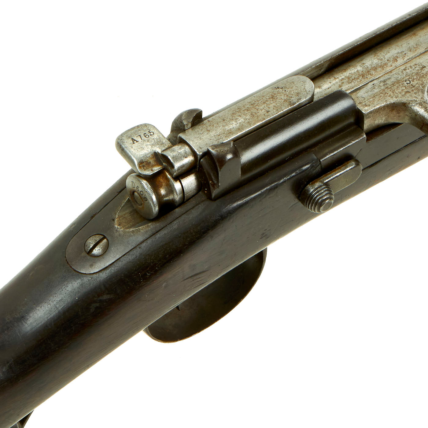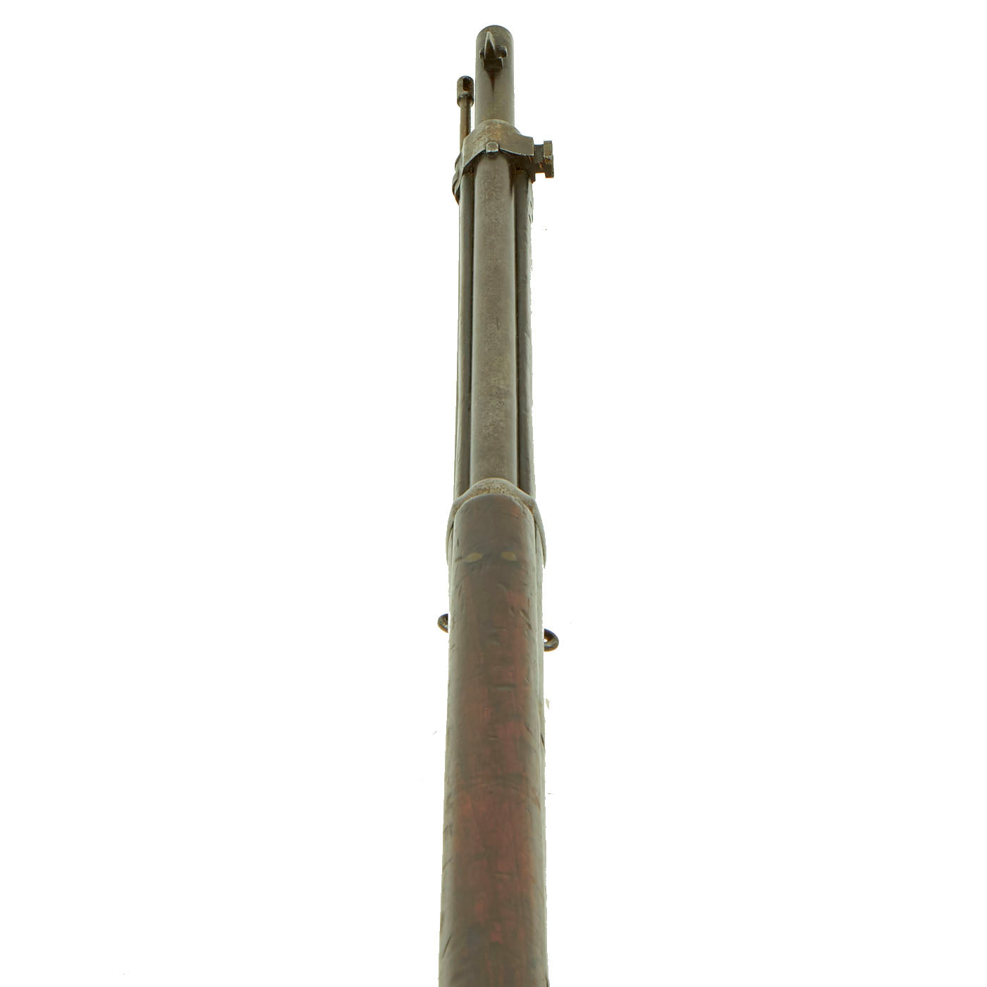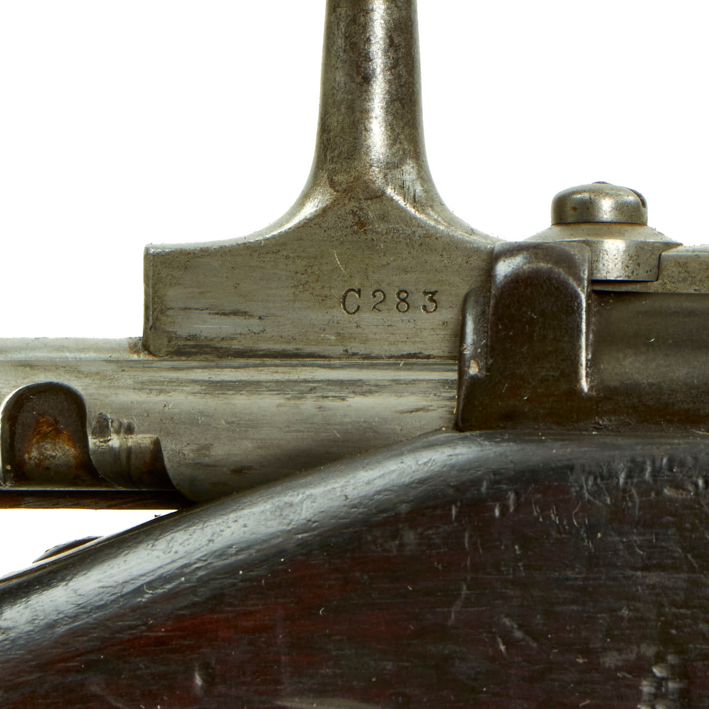 Offered in very good service used condition with both sling swivels and original side mounted cleaning rod present. The bore is in very good condition, with crisp lands and grooves and a mostly bright finish. The grooves are bit dark from use and fouling, but overall this is a great bore considering the colonial service. The rifle cycles correctly, and the magazine cutoff functions as designed. The rear sight is fully functional and complete.