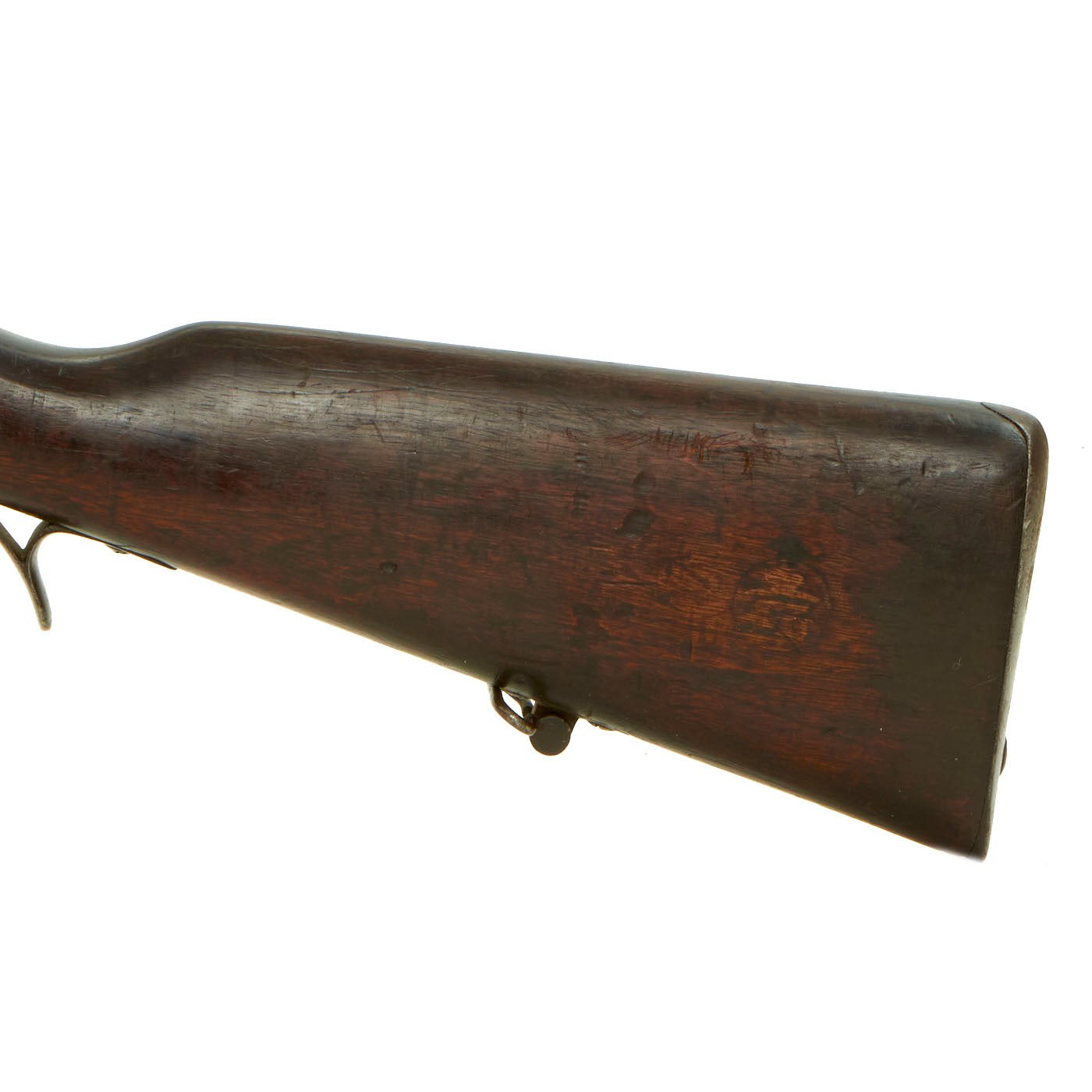 Serial number I111 is marked on the barrel and receiver, while the bolt is a non matching arsenal replacement with three different serial numbers. This is very common to see on these rifles, which were in service for some time, especially the colonial service examples. The receiver bears a very faint L.I., for King LUIS 1st who reigned 1838 until 1889, with the "Crown" marking above worn away.