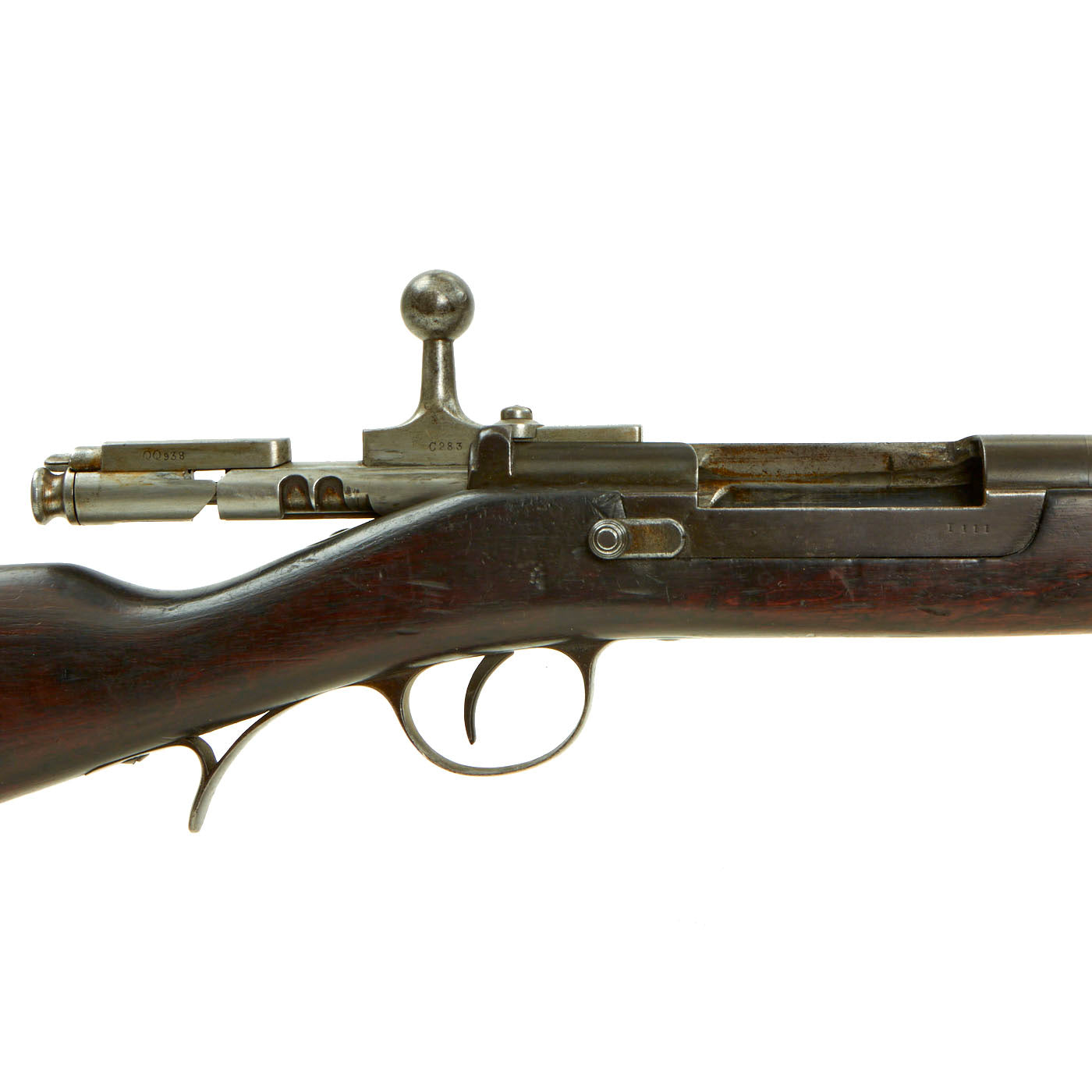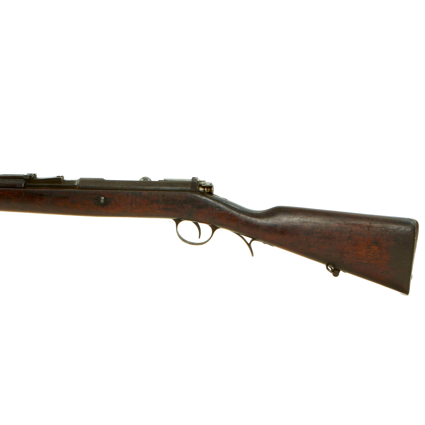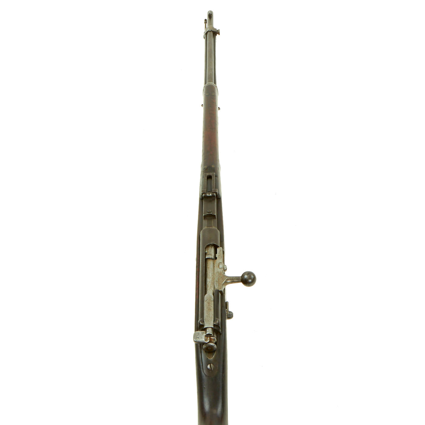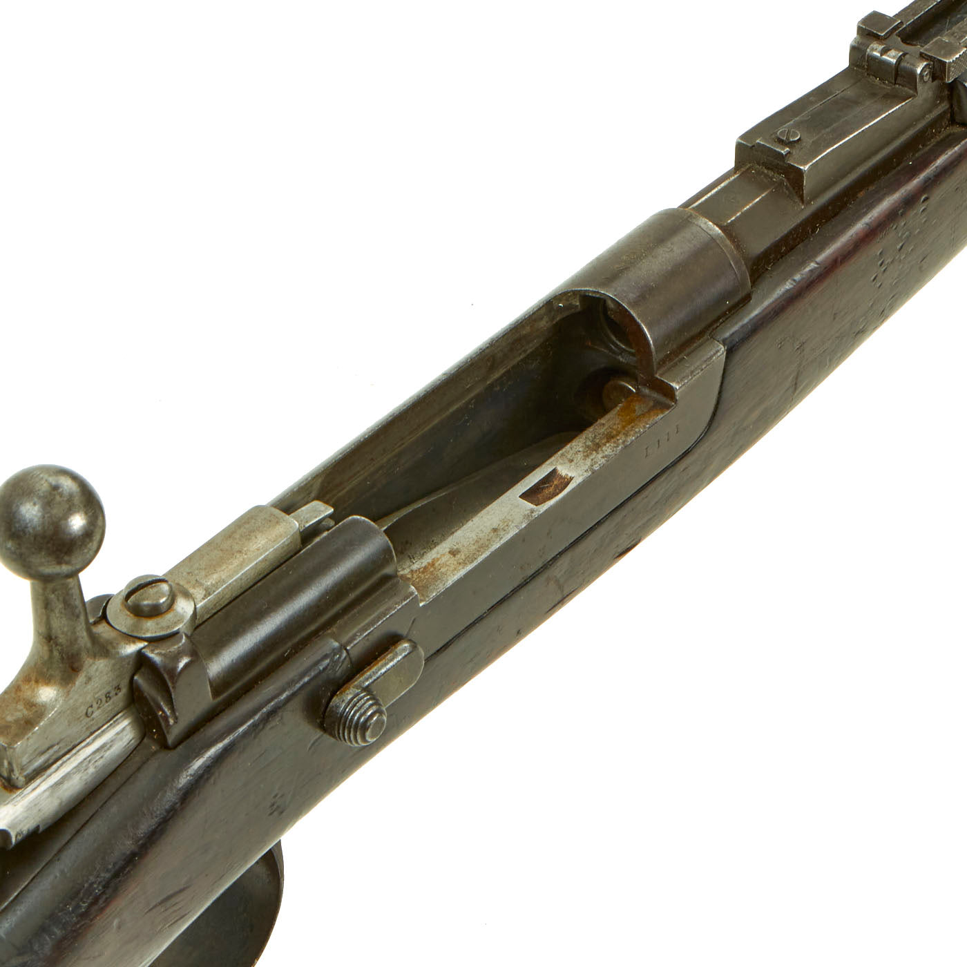 Our example is an very good condition long colonial rifle version officially designated the Espingarda de Infantaria 8 mm m/1886/89: 8 mm Infantry Rifle. It is fitted with a 32.3" barrel and a full length 8 round tube magazine under the barrel. The only difference between the m/1866 and m/1886/89 is the addition of a wooden handguard on top of the barrel for colonial service. This is the first example we have had of one with an intact handguard, which were retrofitted onto the already produced m/1886 rifles.