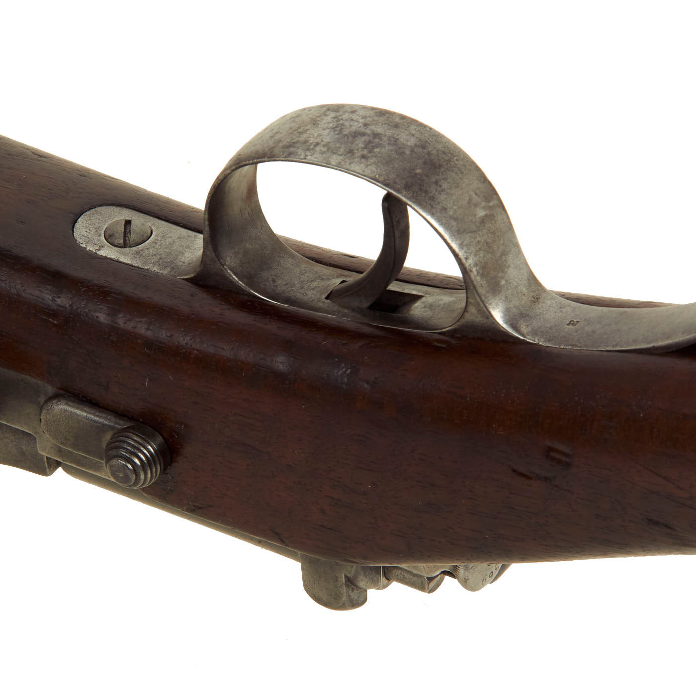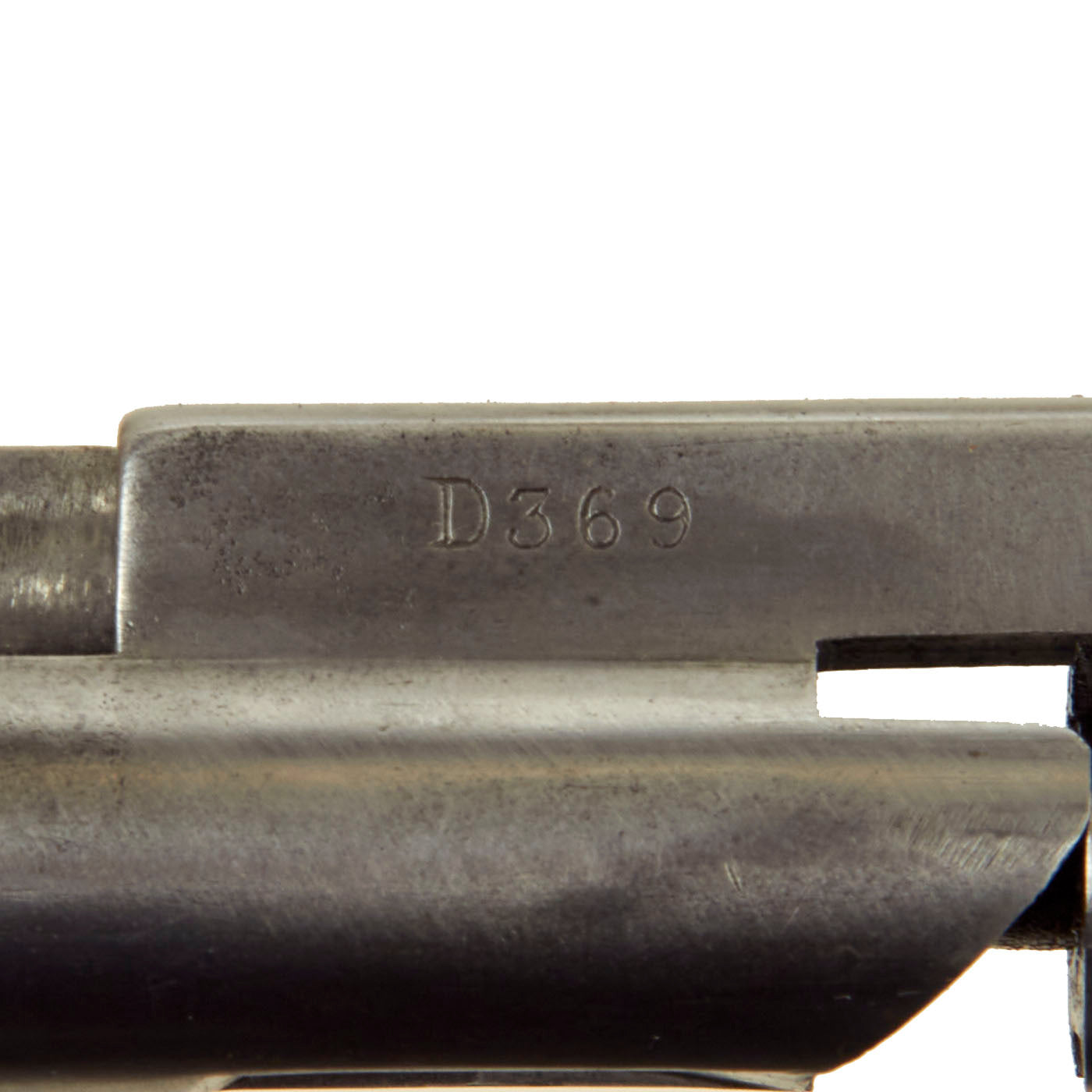 Offered in very good service used condition with both sling swivels and original side mounted cleaning rod present. The bore is in good condition, with clear lands and grooves and a part bright finish. The grooves are bit dark from use and fouling, and the lands rounded, but overall this is a great bore considering the colonial service. The rifle cycles correctly, and the magazine cutoff functions as designed. The rear sight is fully functional and complete.