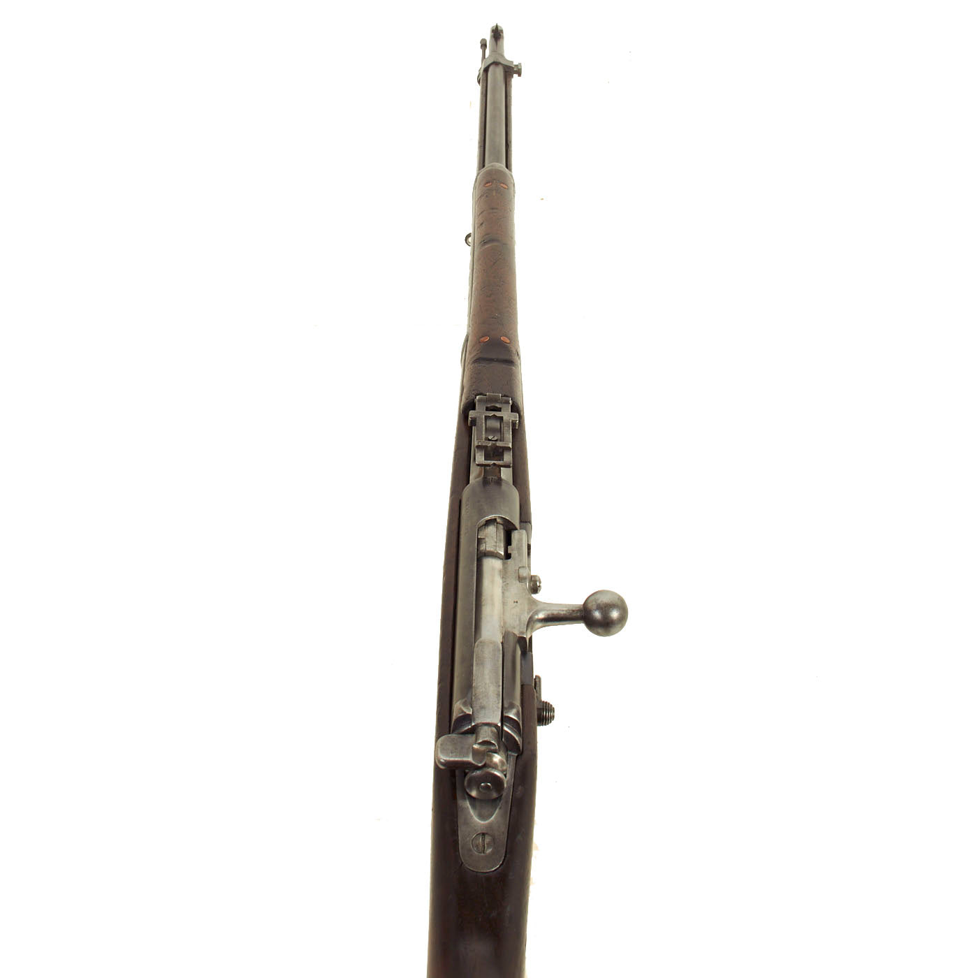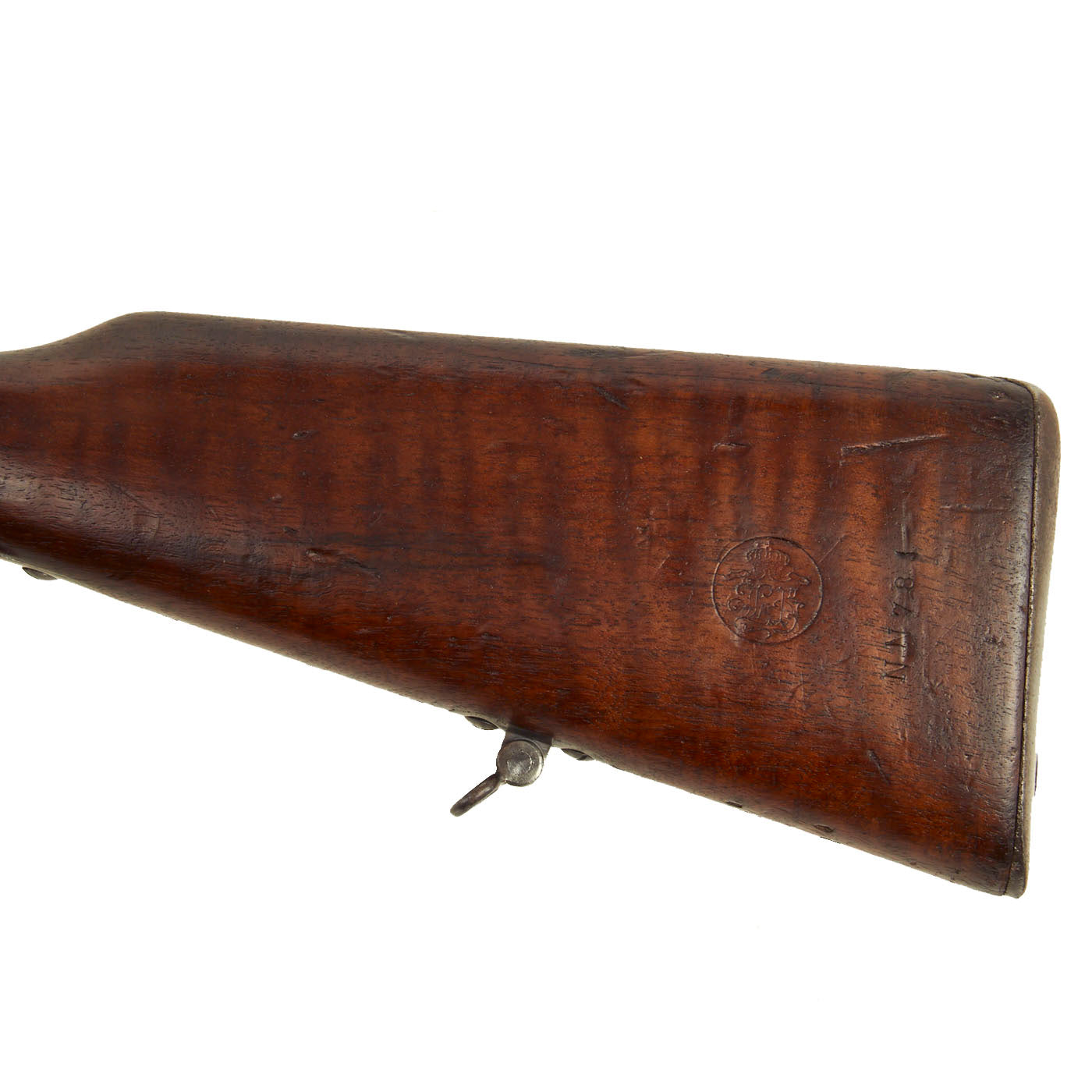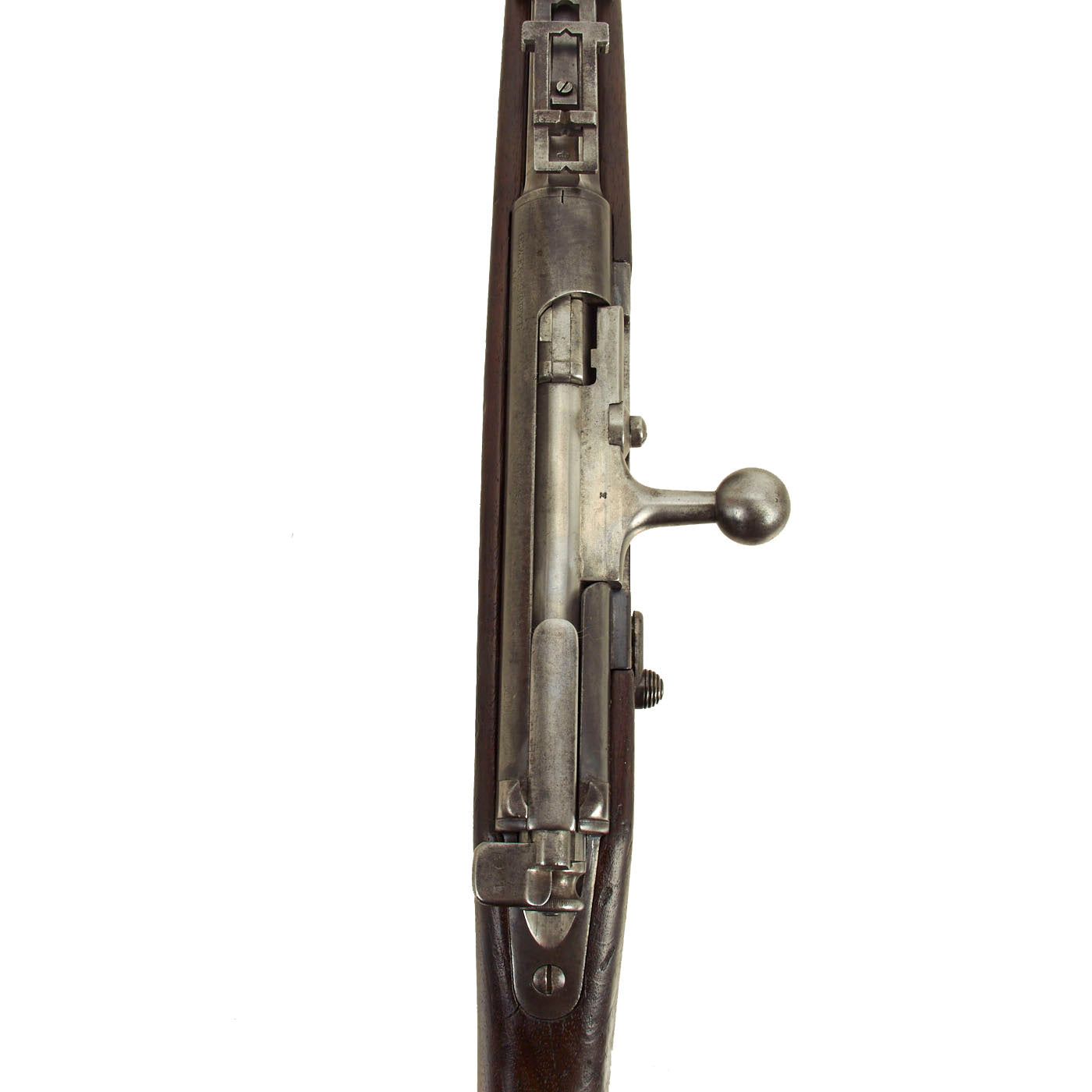 Our example is an very good condition long colonial rifle version officially designated the Espingarda de Infantaria 8 mm m/1886/89: 8 mm Infantry Rifle. It is fitted with a 32.3" barrel and a full length 8 round tube magazine under the barrel. The only difference between the m/1866 and m/1886/89 is the addition of a wooden handguard on top of the barrel for colonial service. This is only the second example we have had of one with an intact handguard, which were retrofitted onto the already produced m/1886 rifles.