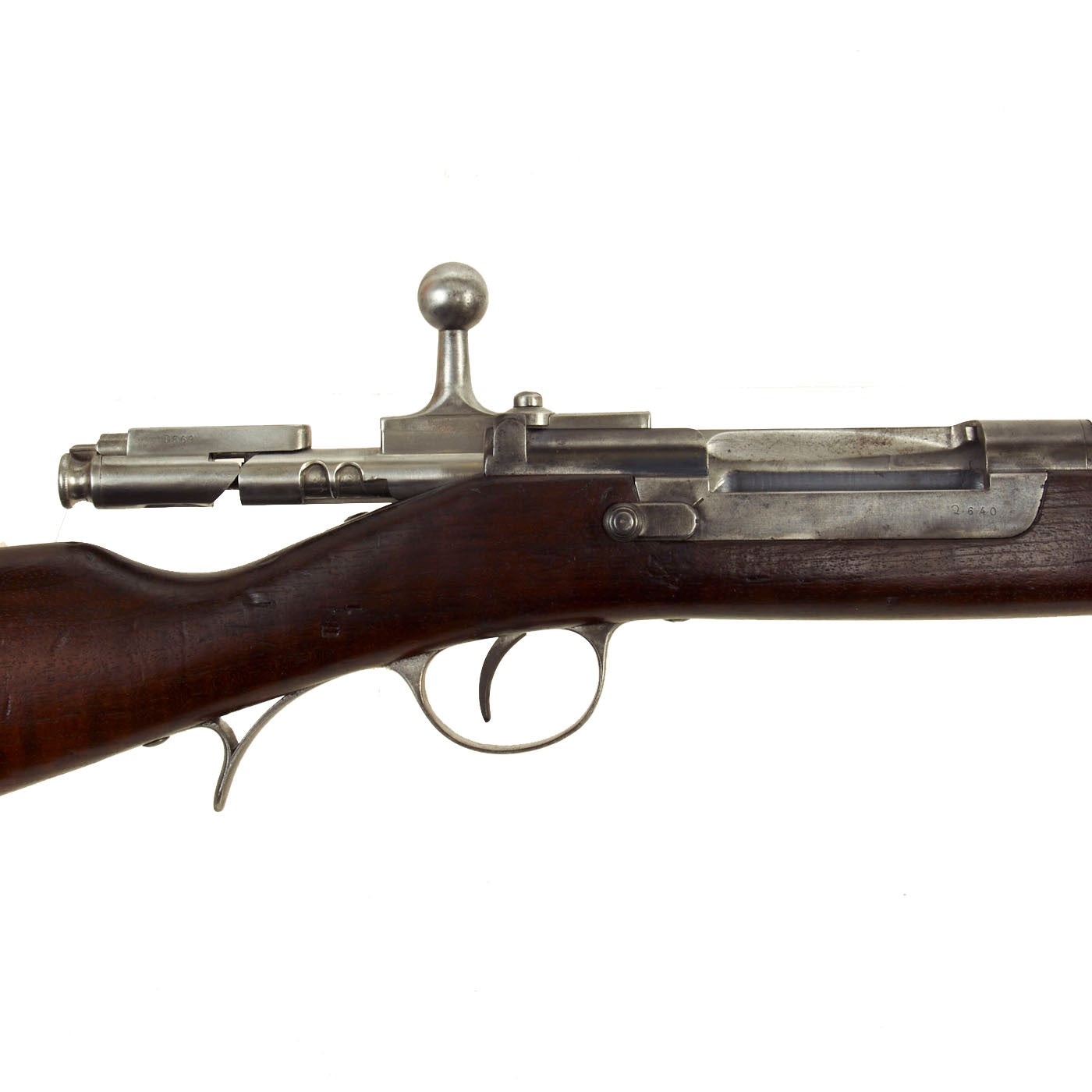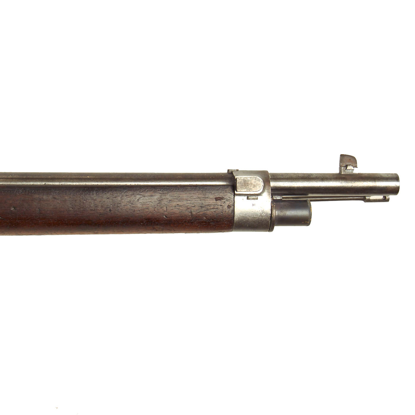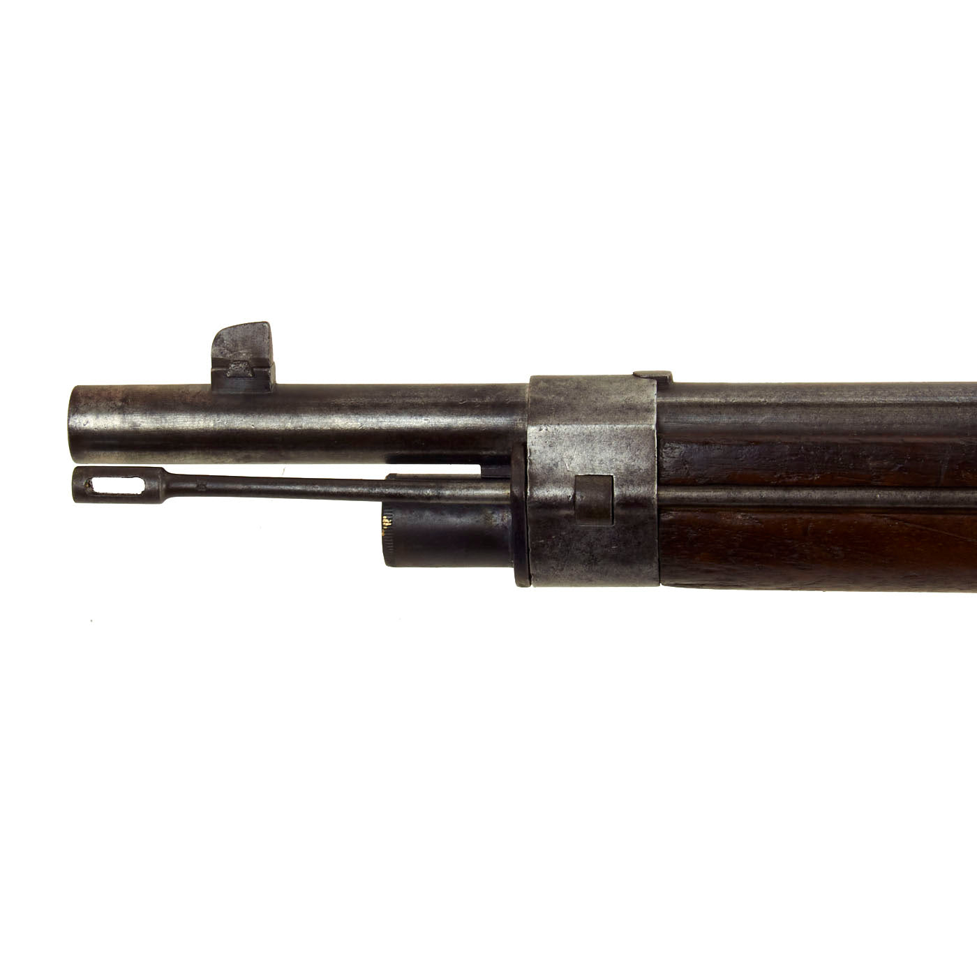 Our example is an very good condition long colonial rifle version officially designated the Espingarda de Infantaria 8 mm m/1886/89: 8 mm Infantry Rifle. It is fitted with a 32.3" barrel and a full length 8 round tube magazine under the barrel. The only difference between the m/1866 and m/1886/89 is the addition of a wooden handguard on top of the barrel for colonial service. This is only the second example we have had of one with an intact handguard, which were retrofitted onto the already produced m/1886 rifles.