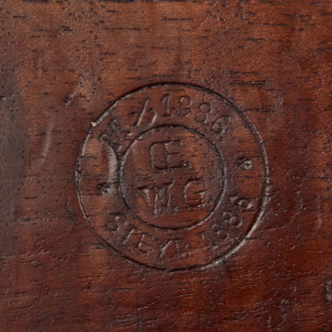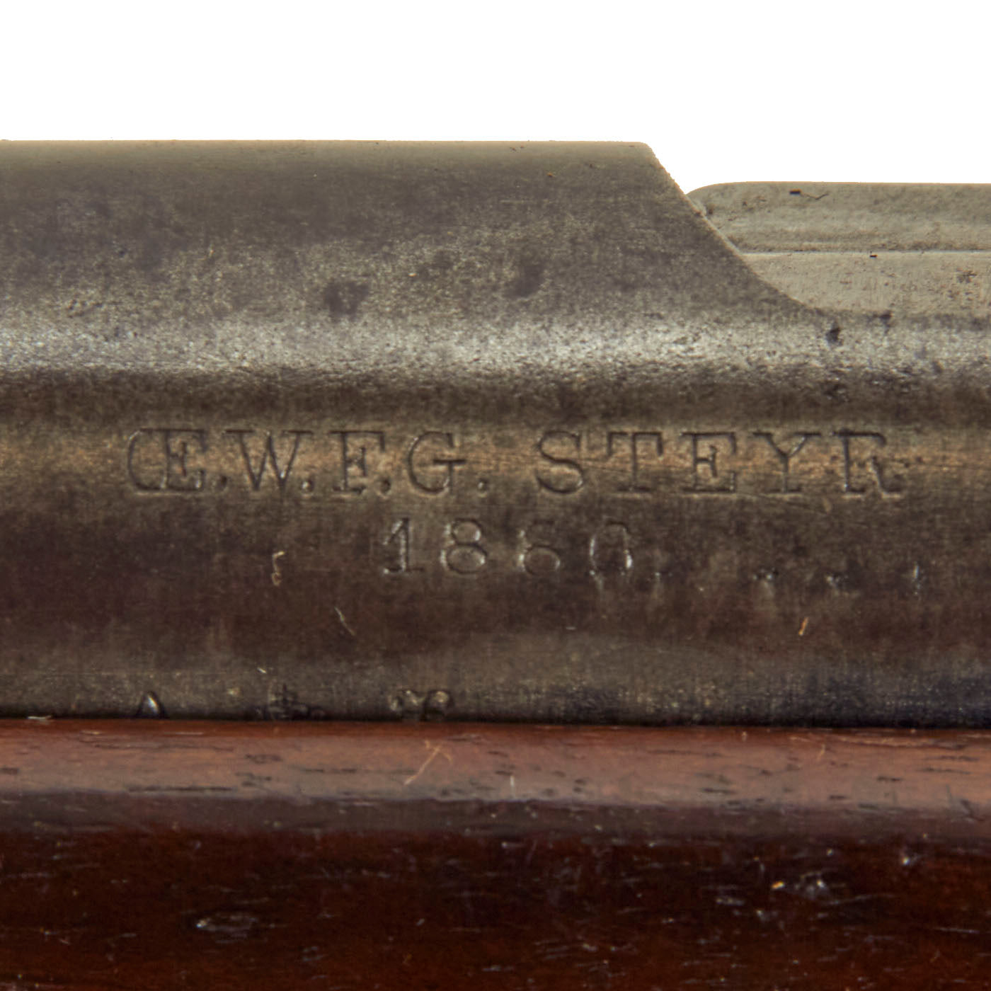 The receiver is marked in the left center with CROWN / L.I., for King LUIS 1st who reigned 1838 until 1889. There is also a matching cartouche stamped left side of the butt stock. The Œ WG STEYR cartouche on the right side of the butt stock is still crisp, and bears an 1886 date.