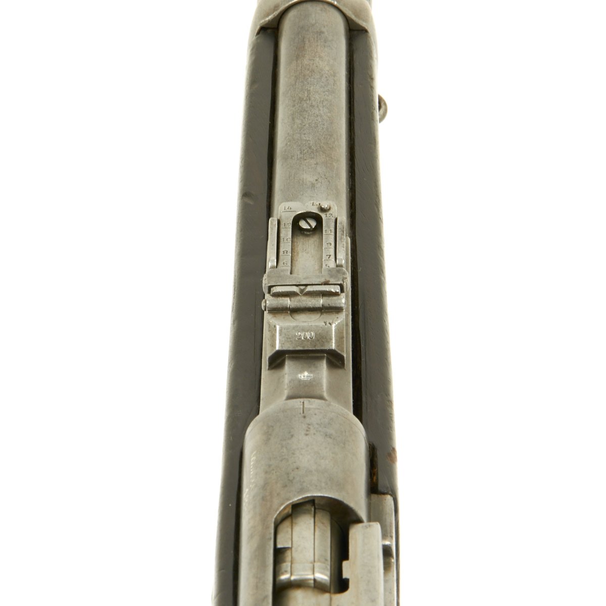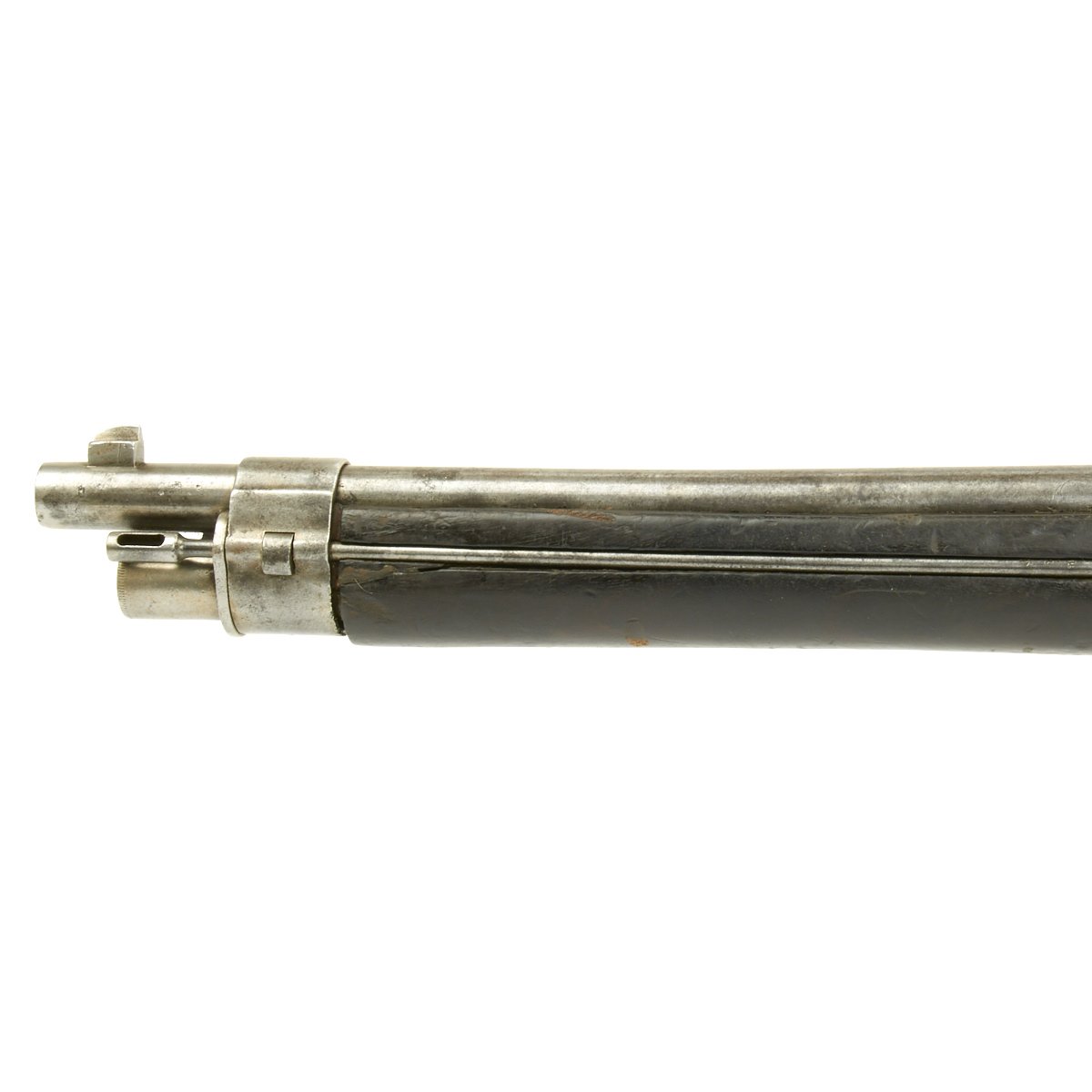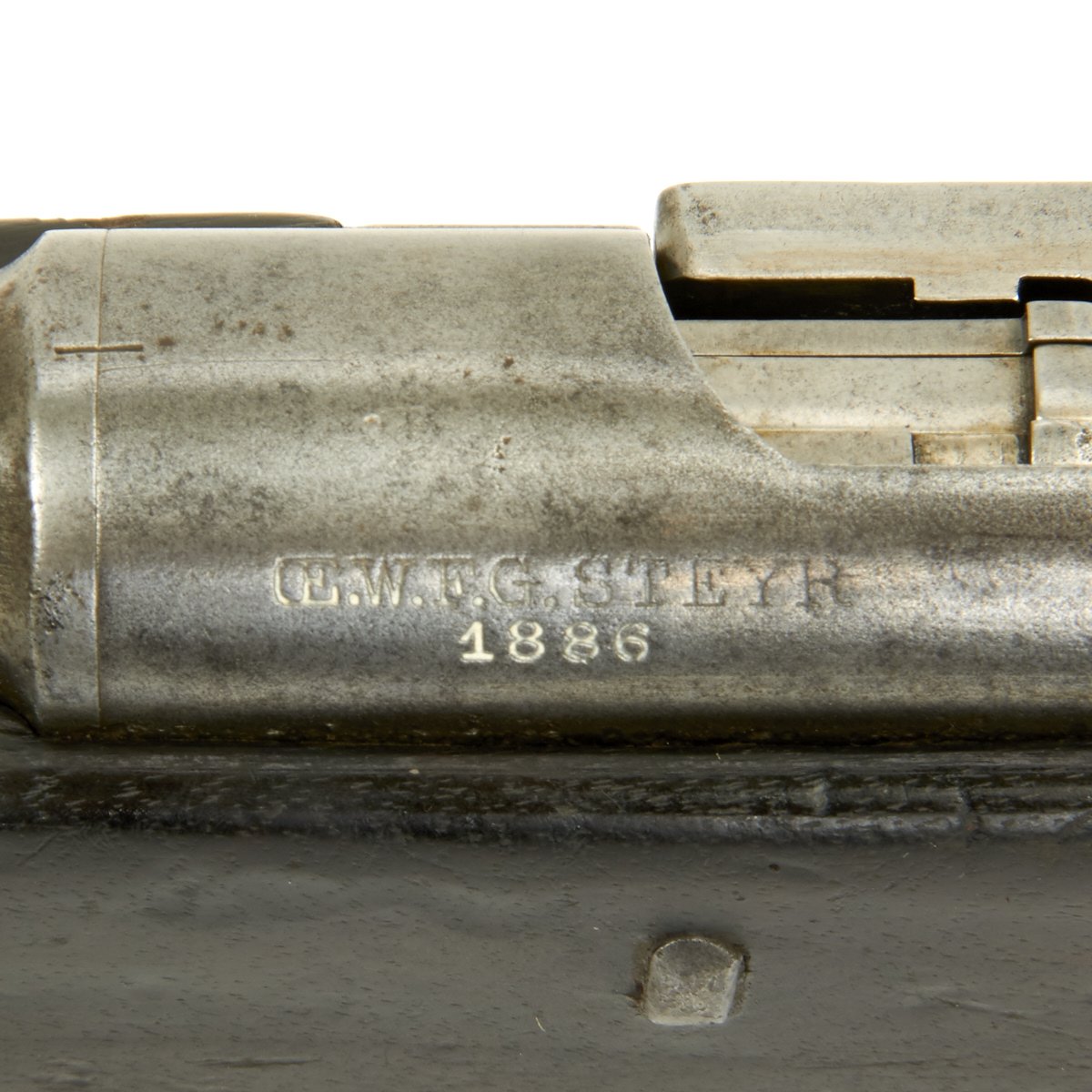 Our example is a Carbine edition fitted with a 20" barrel and was fitted with a full tube magazine under the barrel. Ours is marked M.1886 and :- Œ.W.F.G. STEYR 1886 for Österreichische Waffenfabriksgesellschaft, (ŒWG, Austrian Arms-Manufacturing Company), also commonly referred to as Steyr Werke. Steyr is an Austrian City just outside Vienna and at the time was the home of the entire Austrian arms production. They made Kropatschek rifles under contract for shipment to Portugal.