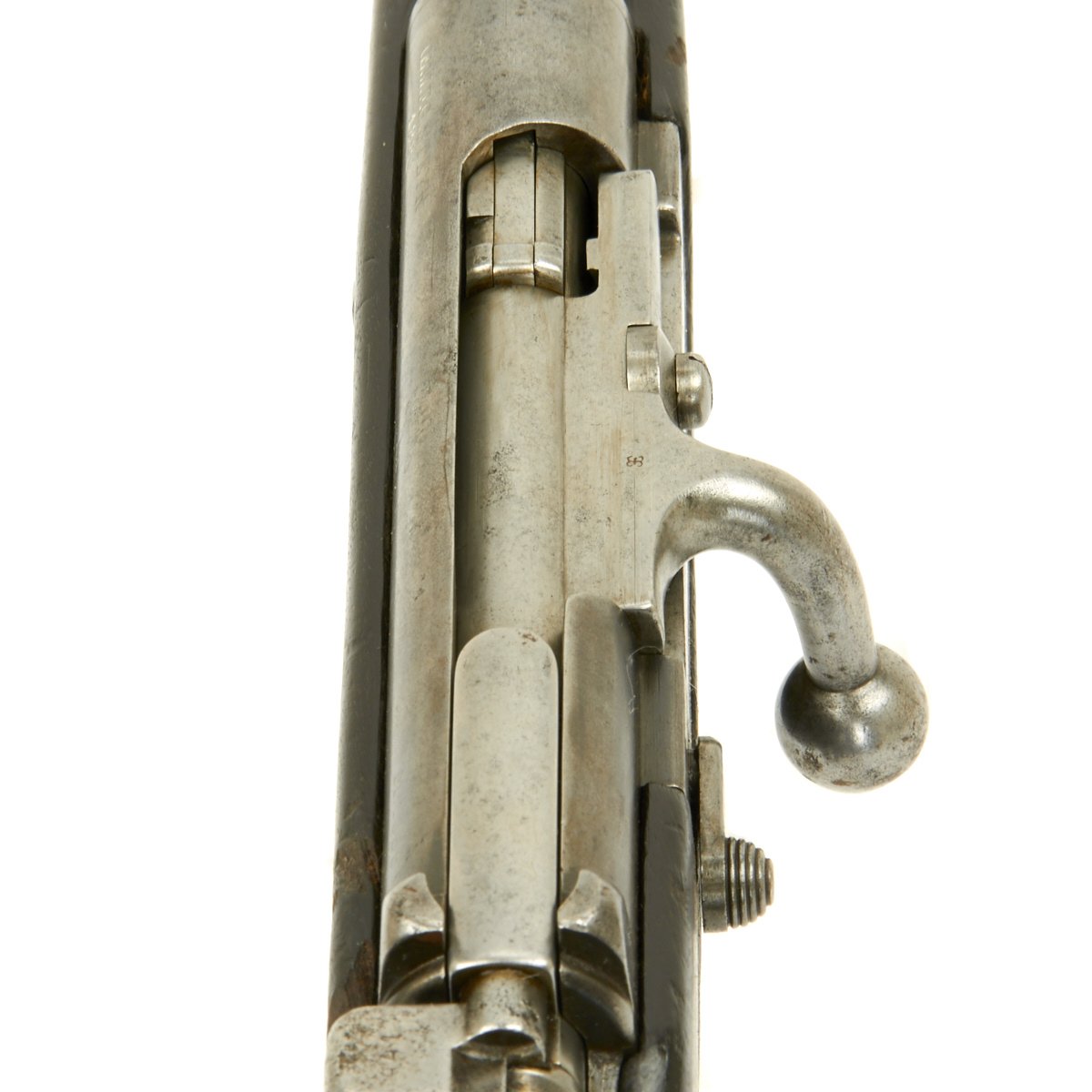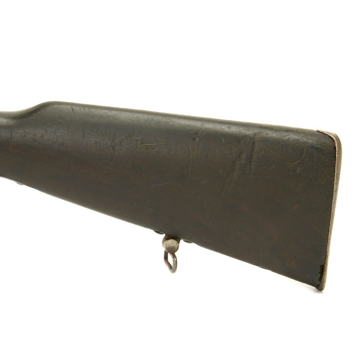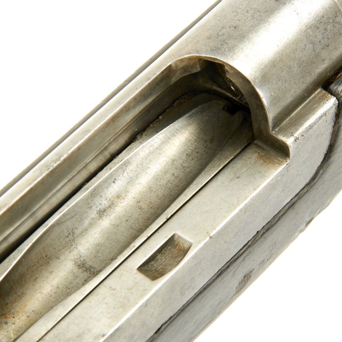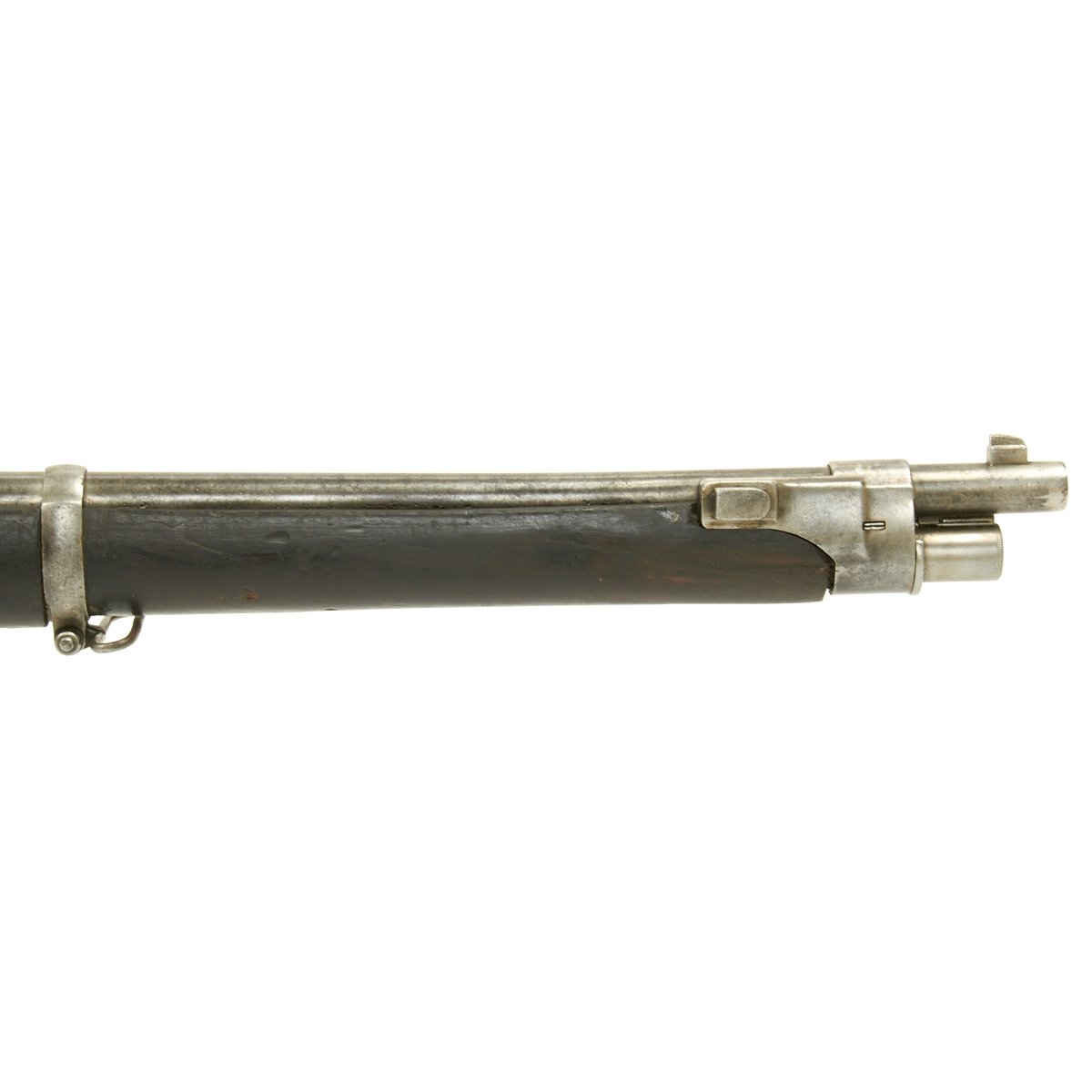 Our example is a Carbine edition fitted with a 20" barrel and was fitted with a full tube magazine under the barrel. Ours is marked M.1886 and :- Œ.W.F.G. STEYR 1886 for Österreichische Waffenfabriksgesellschaft, (ŒWG, Austrian Arms-Manufacturing Company), also commonly referred to as Steyr Werke. Steyr is an Austrian City just outside Vienna and at the time was the home of the entire Austrian arms production. They made Kropatschek rifles under contract for shipment to Portugal.