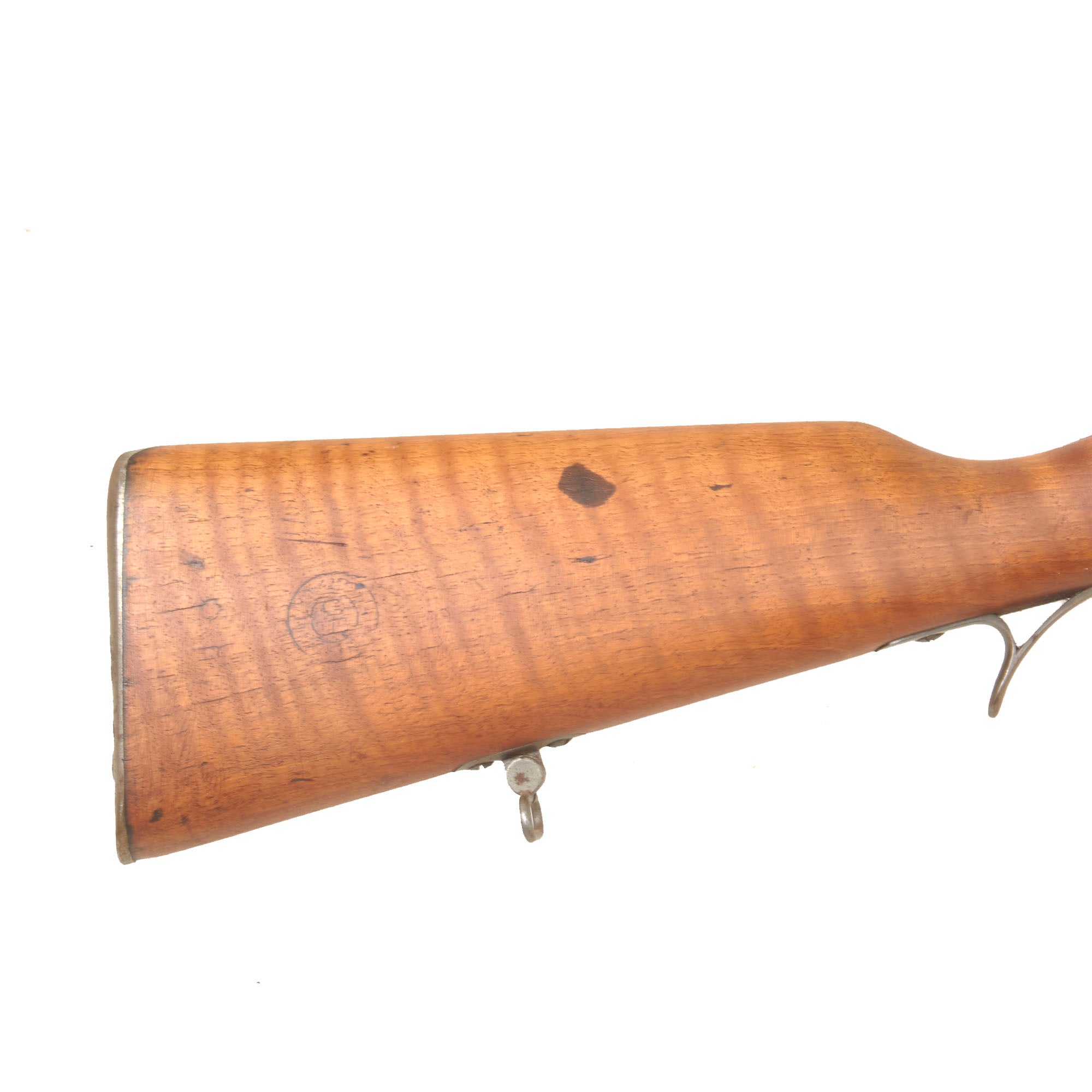 The exterior condition of the wood stock is great, and it has a lovely flame figured grain pattern with a high amount of chatoyancy. It does look like the stock was given a reconditioning at arsenal, which has made the original stock cartouches on both sides faint. There are also the usual small dents, dings, and other signs of use, and there is a small crack on the right side of the stock by the receiver. There are slots cut in the stock next to the barrel, so this stock was outfit for colonial service, but the handguard later removed. The metalwork still retains the blued finish quite well parts of the barrel and receiver, with other components worn to a matte gray patina, particularly on the fittings.