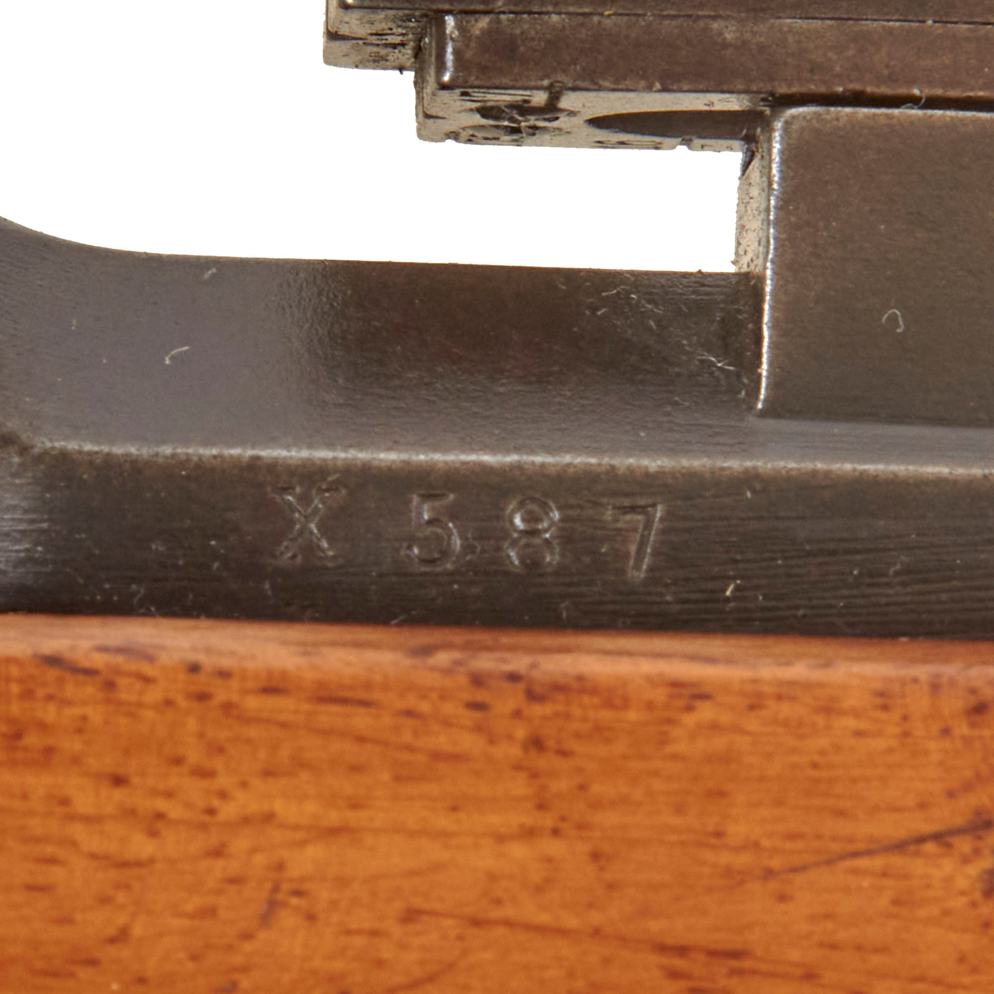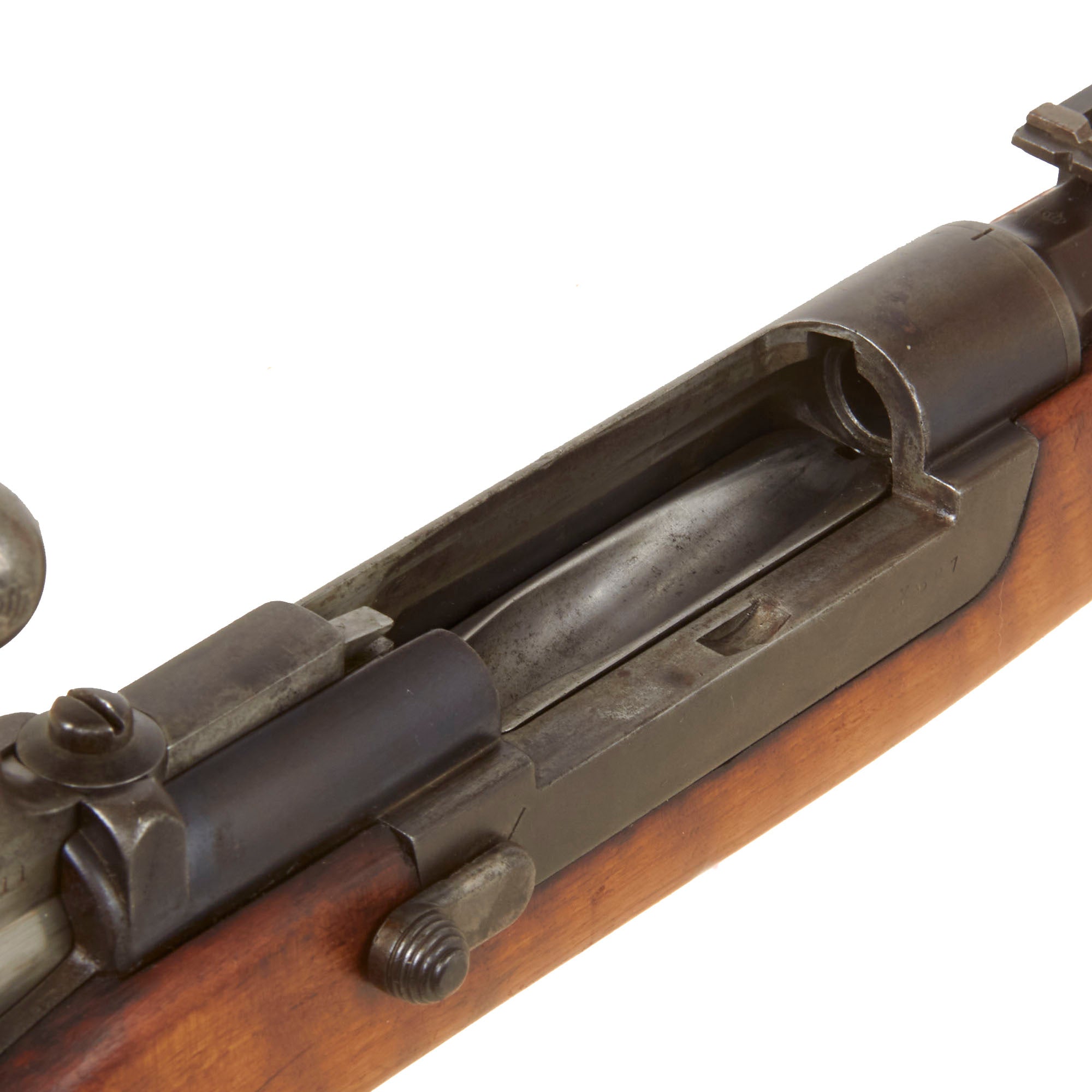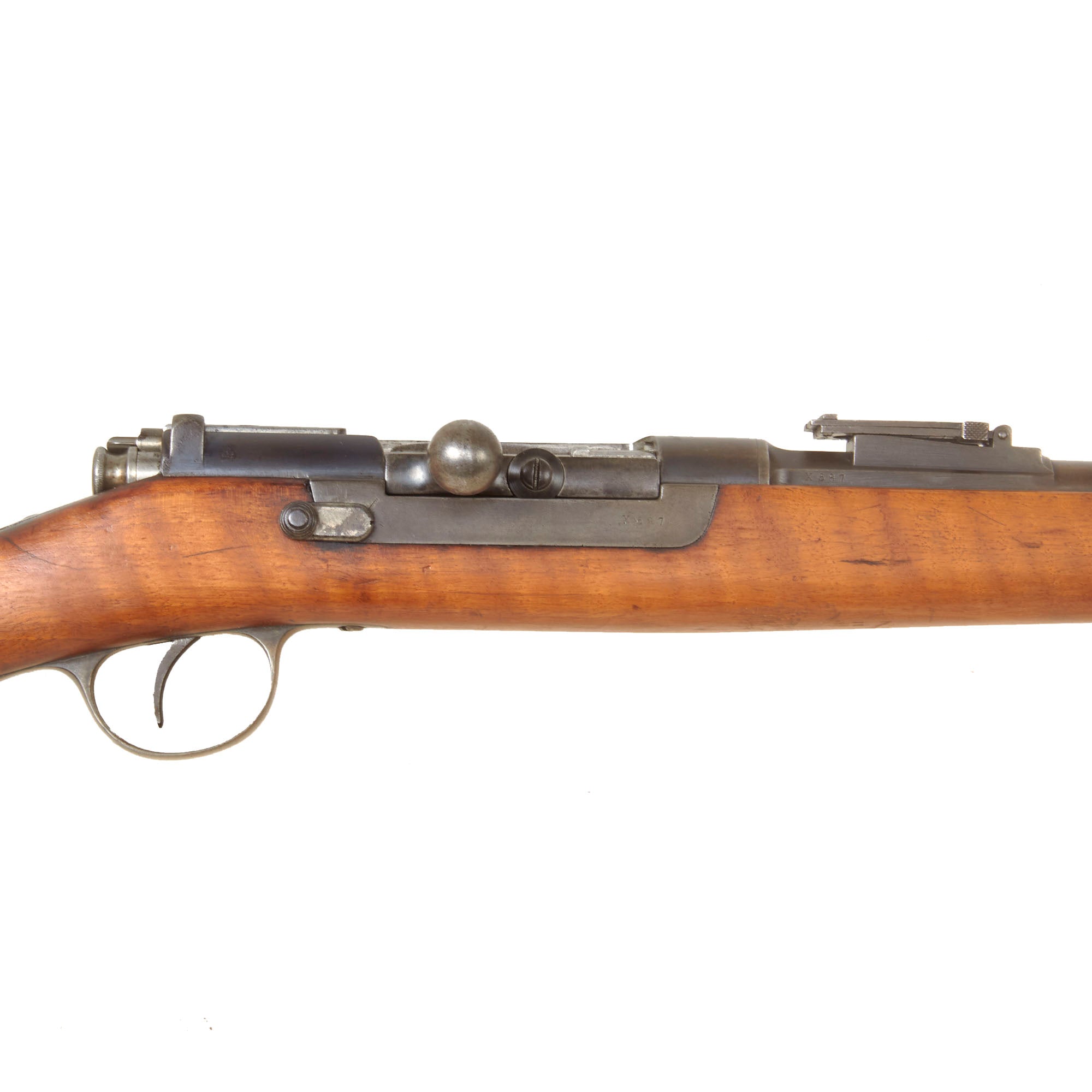 Serial number X587 is marked on the barrel, receiver, while the stock is faintly marked with C714, and the bolt has D811 on all components. Arsenal replacement with parts from several different rifles is a very common thing to see on these rifles, which were in service for some time. The receiver bears a Portuguese Crown over L.I. on the left side, for King LUIS 1st who reigned 1838 until 1889. This rifle still has remnants of both butt stock cartouches, however they are unfortunately too faint to read. Originally the left side would have had a Portuguese Crown over L.I., while the right side would have had an Œ. W. G. Steyr dated rondel.