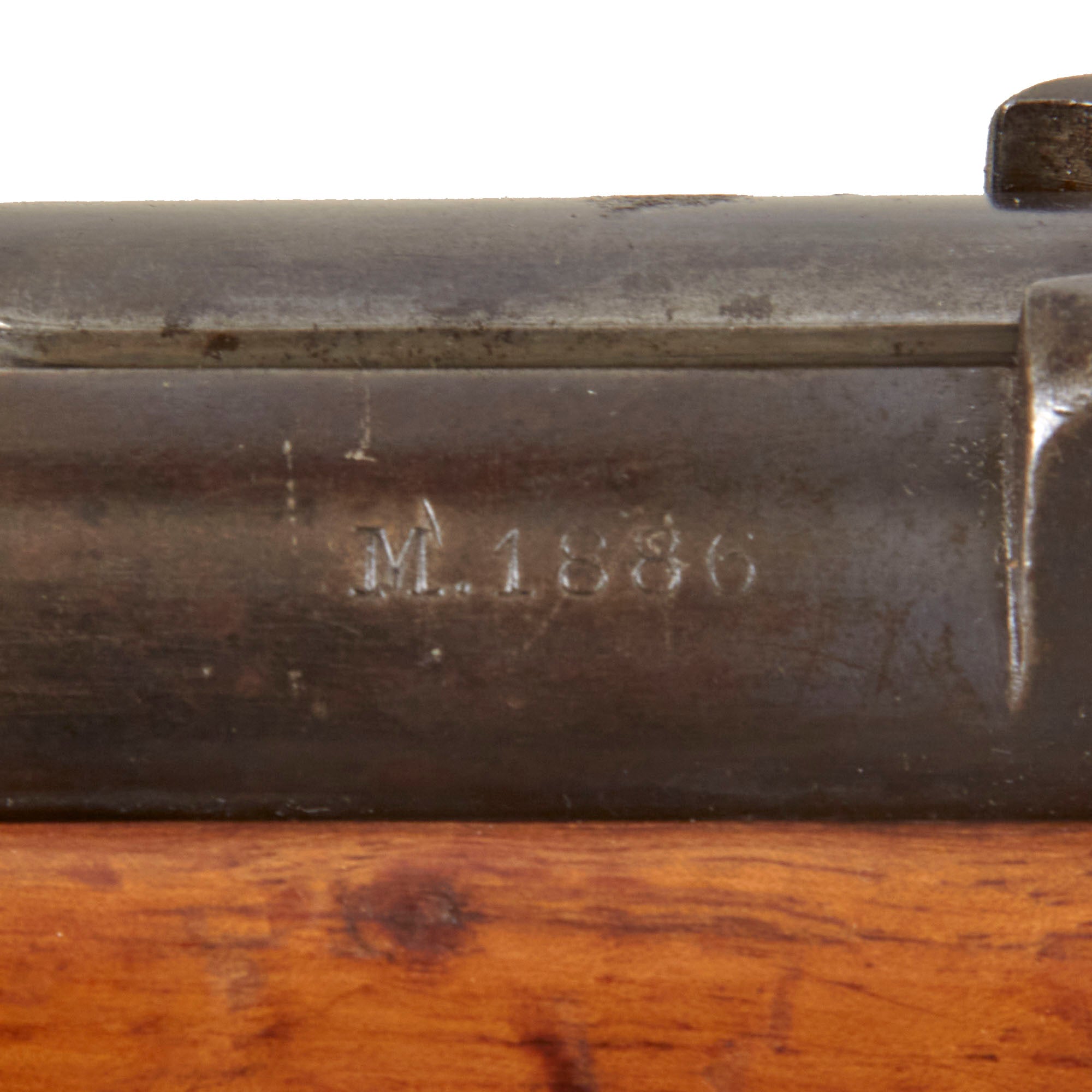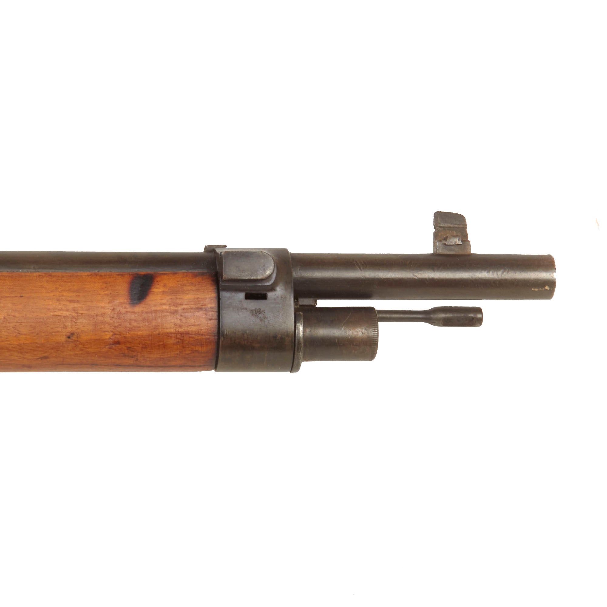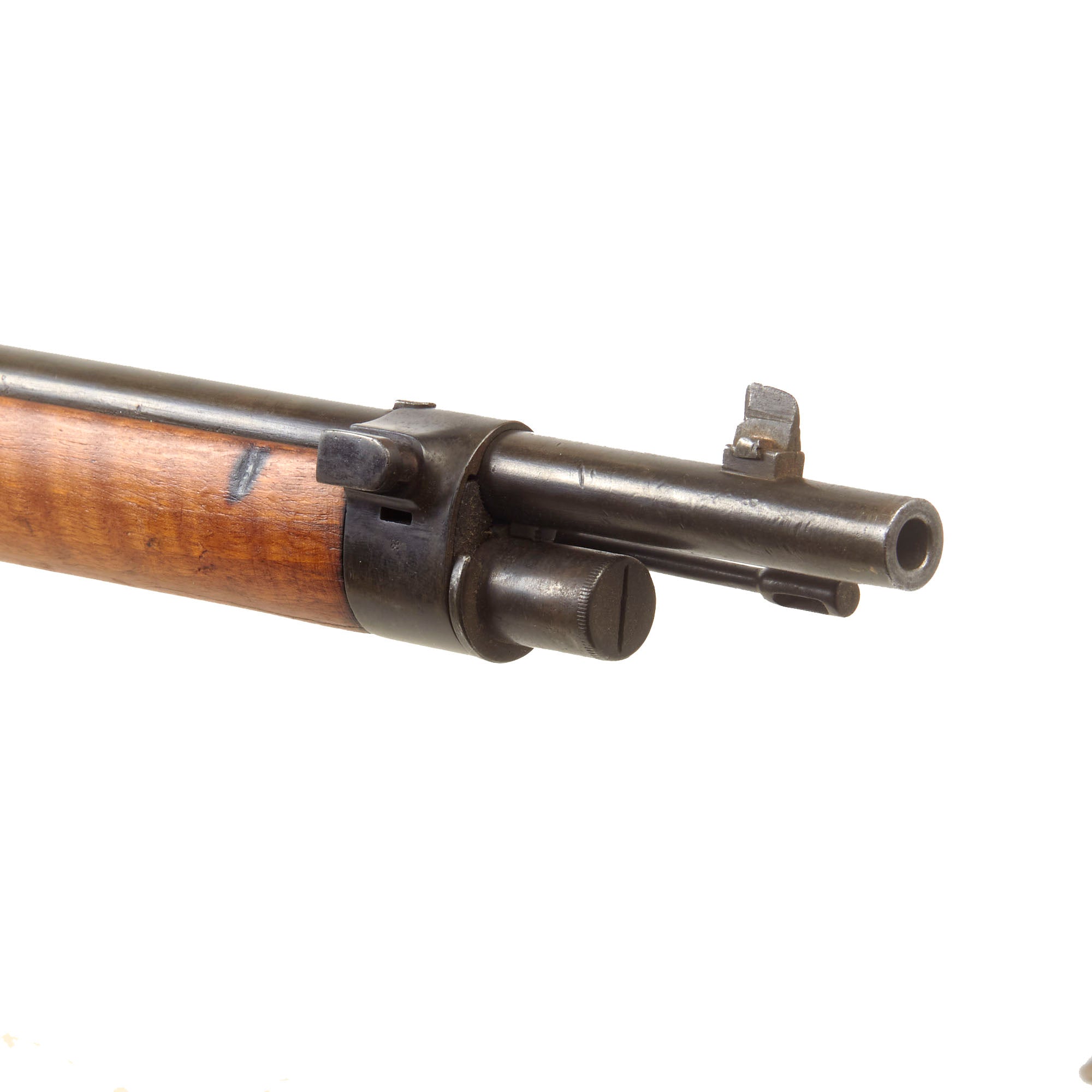 Serial number X587 is marked on the barrel, receiver, while the stock is faintly marked with C714, and the bolt has D811 on all components. Arsenal replacement with parts from several different rifles is a very common thing to see on these rifles, which were in service for some time. The receiver bears a Portuguese Crown over L.I. on the left side, for King LUIS 1st who reigned 1838 until 1889. This rifle still has remnants of both butt stock cartouches, however they are unfortunately too faint to read. Originally the left side would have had a Portuguese Crown over L.I., while the right side would have had an Œ. W. G. Steyr dated rondel.