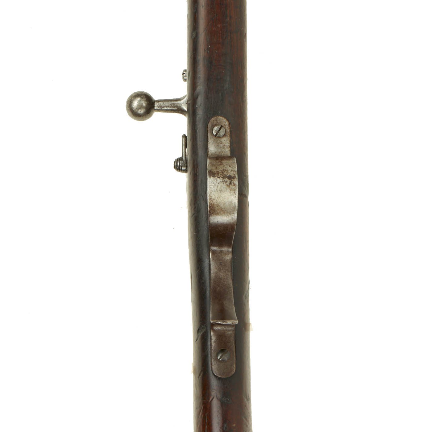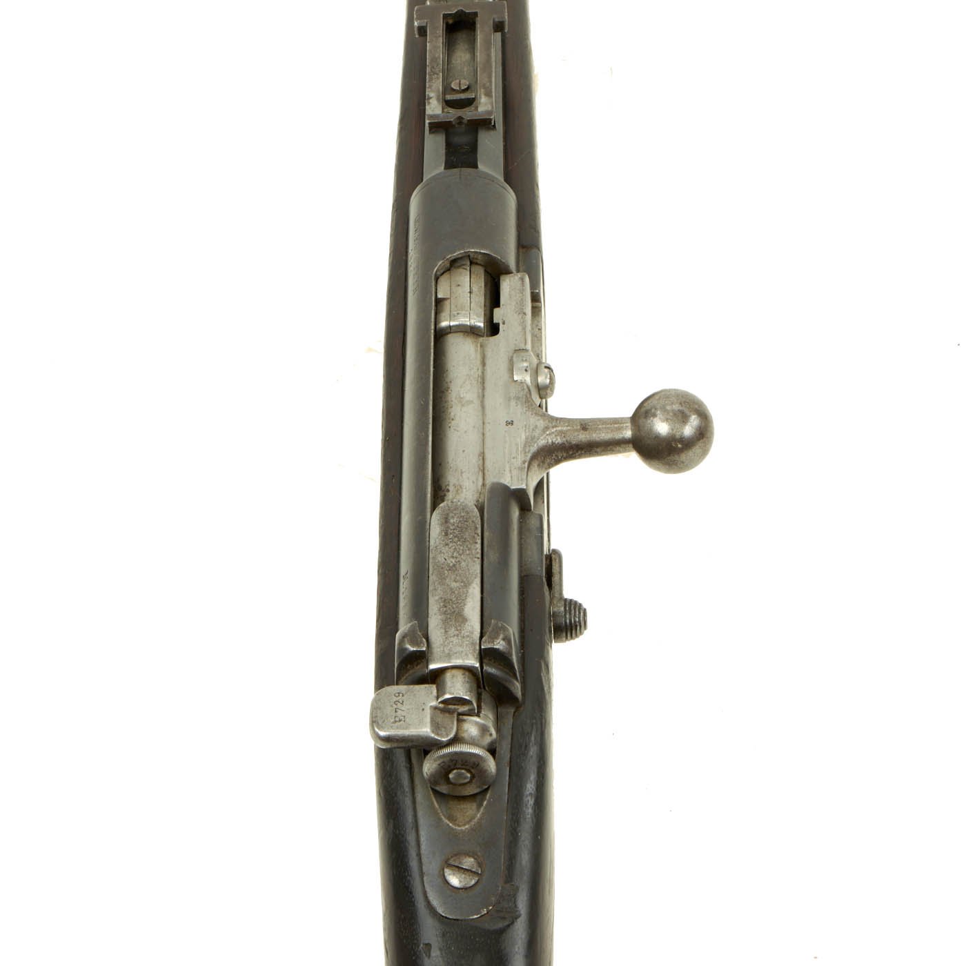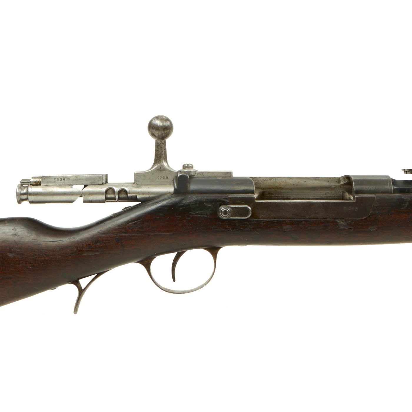 Our example is an excellent condition long rifle version officially designated the Espingarda de Infantaria 8 mm m/1886: 8 mm Infantry Rifle. It is fitted with a 32.3" barrel and a full length 8 round tube magazine under the barrel. Ours is marked on the receiver with M.1886 and :- Œ.W.F.G. STEYR / 1886 for Österreichische Waffenfabriksgesellschaft, (ŒWG, Austrian Arms-Manufacturing Company), also commonly referred to as Steyr Werke. Steyr is an Austrian City just outside Vienna and at the time was the home of the entire Austrian arms production. They made Kropatschek rifles under contract for shipment to Portugal. There is even still the original Steyr cartouche dated 1886 on the right side of the butt stock.