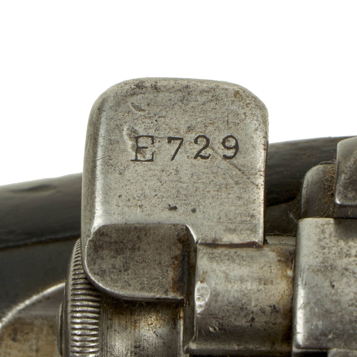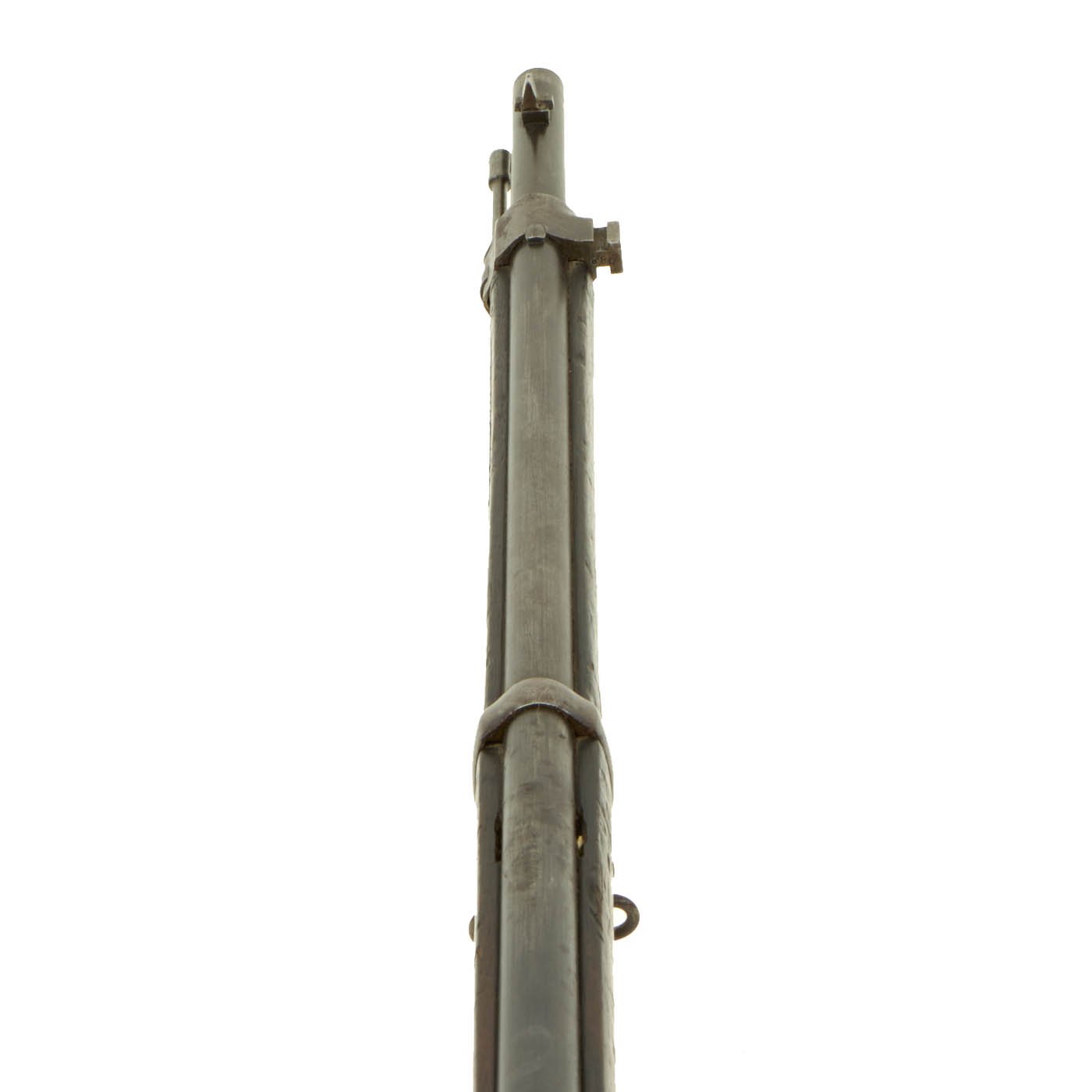 Serial number E385 is marked on the barrel and receiver, while the marking on the stock is MM404. The bolt is an arsenal replacement marked E729 and JJ902, very common to see on these rifles, which were in service for some time. Interestingly, there is no royal cypher on the receiver, which would usually be marked for King LUIS 1st who reigned 1838 until 1889. This may have been removed by cleaning and servicing, or maybe when sold out of service.